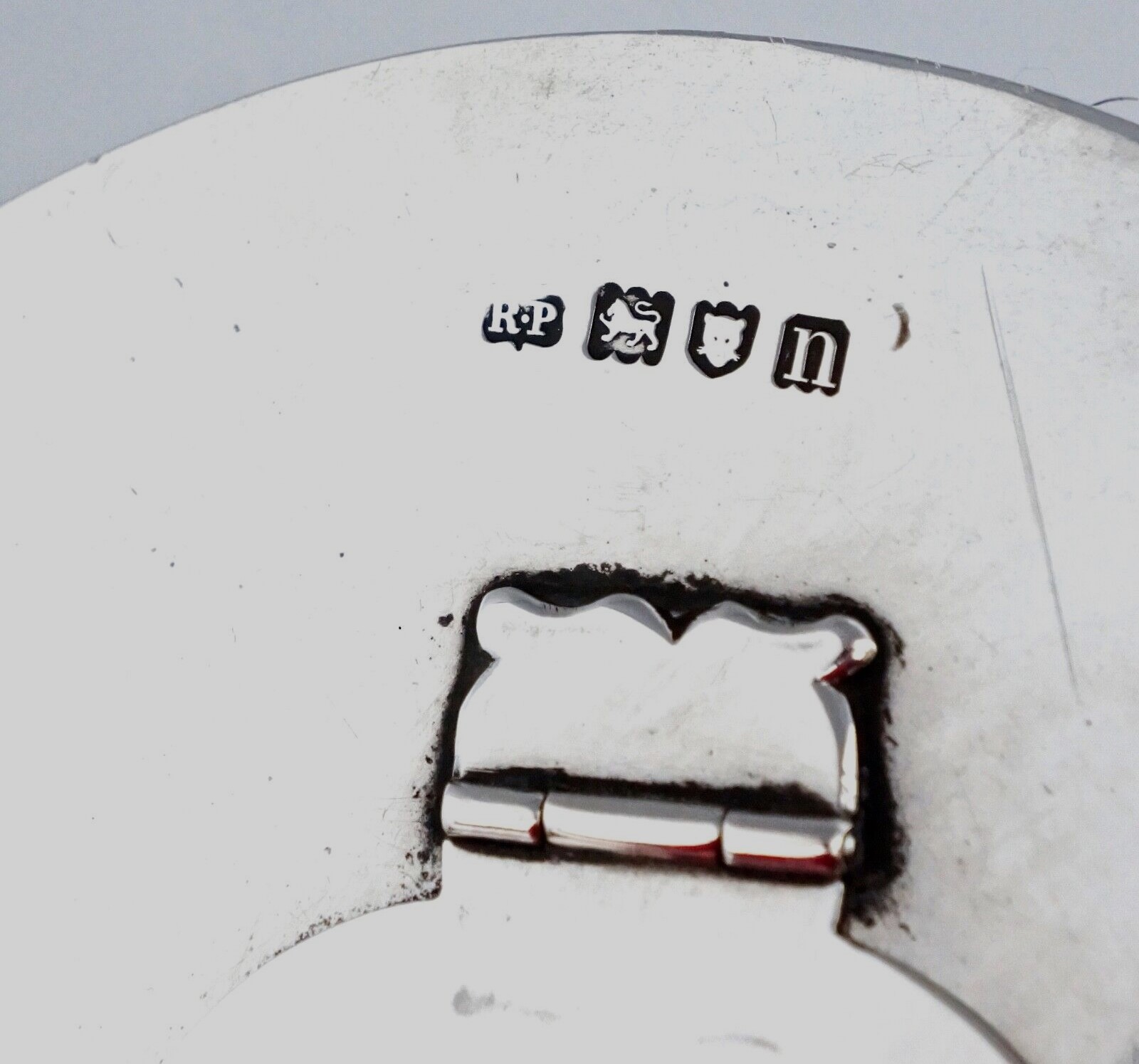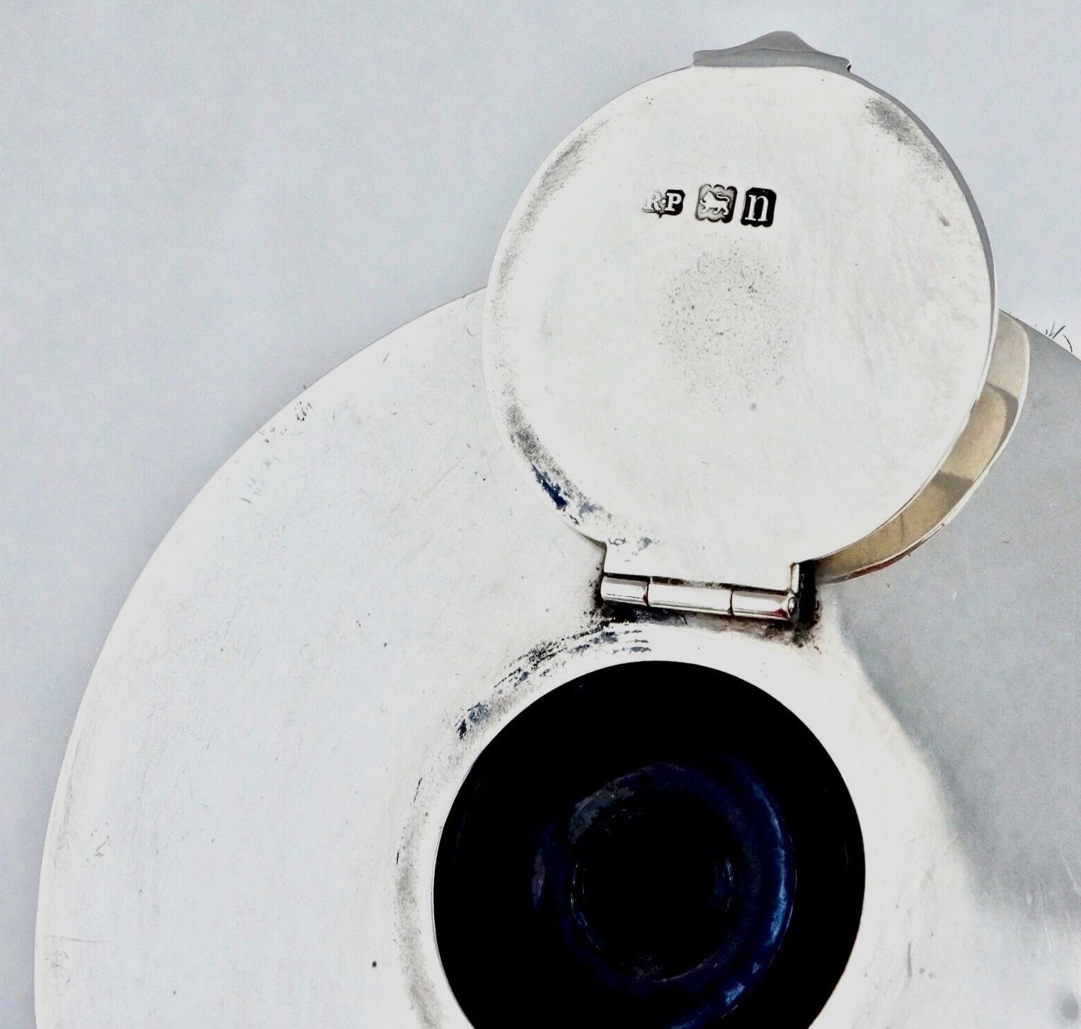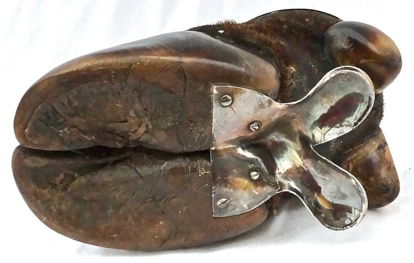 Unusual solid silver mounted bull’s hoof which has been converted to an inkwell with an original blue glass insert. Horse hooves were commonly converted into inkwells in Victorian & Edwardian times, but bulls’ hooves are much rarer. Both upper silver fittings are hallmarked for London 1908 by Robert Pringle & Sons. The silver stand fitted to the base is silverplated.