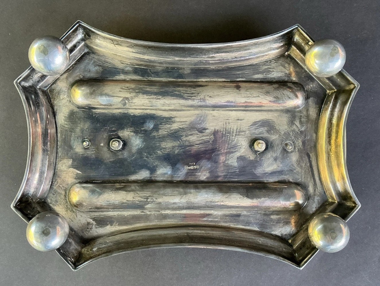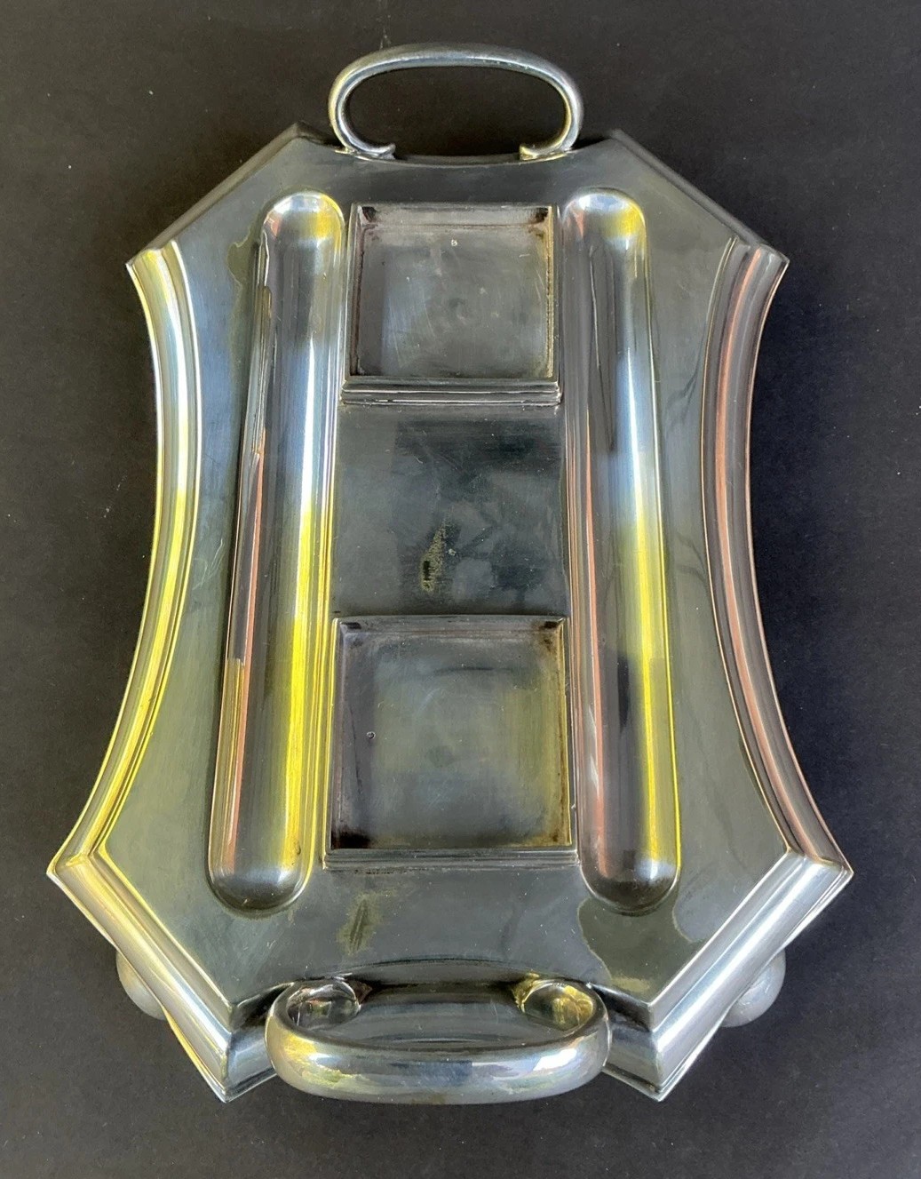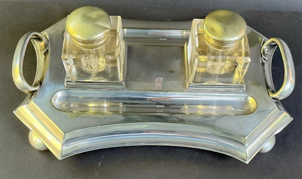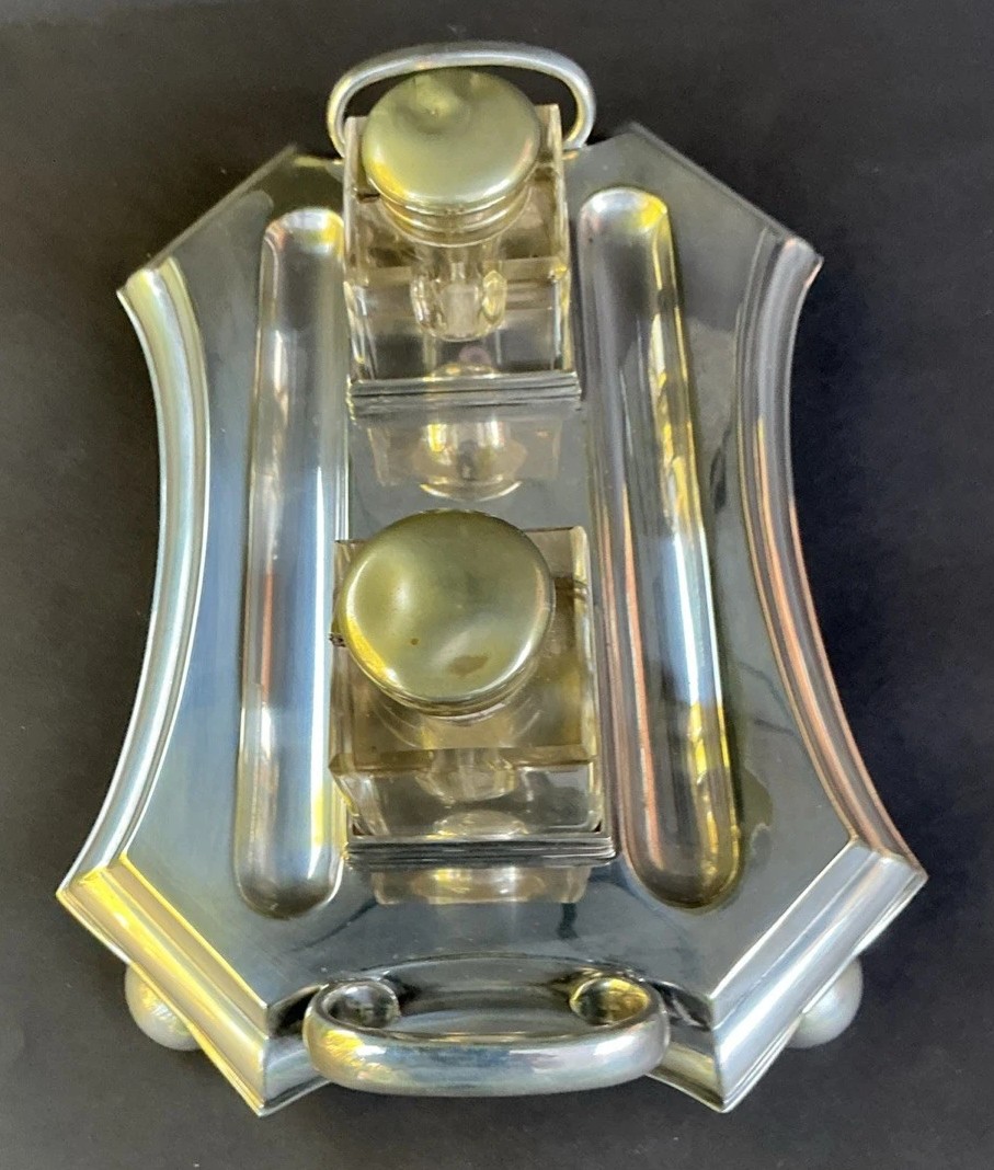 • Base and Tray: The inkstand sits on a silver-plated tray with a distinctive, slightly curved, and scalloped shape. It has two large handles, one on each end, and rests on four spherical or “bun” feet. The top surface of the tray has recessed areas for holding the ink bottles. There are two long, recessed channels for holding pens.
