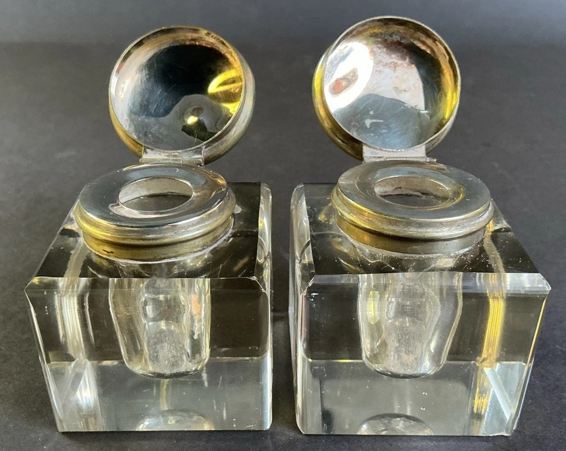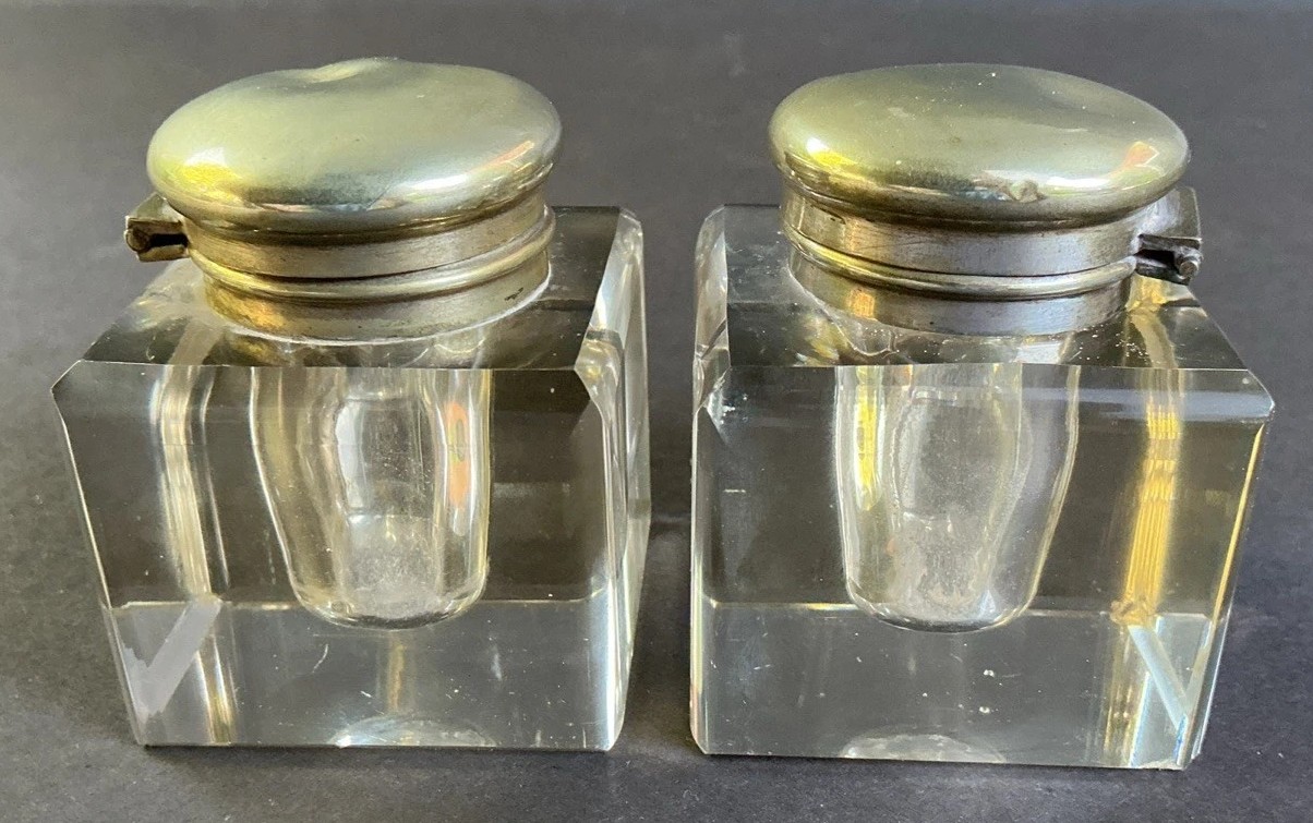 • Lids: Each glass inkwell is topped with a hinged, dome-shaped lid made of a silver-colored metal.