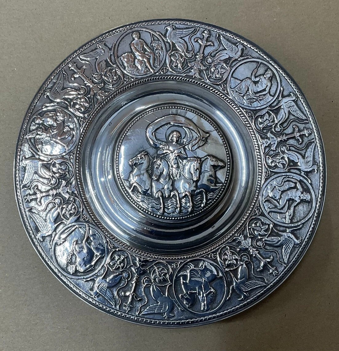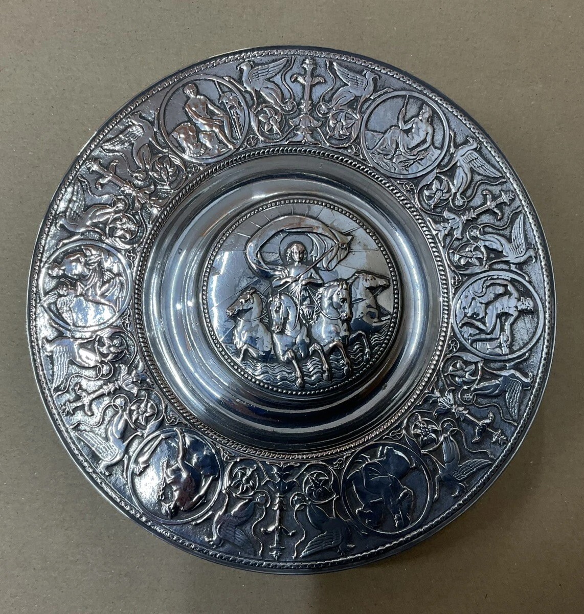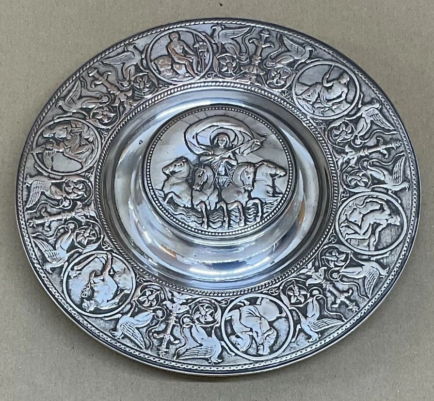 - Scene: The hinged lid features a detailed repoussé or cast image of Aurora, the Roman goddess of dawn, driving her chariot with four horses. The scene depicts her emerging from the dawn, bringing forth the new day.