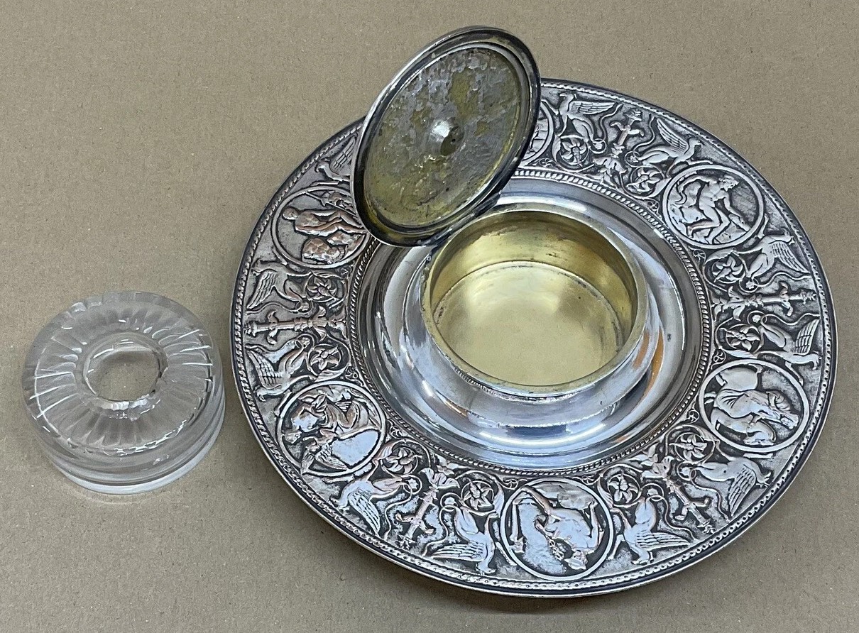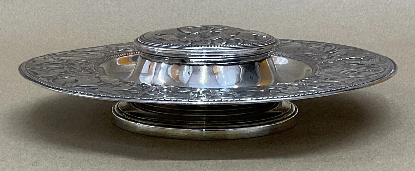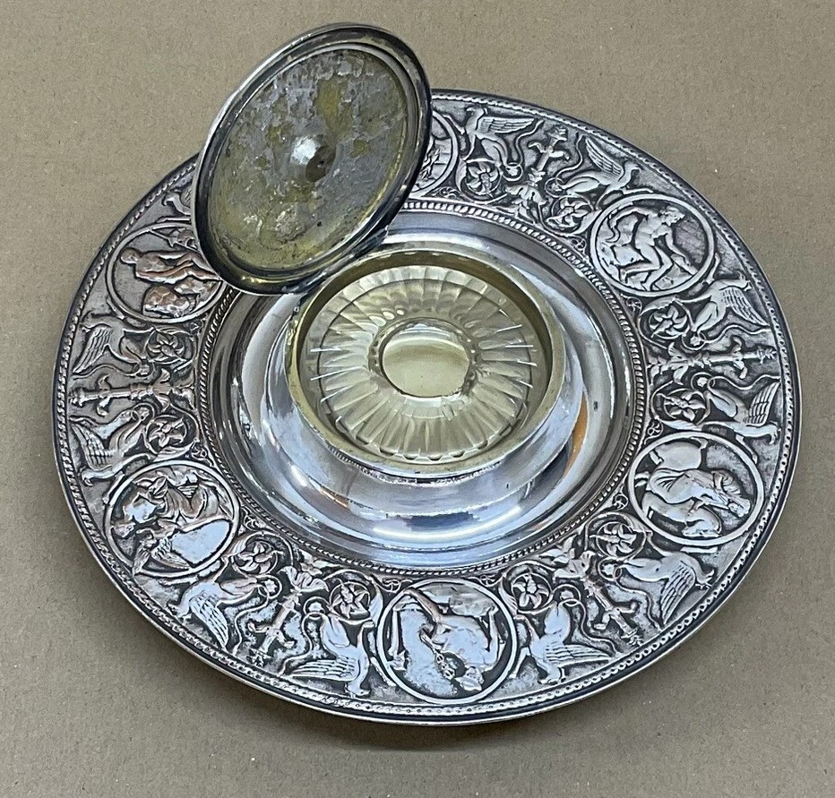 - Form: The inkwell is circular in shape, resembling a shallow dish or plate. It features a raised, central section that houses the inkwell.