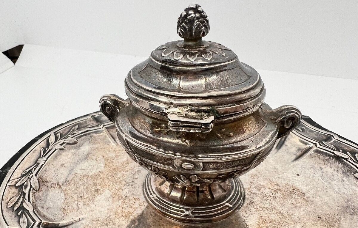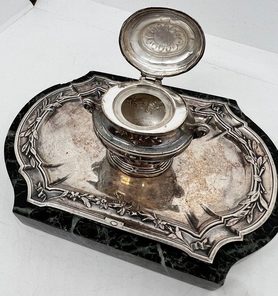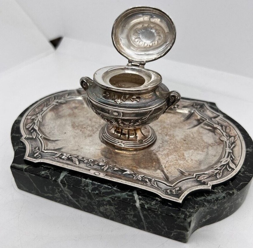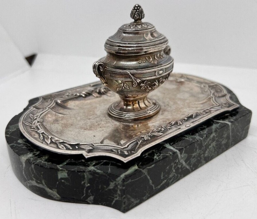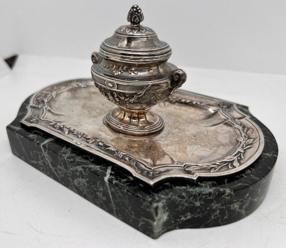 This inkwell shaped as a classical urn has a hinged lit with a pineapple finial. It is stamped with the French Minerva hallmark and rests on a base made of green marble.