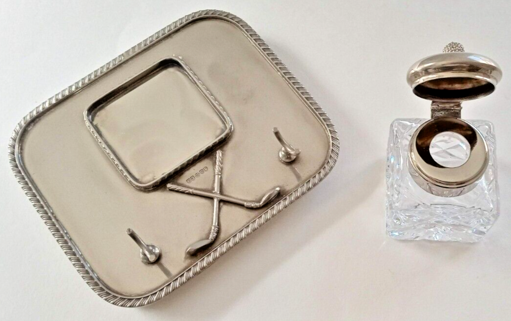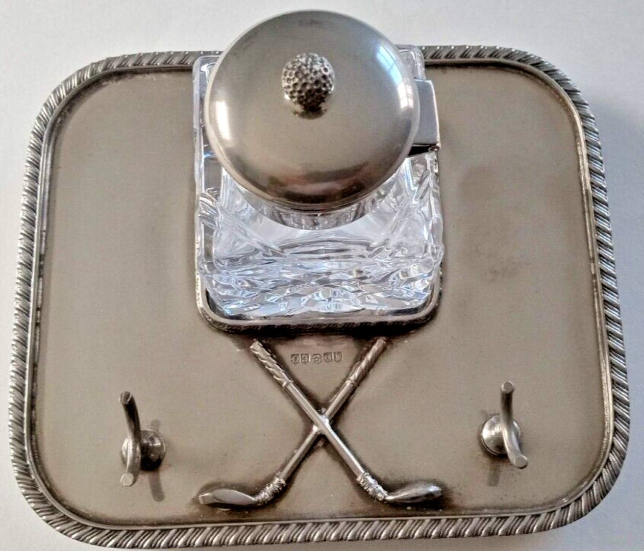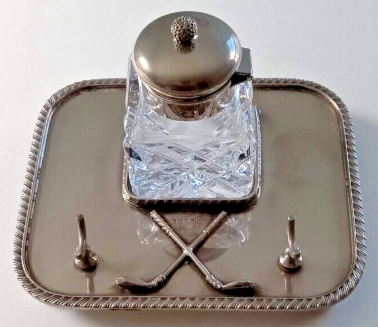 A silverplated base with ball feet and an ornate border holds a cut glass diamond patterned inkwell with a hinged silver lid. In front of the inkwell are two golf clubs crossed and a pen holder. The inkstand has impressed English marks.