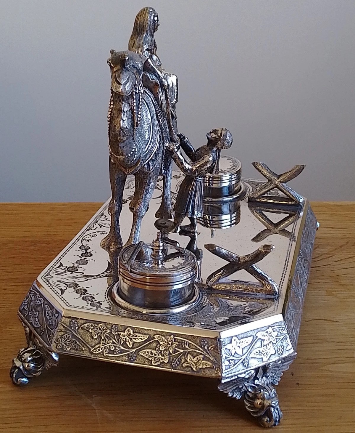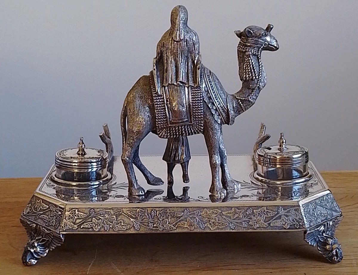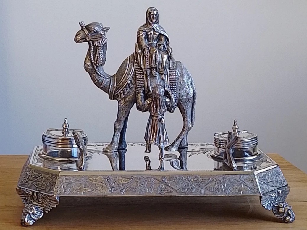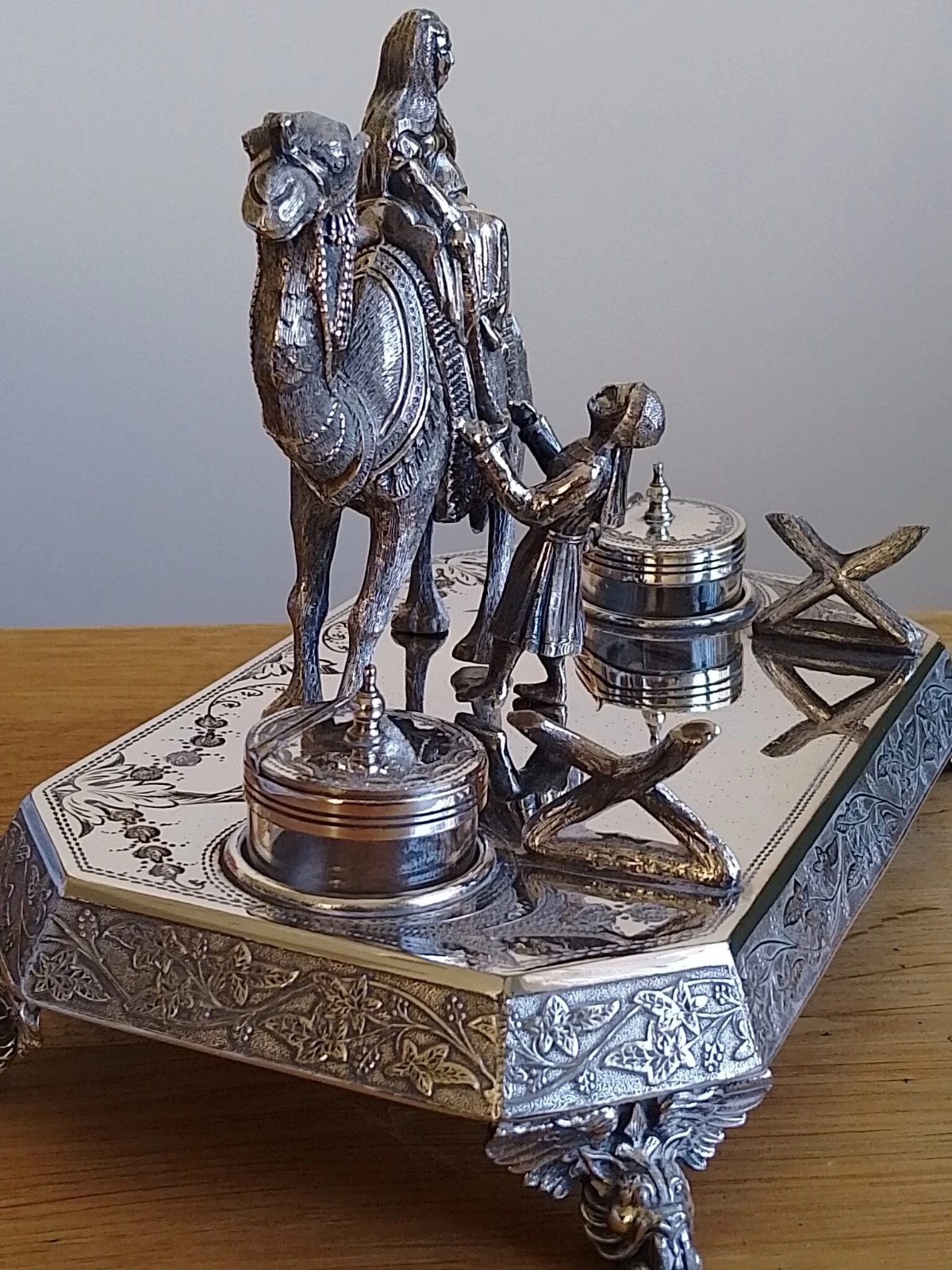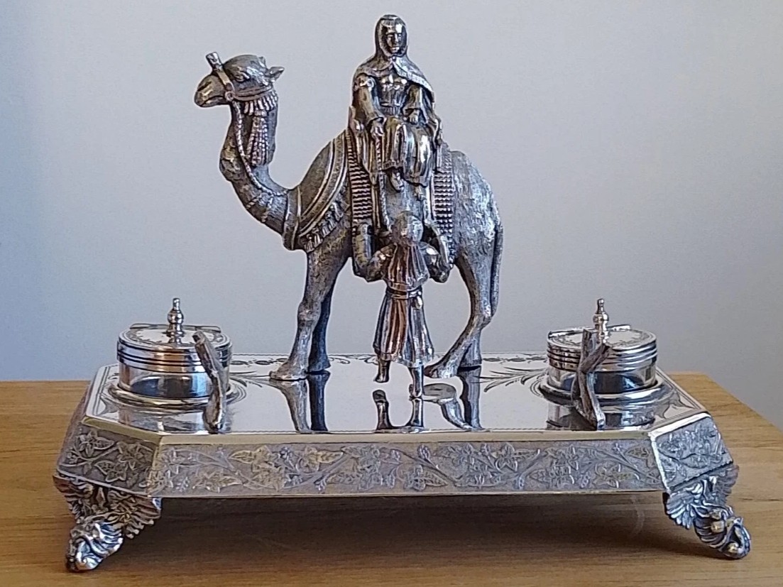 The combination of the Orientalist subject matter (the camel and rider) and the specific “lion-head” feet and “ivy-leaf” apron are classic hallmarks of the Late Victorian or early Edwardian era. During this time, there was a significant fascination with the “Exotic East,” and James Deakin & Sons were well-known for producing elaborate, figural desk sets that served as both functional items and conversation pieces for wealthy Victorian households.
