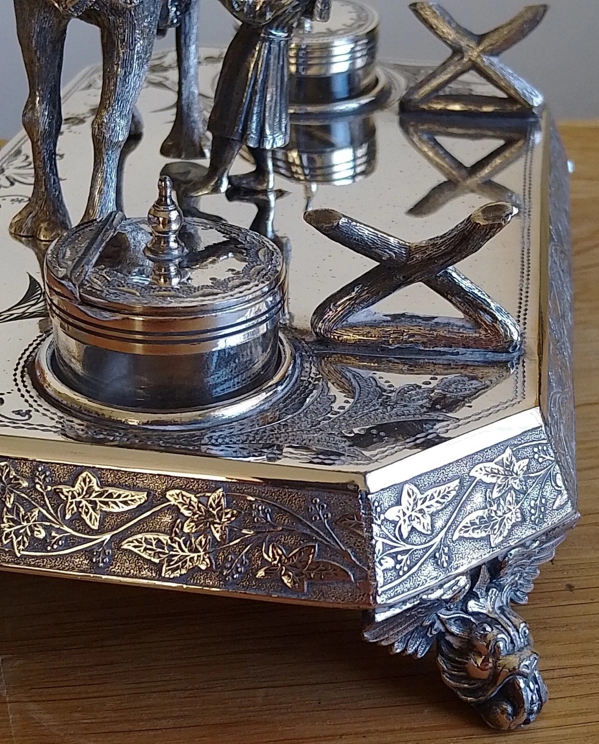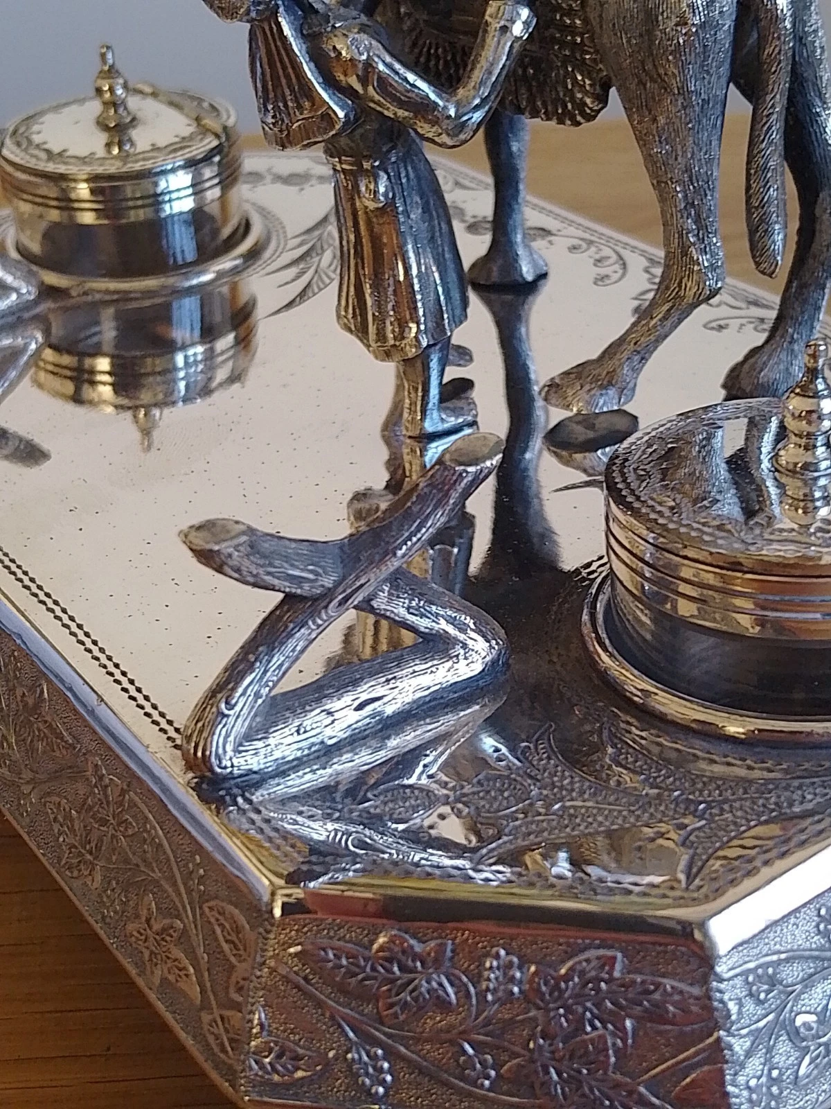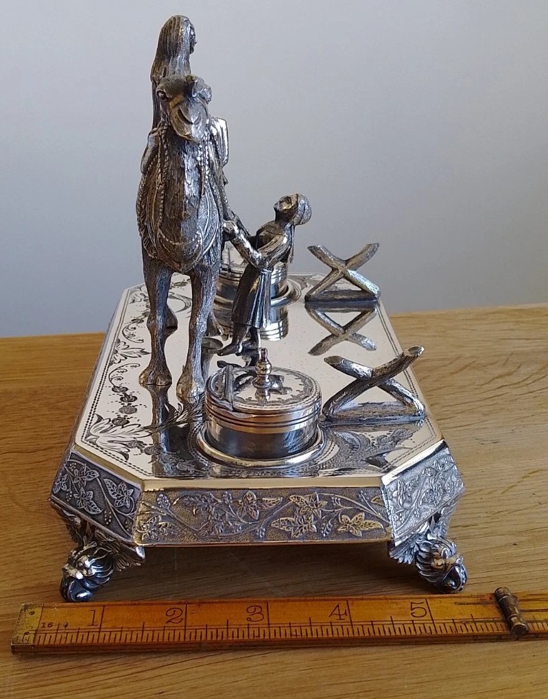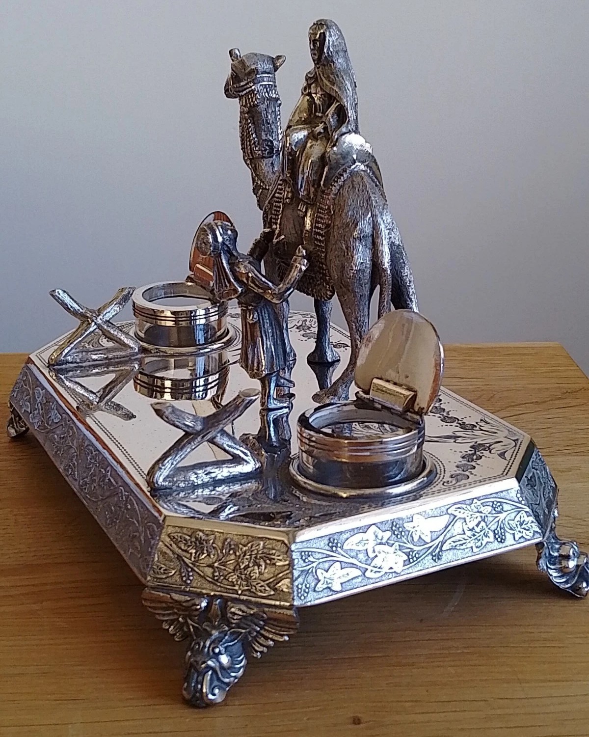 The combination of the Orientalist subject matter (the camel and rider) and the specific “lion-head” feet and “ivy-leaf” apron are classic hallmarks of the Late Victorian or early Edwardian era. During this time, there was a significant fascination with the “Exotic East,” and James Deakin & Sons were well-known for producing elaborate, figural desk sets that served as both functional items and conversation pieces for wealthy Victorian households.
