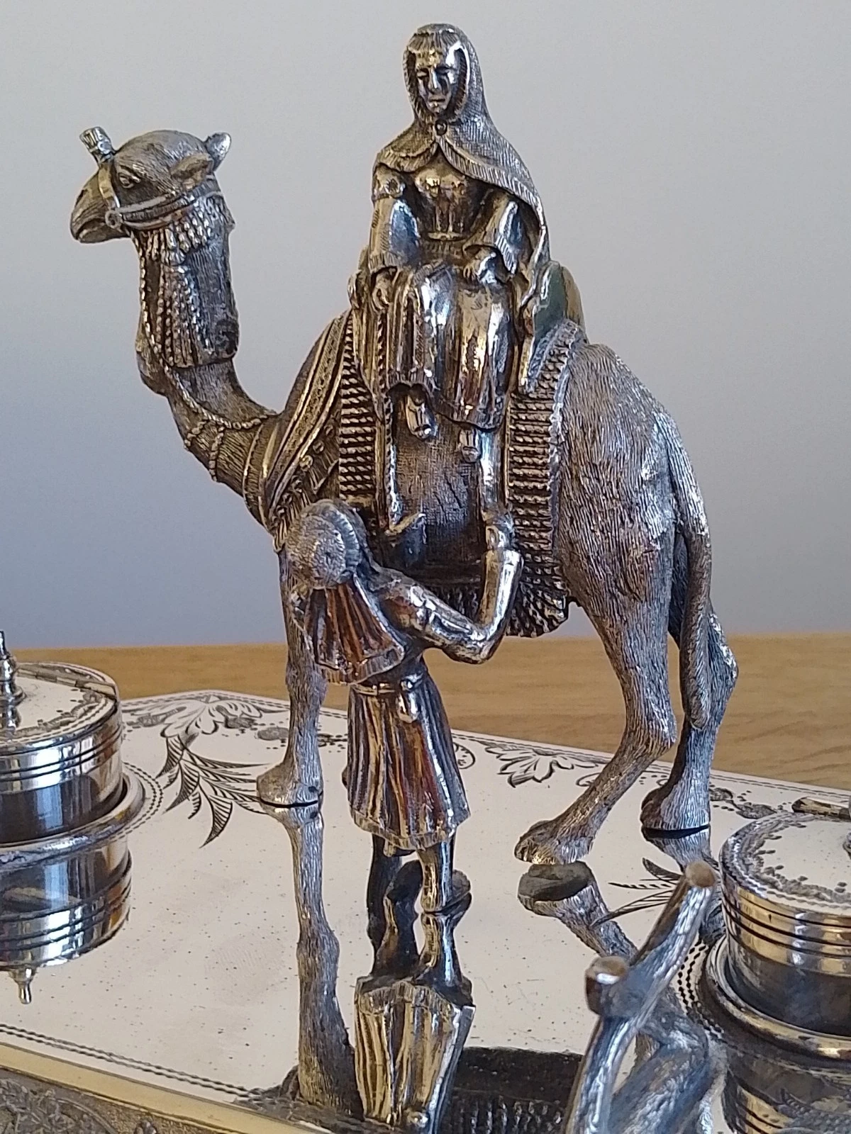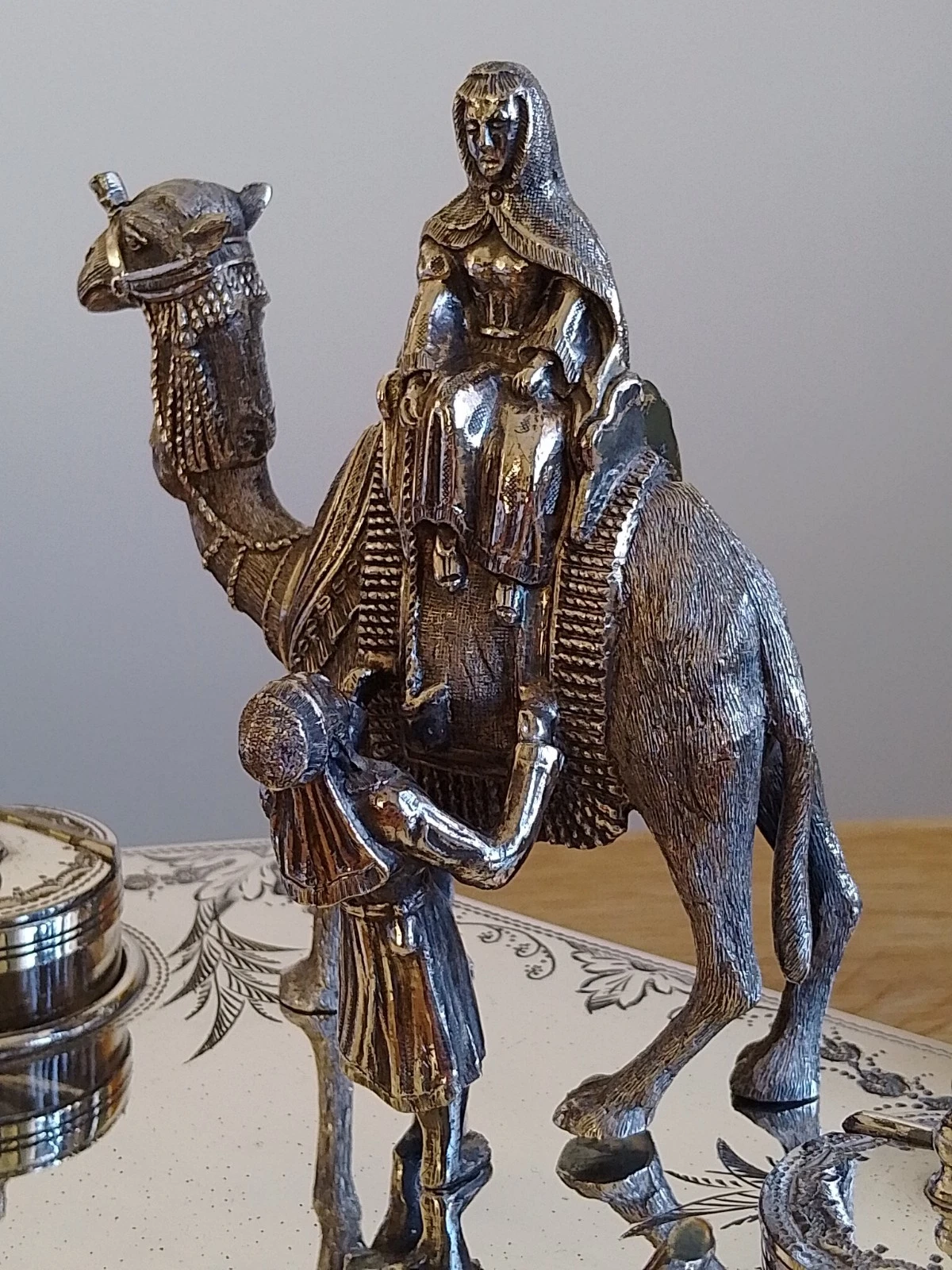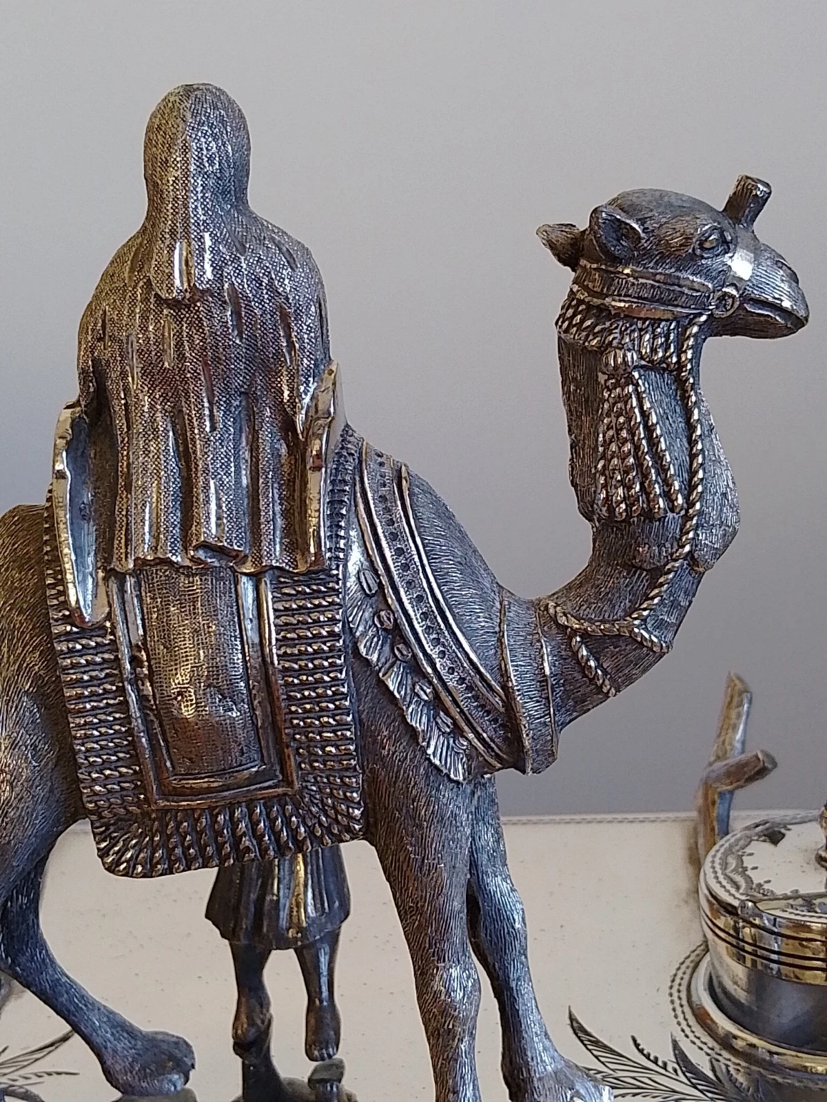 - The Figural Group: The centerpiece features a detailed, cast silverplate camel standing in a stationary pose. A rider, representing a Middle Eastern traveler or Bedouin, sits atop a traditional saddle. A second figure—an attendant or servant—stands beside the camel, reaching up to assist the rider. The textures of the camel’s fur, the draped clothing of the figures, and the decorative harness are finely rendered.