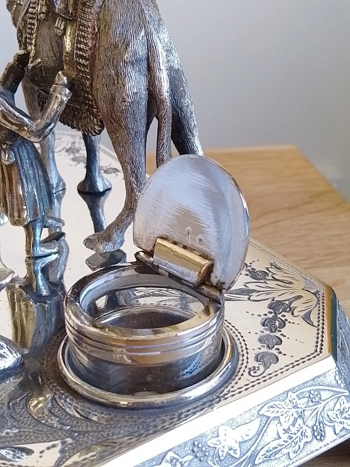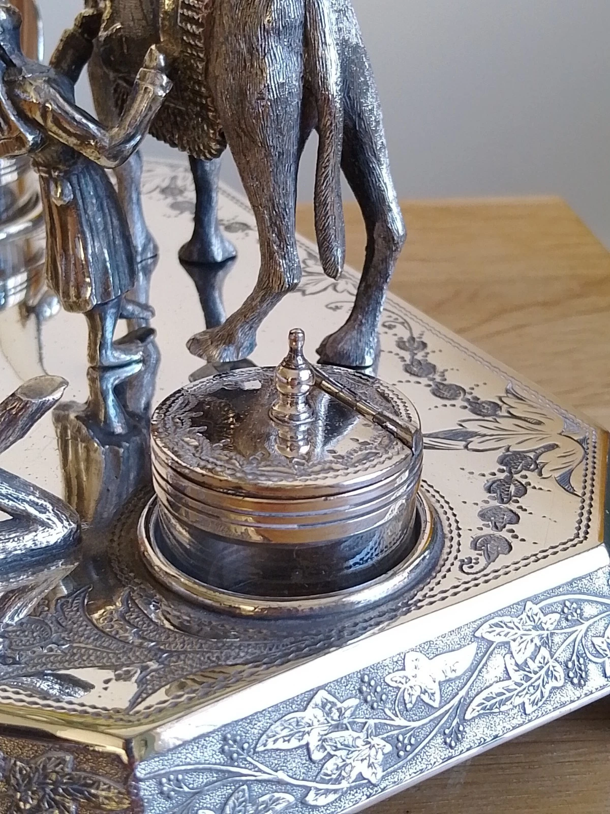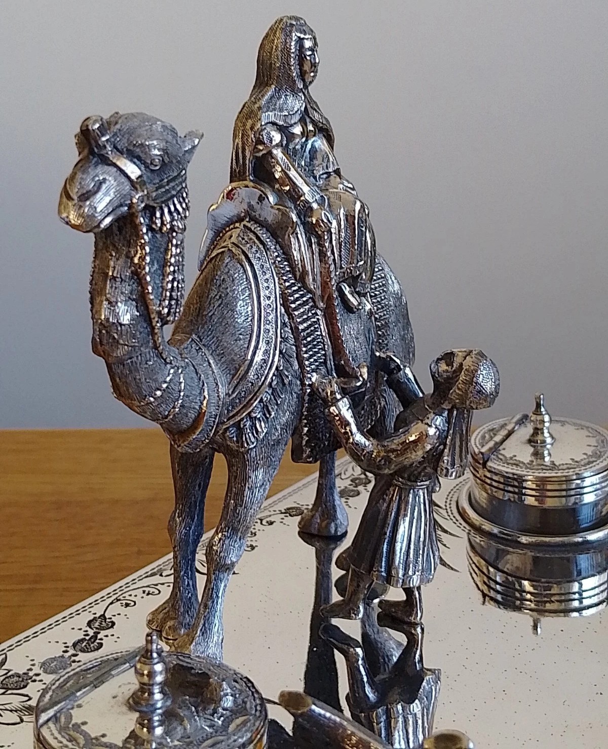- The Figural Group: The centerpiece features a detailed, cast silverplate camel standing in a stationary pose. A rider, representing a Middle Eastern traveler or Bedouin, sits atop a traditional saddle. A second figure—an attendant or servant—stands beside the camel, reaching up to assist the rider. The textures of the camel’s fur, the draped clothing of the figures, and the decorative harness are finely rendered.