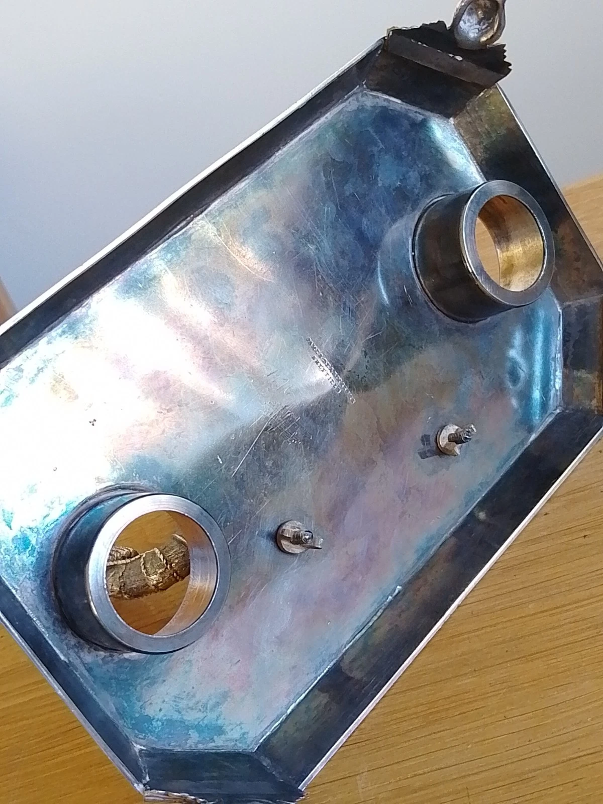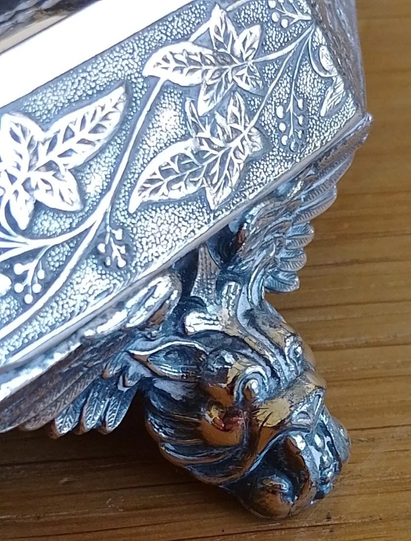 - The Base: The rectangular base has truncated corners and a highly reflective, polished top surface. It is bordered by an engraved floral and foliate pattern. The sides (aprons) of the base are decorated with a repoussé or chased design of ivy leaves and berries.
