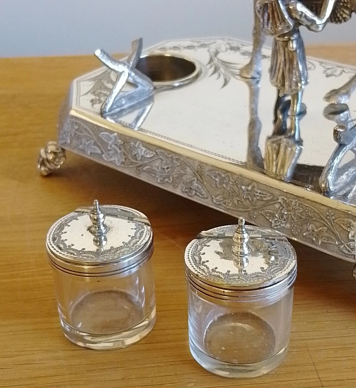 - The Inkwells: The set includes two circular, clear cut-glass inkwells. They are fitted with silverplate collars and hinged, domed lids. The lids feature delicate engraved scrollwork and are topped with small, tiered finials.