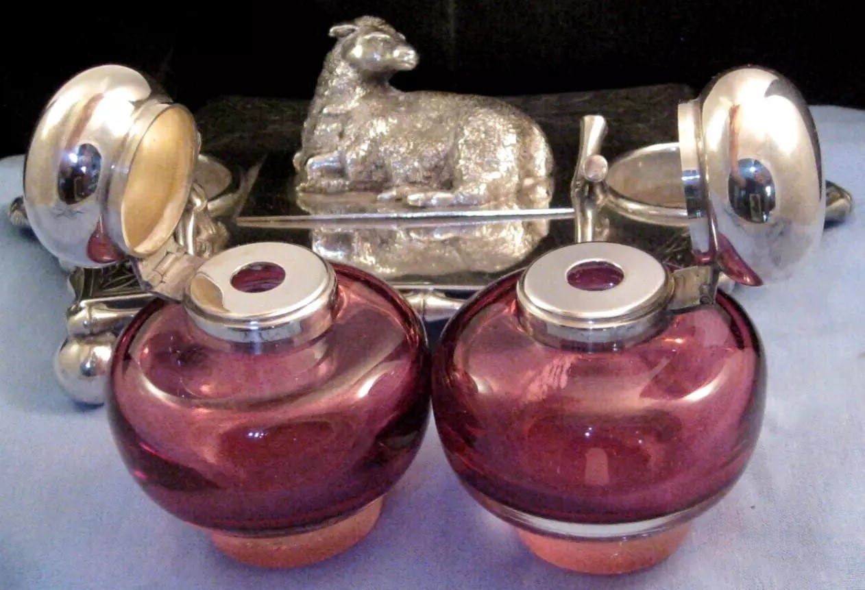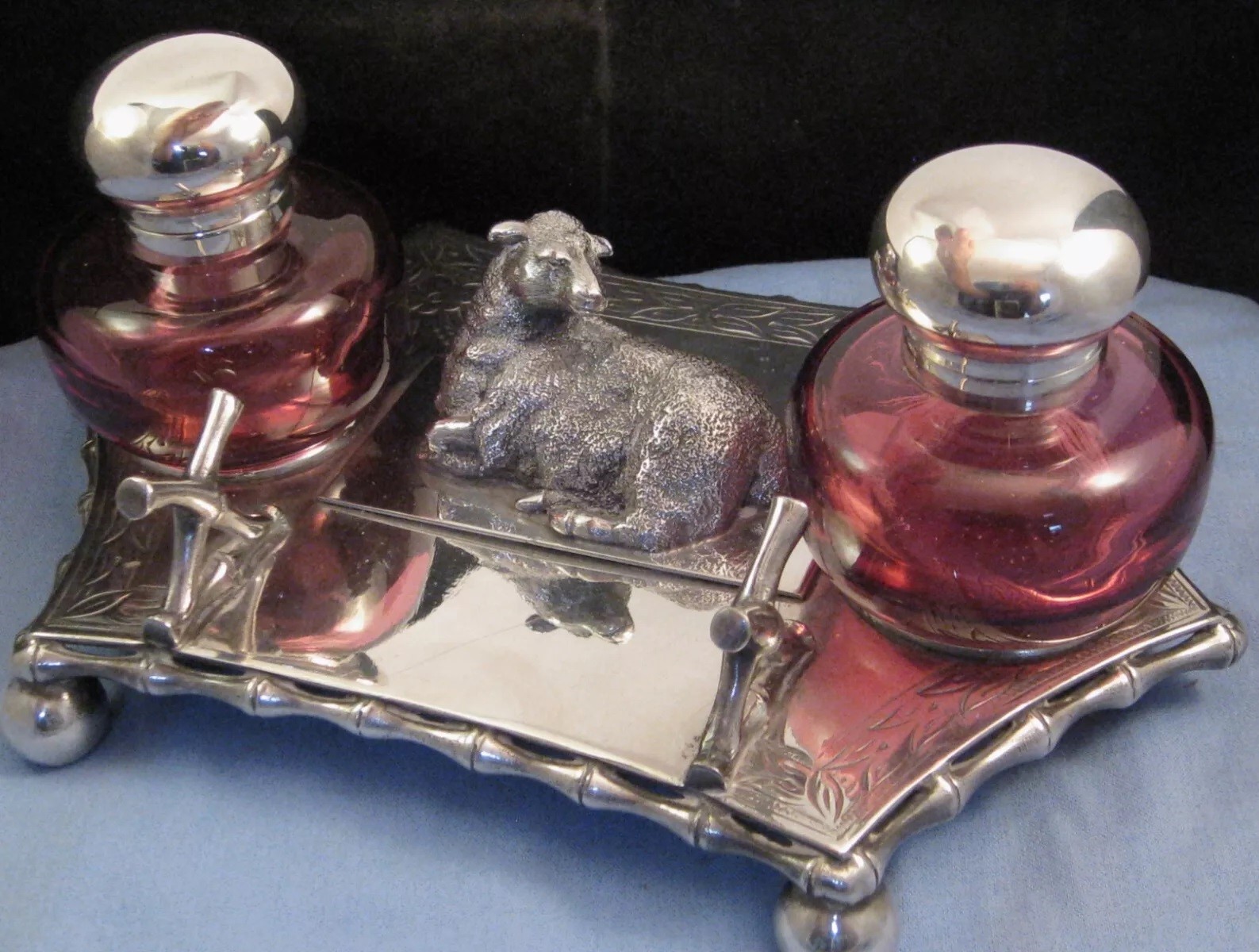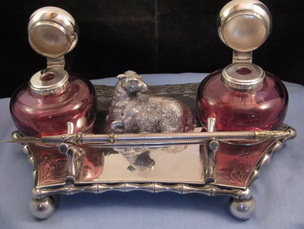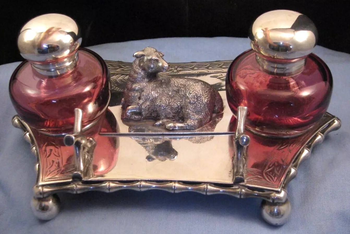 Sheffield silverplate inkstand featuring a resting sheep at the center. On either side of the sheep, there are cranberry glass inkwells with polished silver fittings. The inkwells have stems that fit securely into the base. The silver base is framed with a bamboo form edging, providing an ornate and textured border. The crossed sides at the front form a pen rest. The underside is marked with the initials “J D & S” (James Deakin & Sons), a crown logo, and “EP” (electroplate), indicating its Sheffield silverplate origin.