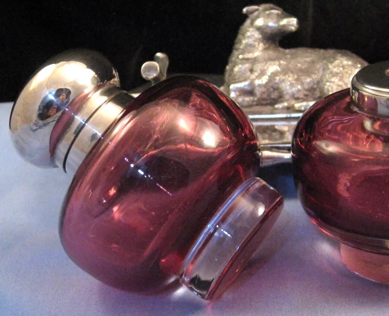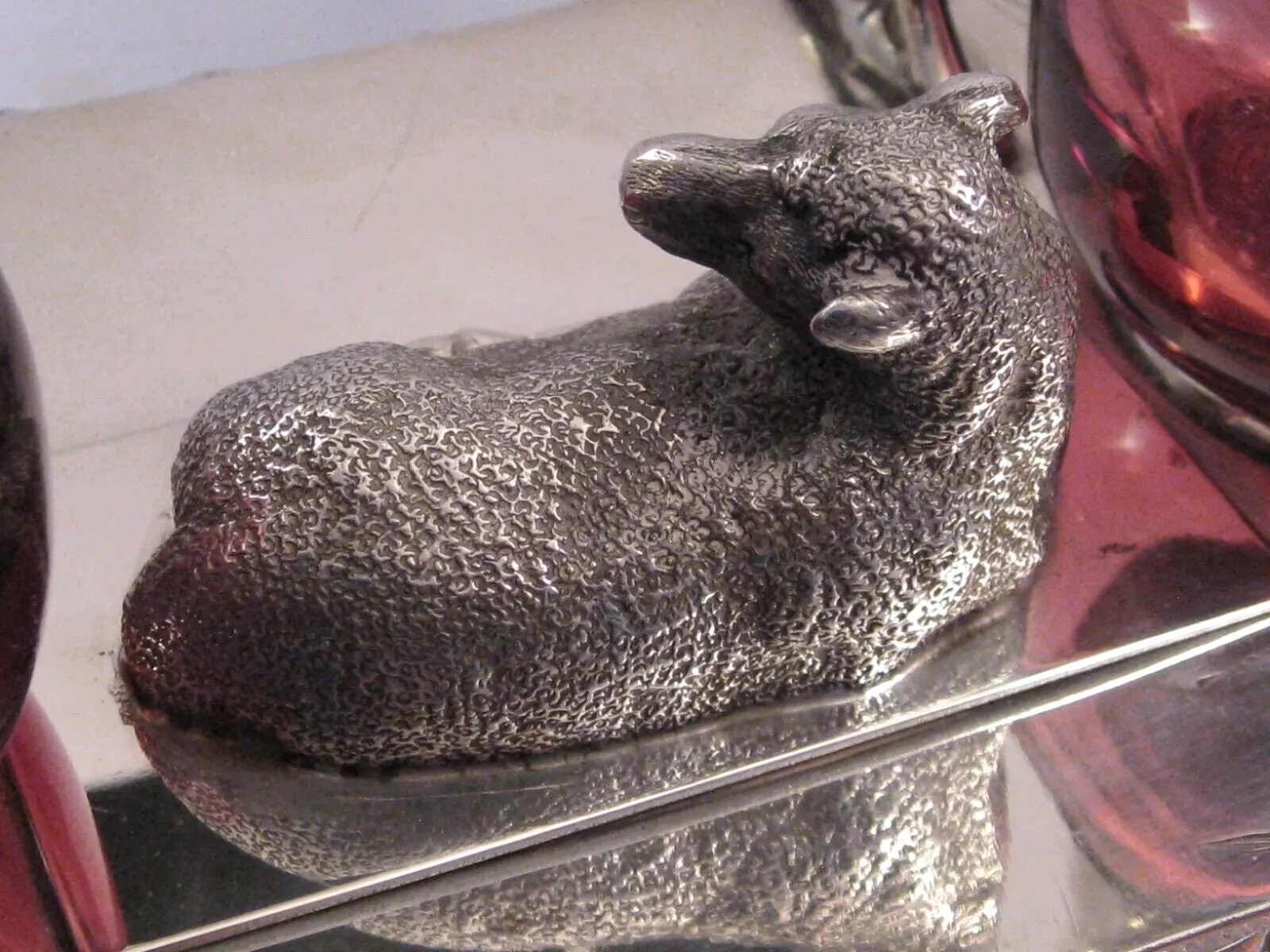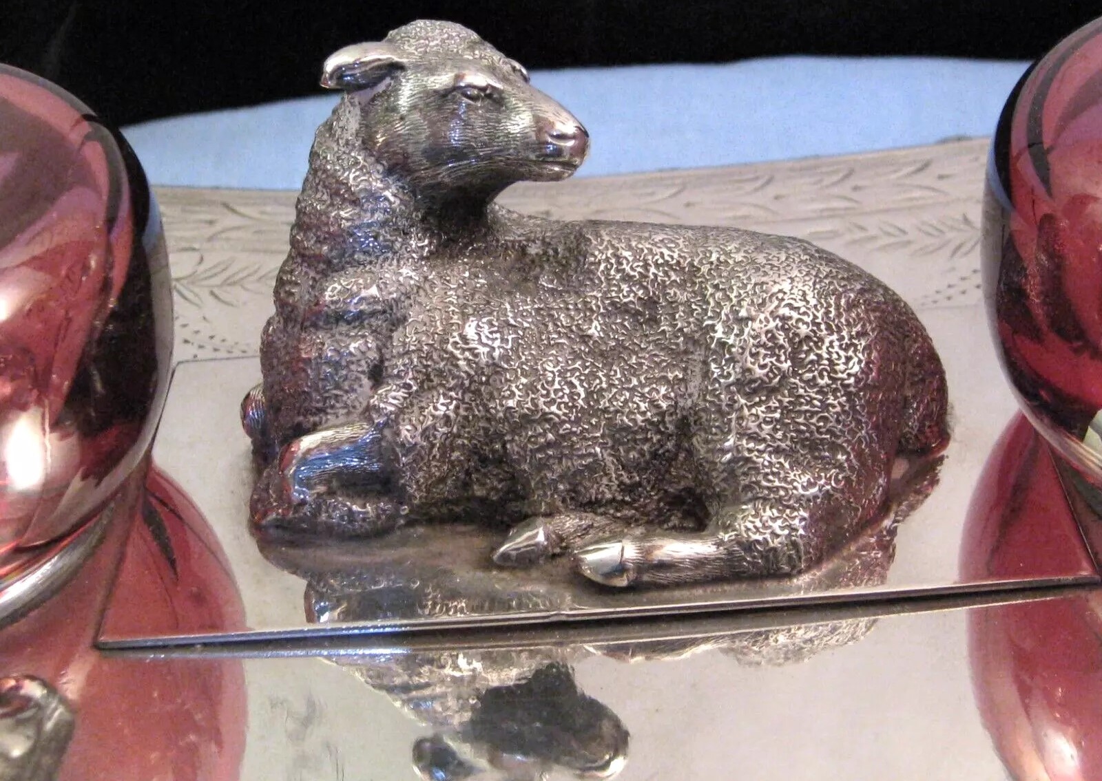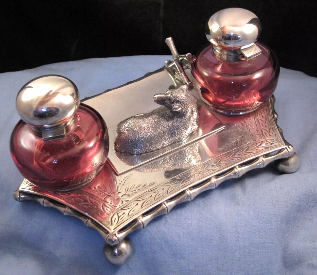 Sheffield silverplate inkstand featuring a resting sheep at the center. On either side of the sheep, there are cranberry glass inkwells with polished silver fittings. The inkwells have stems that fit securely into the base. The silver base is framed with a bamboo form edging, providing an ornate and textured border. The crossed sides at the front form a pen rest. The underside is marked with the initials “J D & S” (James Deakin & Sons), a crown logo, and “EP” (electroplate), indicating its Sheffield silverplate origin.