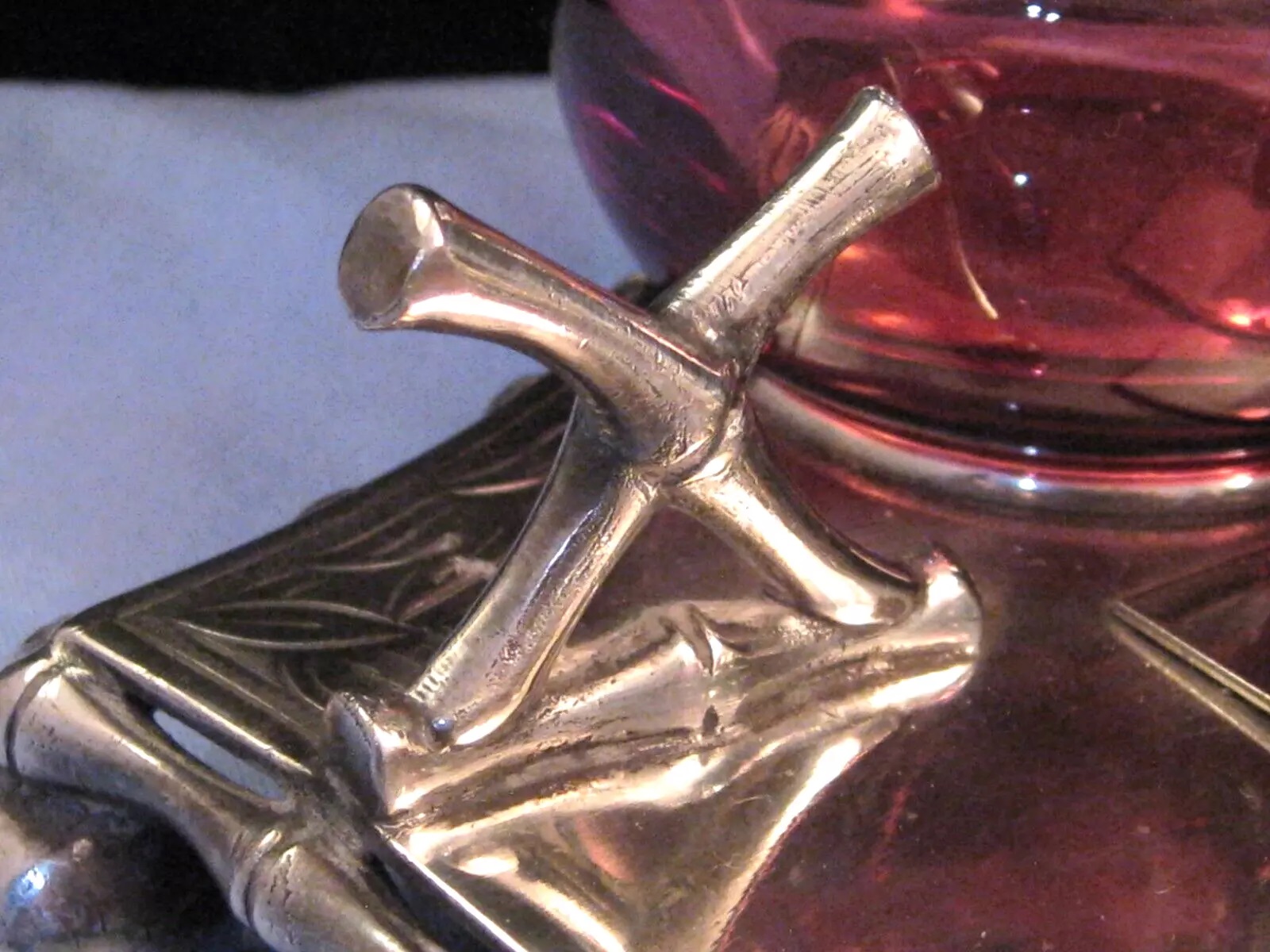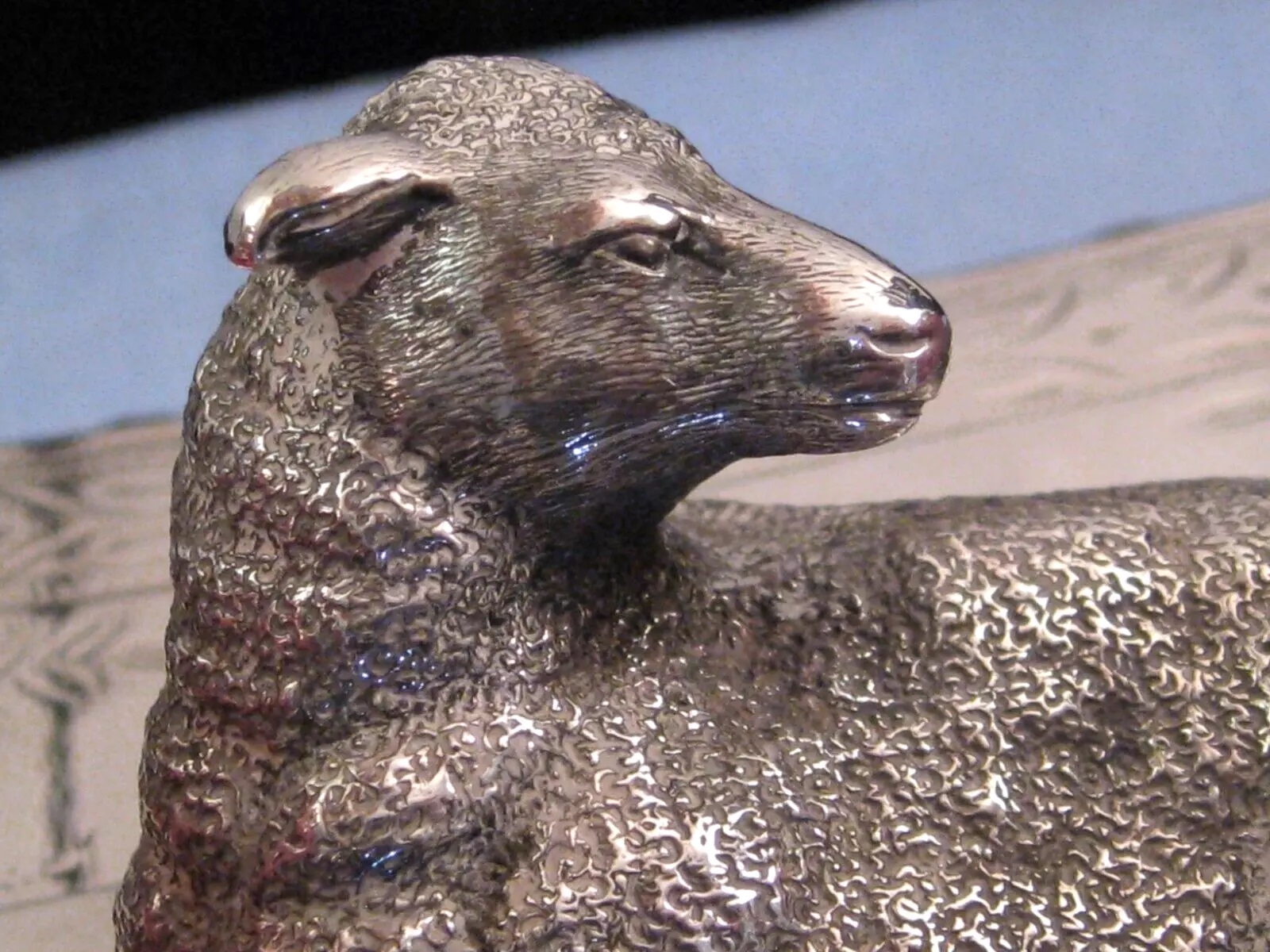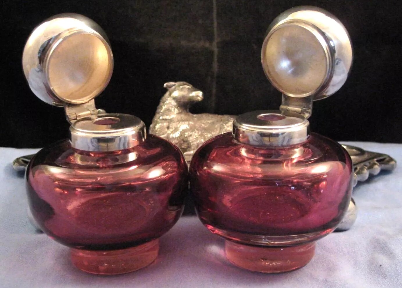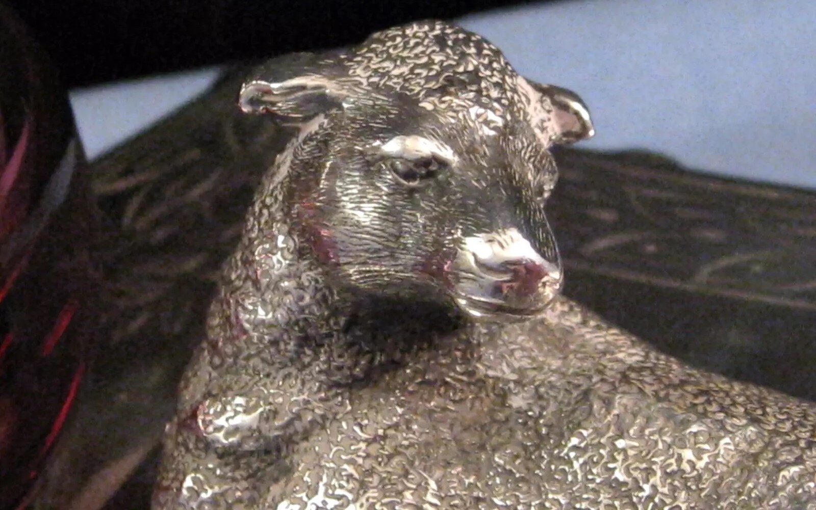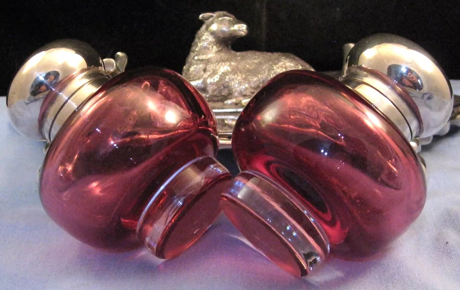Sheffield silverplate inkstand featuring a resting sheep at the center. On either side of the sheep, there are cranberry glass inkwells with polished silver fittings. The inkwells have stems that fit securely into the base. The silver base is framed with a bamboo form edging, providing an ornate and textured border. The crossed sides at the front form a pen rest. The underside is marked with the initials “J D & S” (James Deakin & Sons), a crown logo, and “EP” (electroplate), indicating its Sheffield silverplate origin.