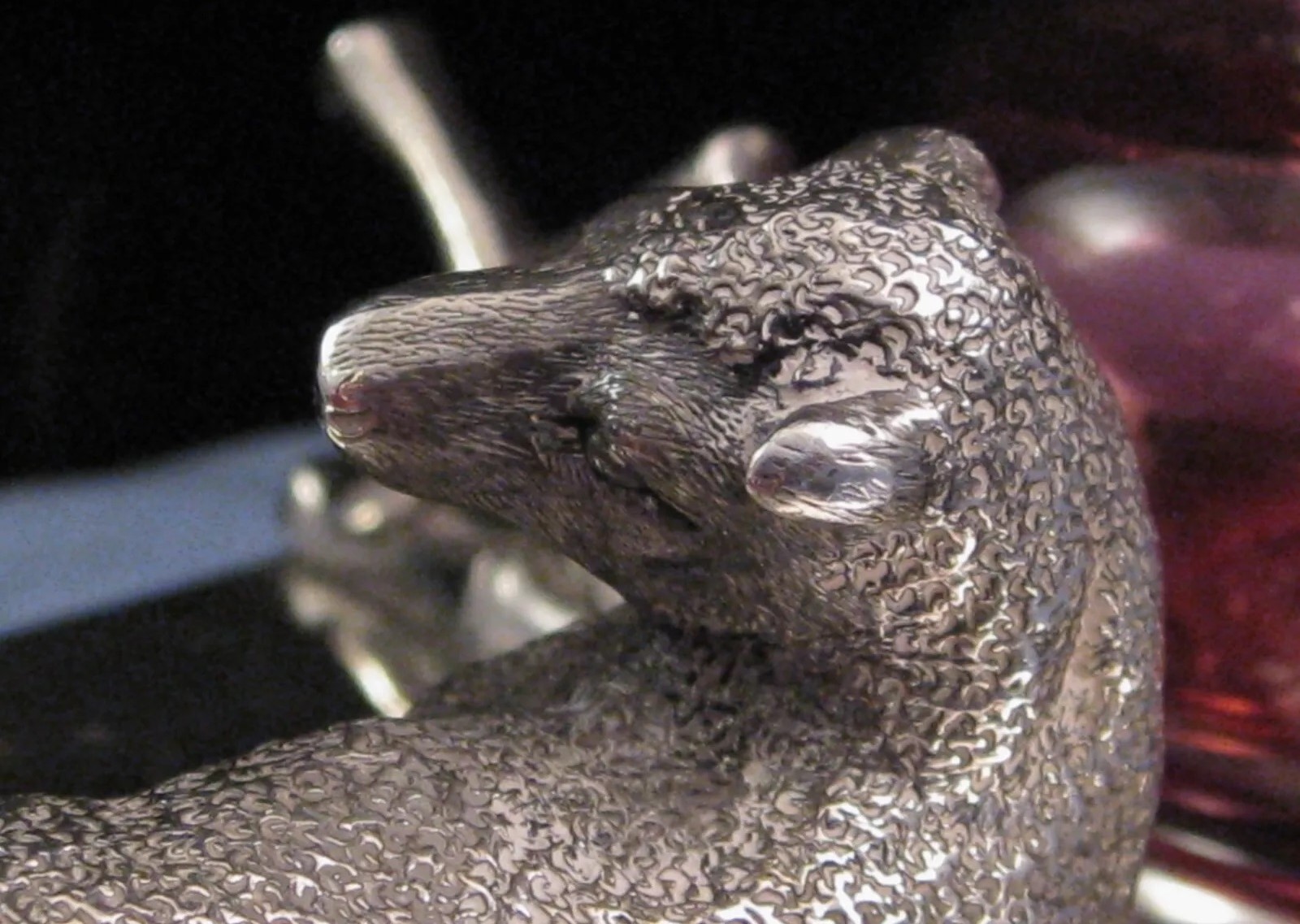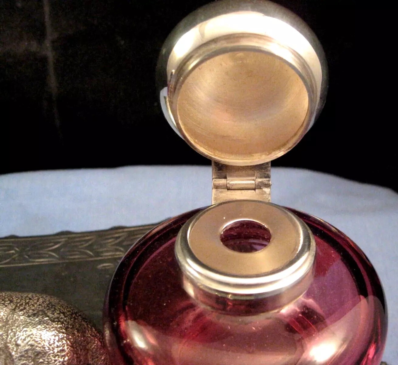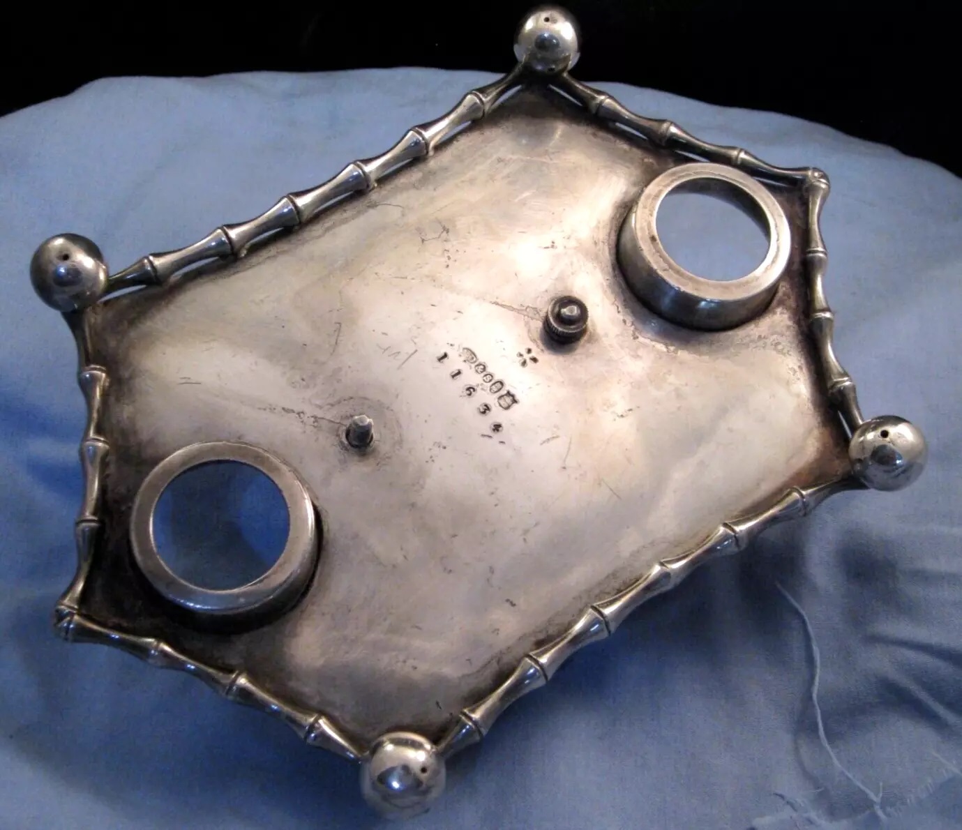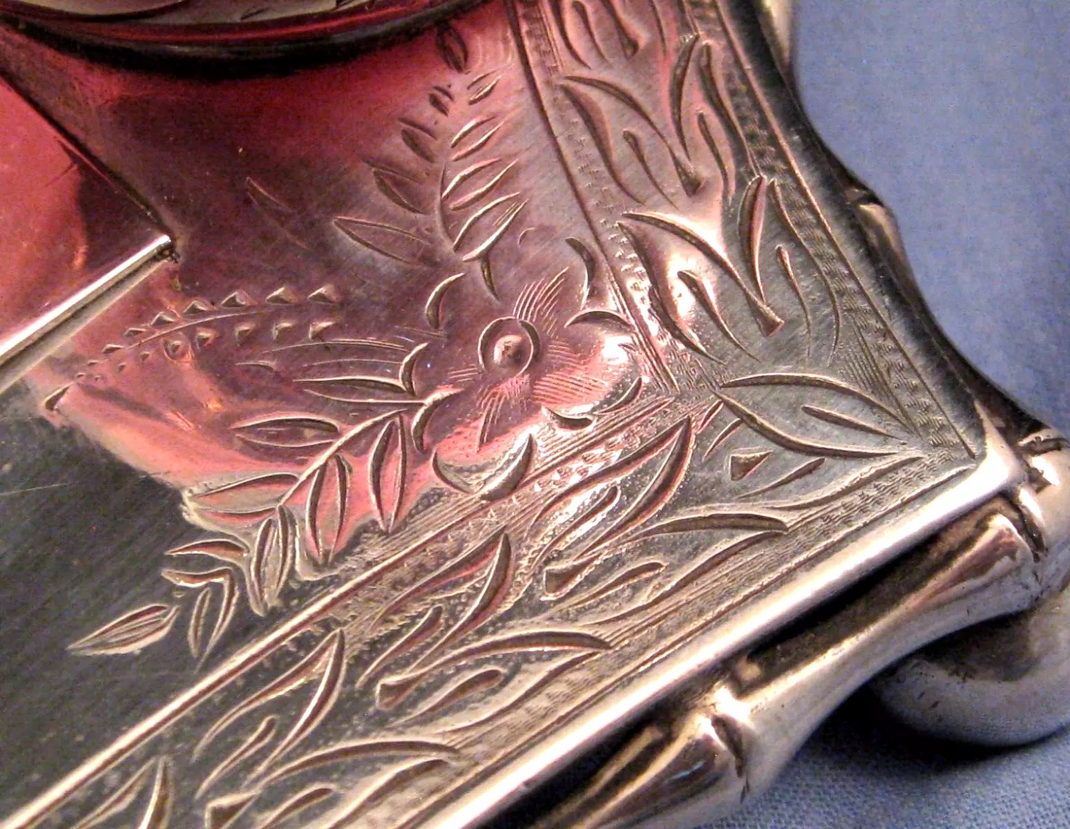 Sheffield silverplate inkstand featuring a resting sheep at the center. On either side of the sheep, there are cranberry glass inkwells with polished silver fittings. The inkwells have stems that fit securely into the base. The silver base is framed with a bamboo form edging, providing an ornate and textured border. The crossed sides at the front form a pen rest. The underside is marked with the initials “J D & S” (James Deakin & Sons), a crown logo, and “EP” (electroplate), indicating its Sheffield silverplate origin.