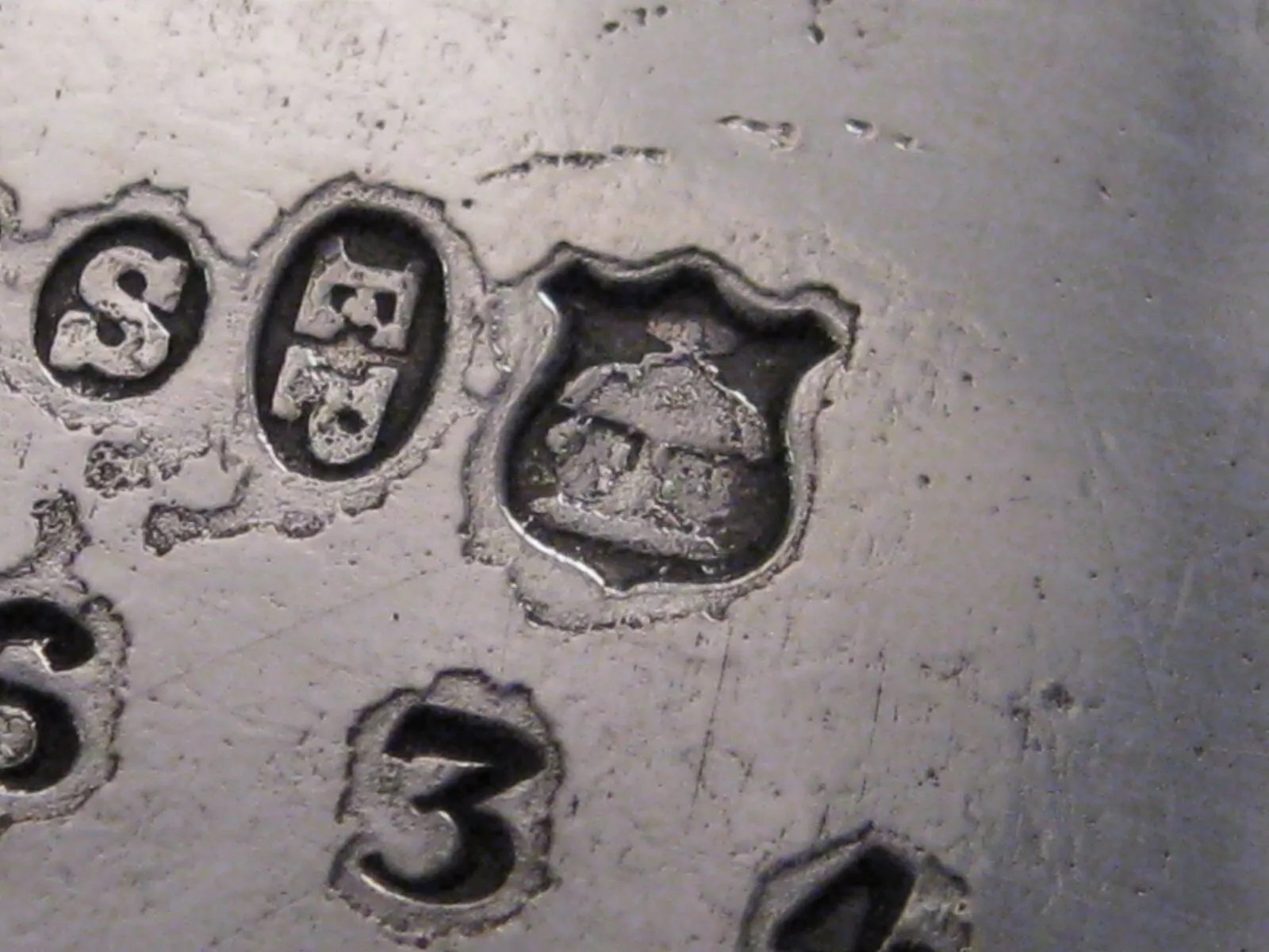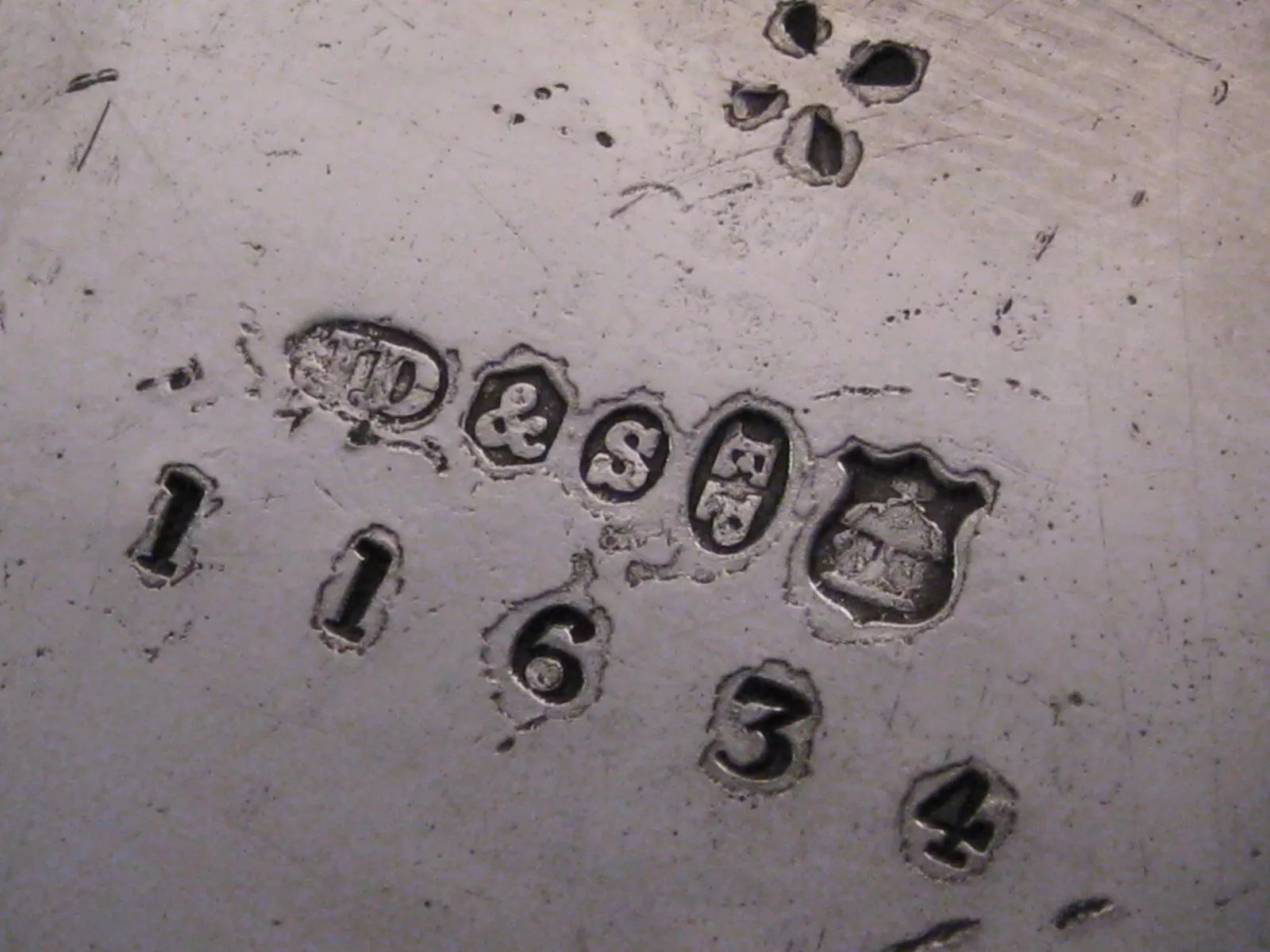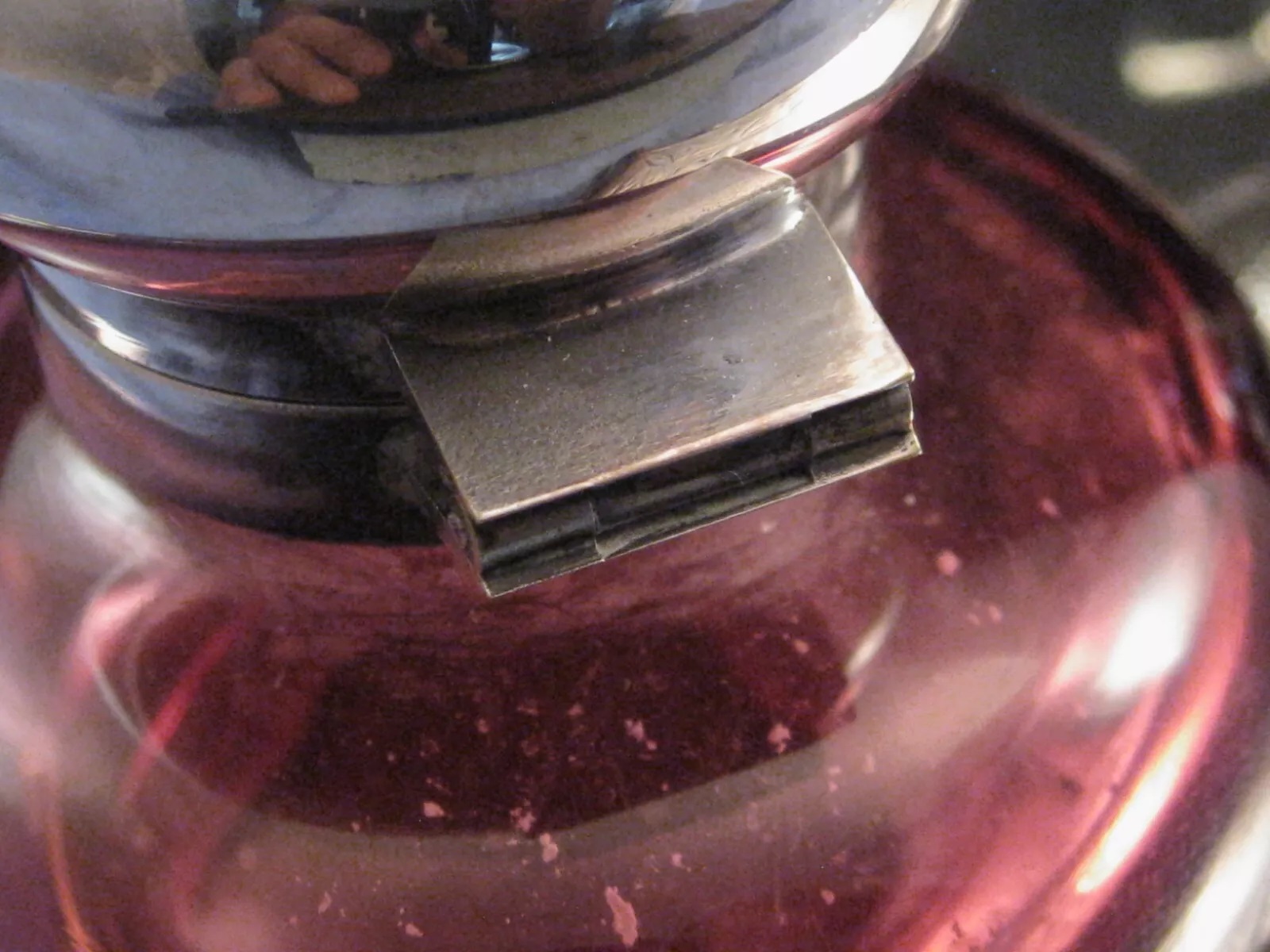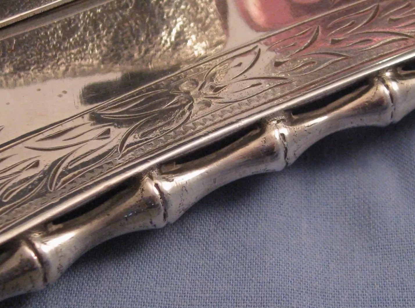 Sheffield silverplate inkstand featuring a resting sheep at the center. On either side of the sheep, there are cranberry glass inkwells with polished silver fittings. The inkwells have stems that fit securely into the base. The silver base is framed with a bamboo form edging, providing an ornate and textured border. The crossed sides at the front form a pen rest. The underside is marked with the initials “J D & S” (James Deakin & Sons), a crown logo, and “EP” (electroplate), indicating its Sheffield silverplate origin.