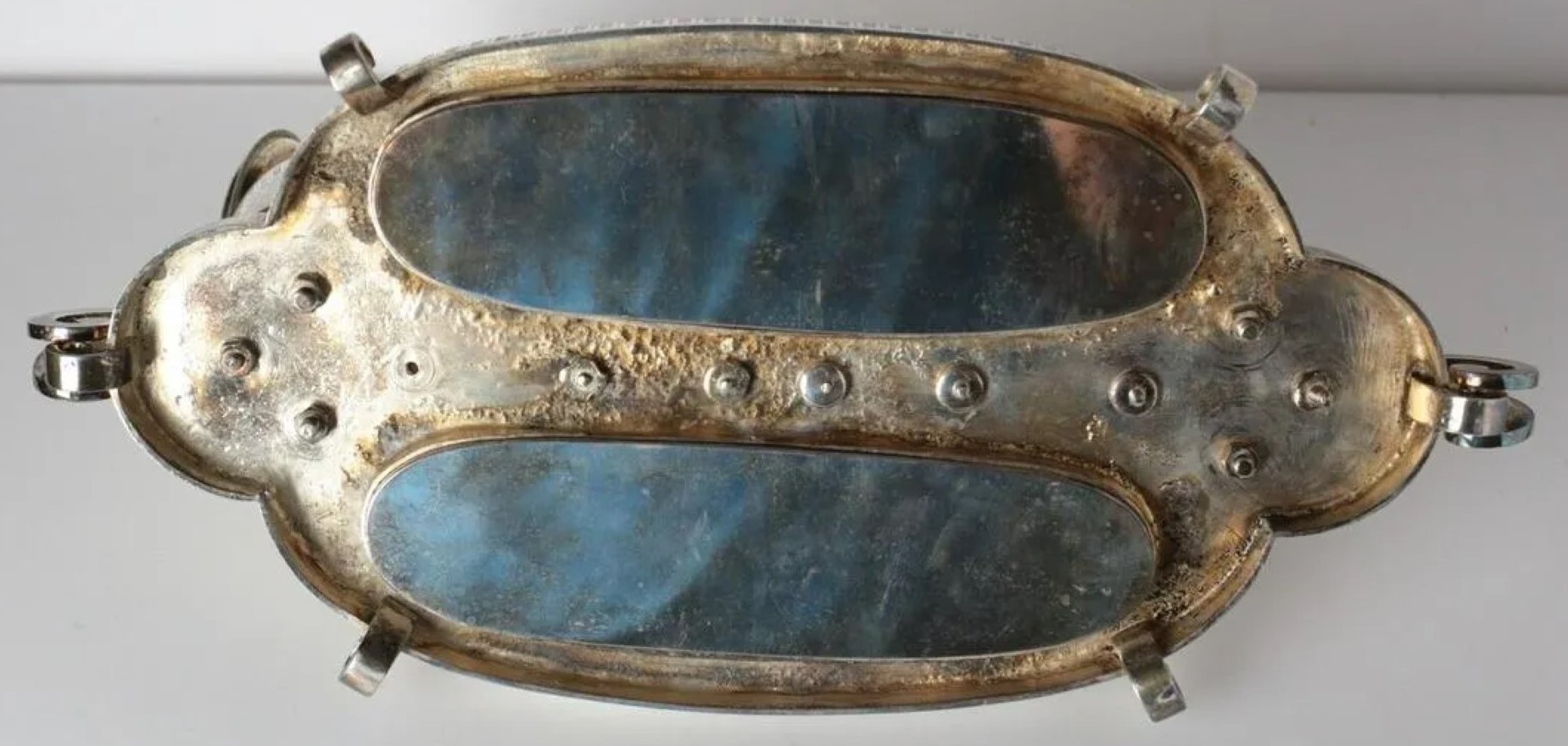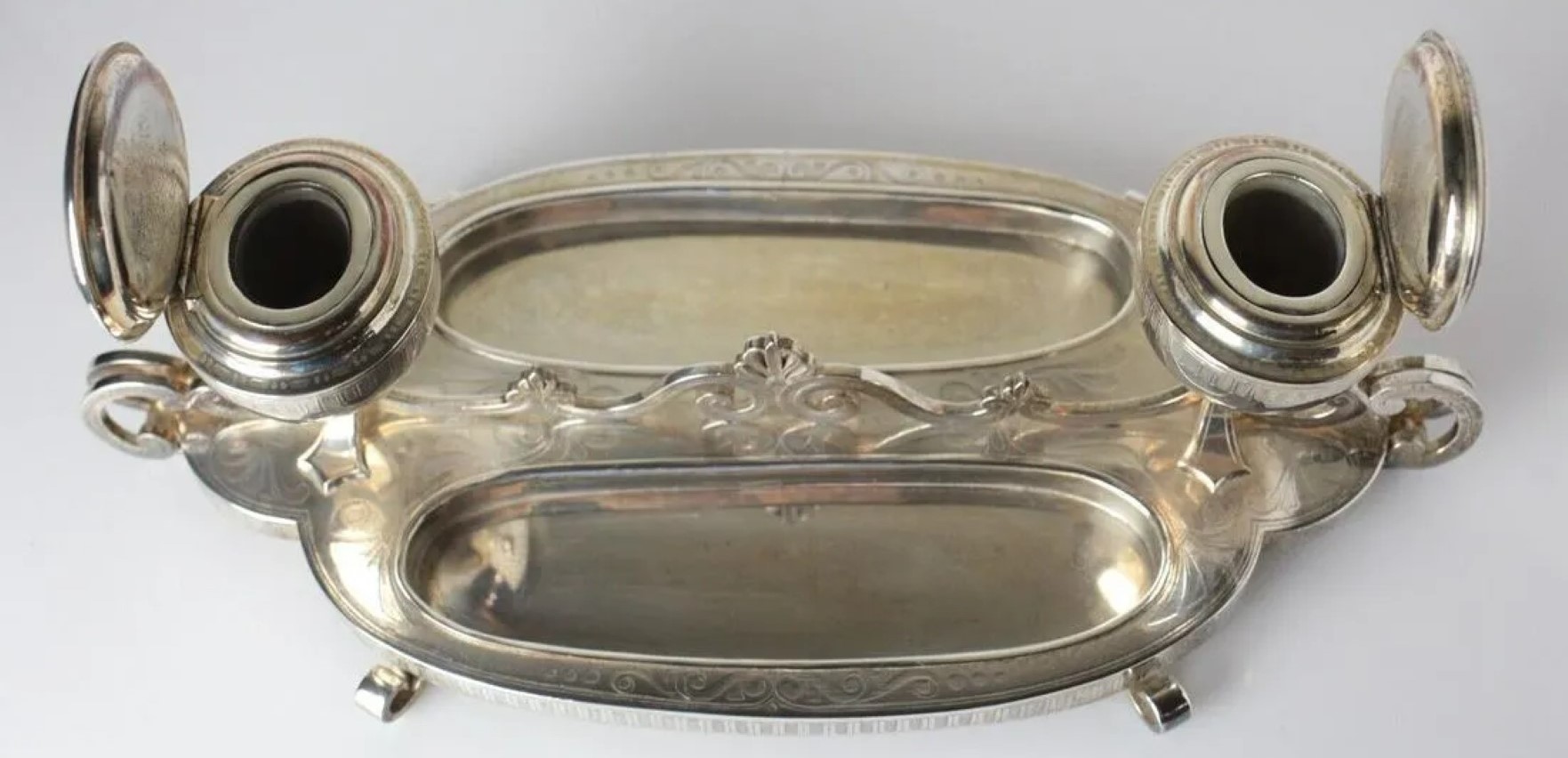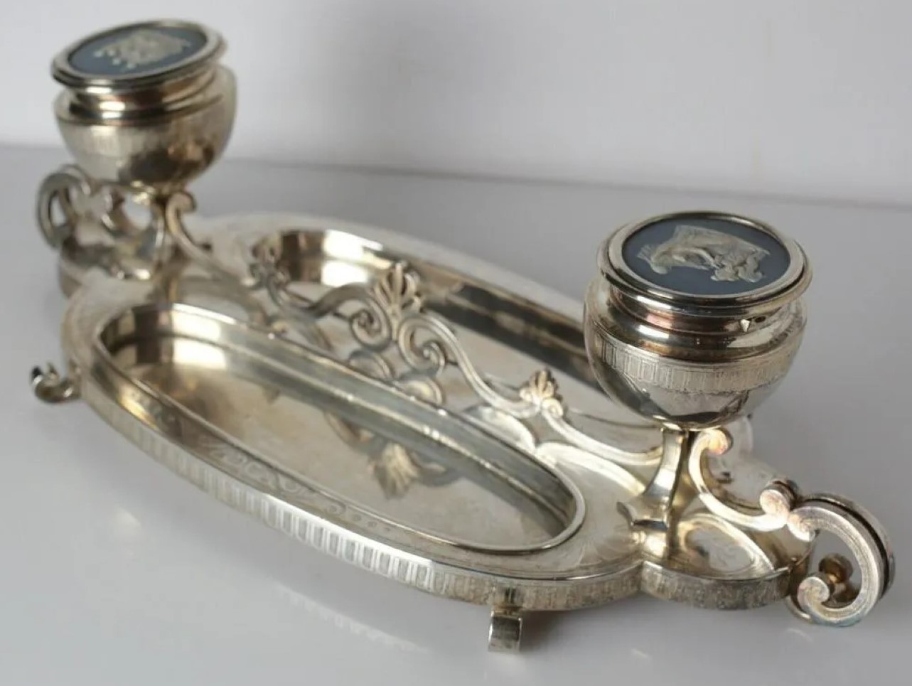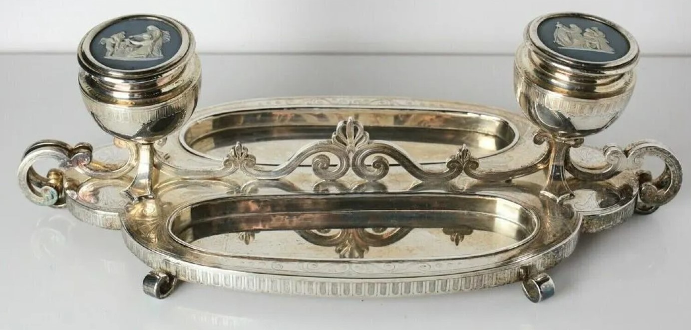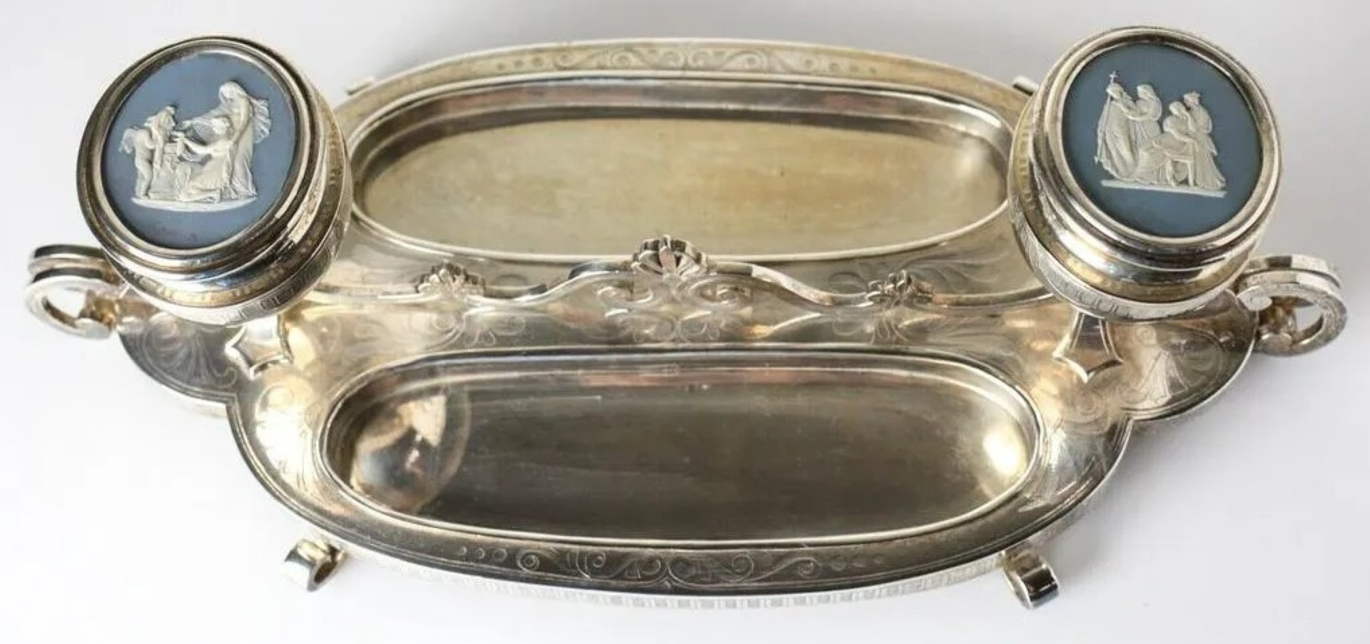 This 19th century silverplate inkstand boasts Wedgwood medallions on the lids of the two inkwells with original glass inserts. This is a large piece (though unmarked) with hand engraved designs and double pen trays.