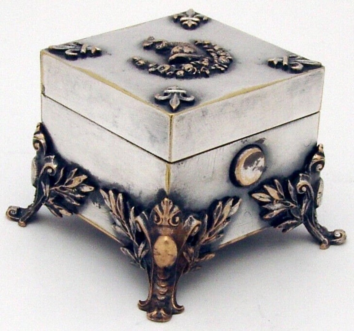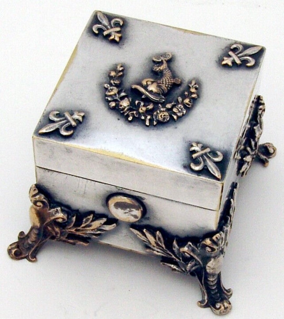 Traveling inkwell in a silverplated box, having a square form with hinged lid and four applied figural feet. In the center of the lid is an applied figural wreath & fish crest, and fleur-de-lis in the corners.
