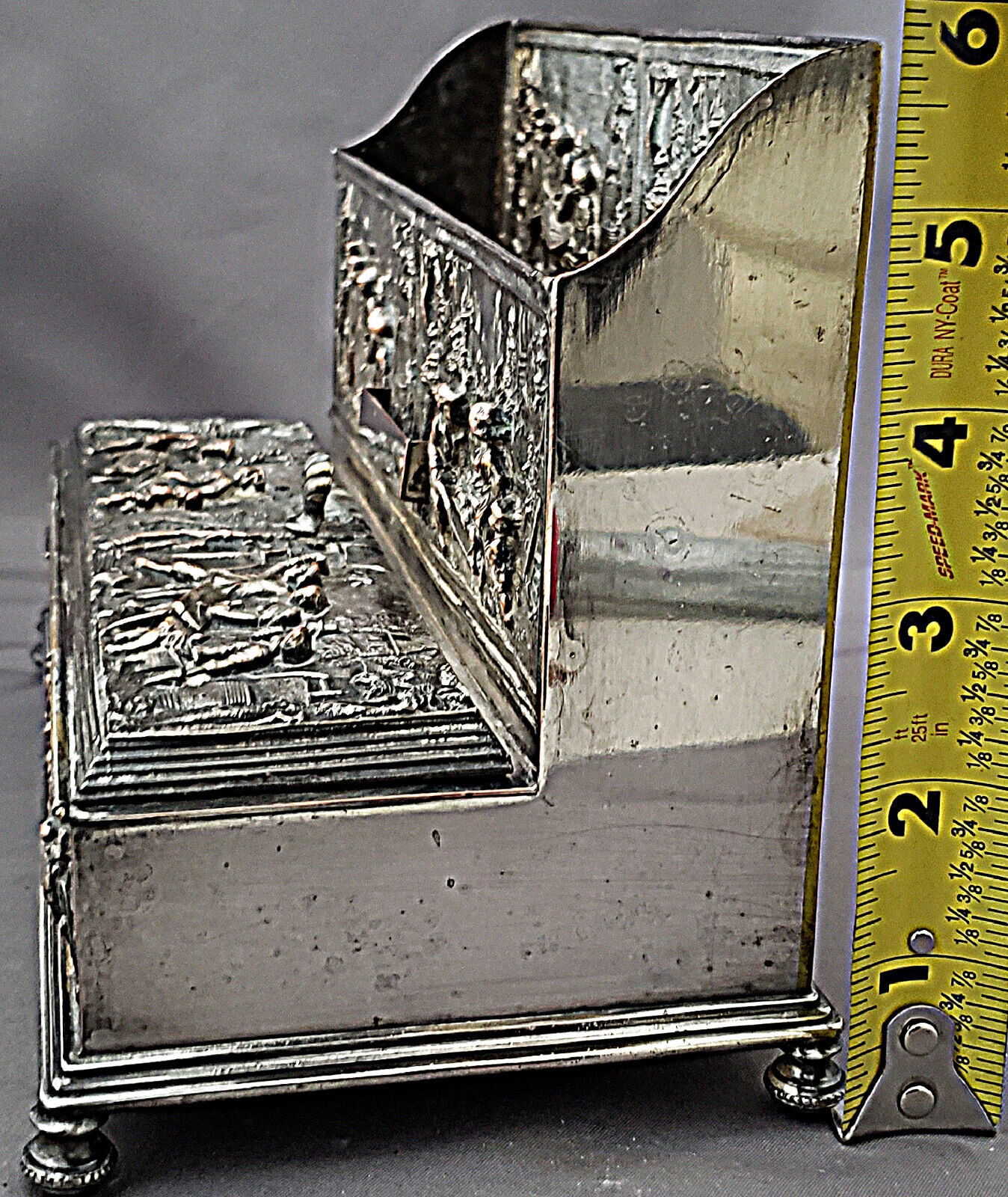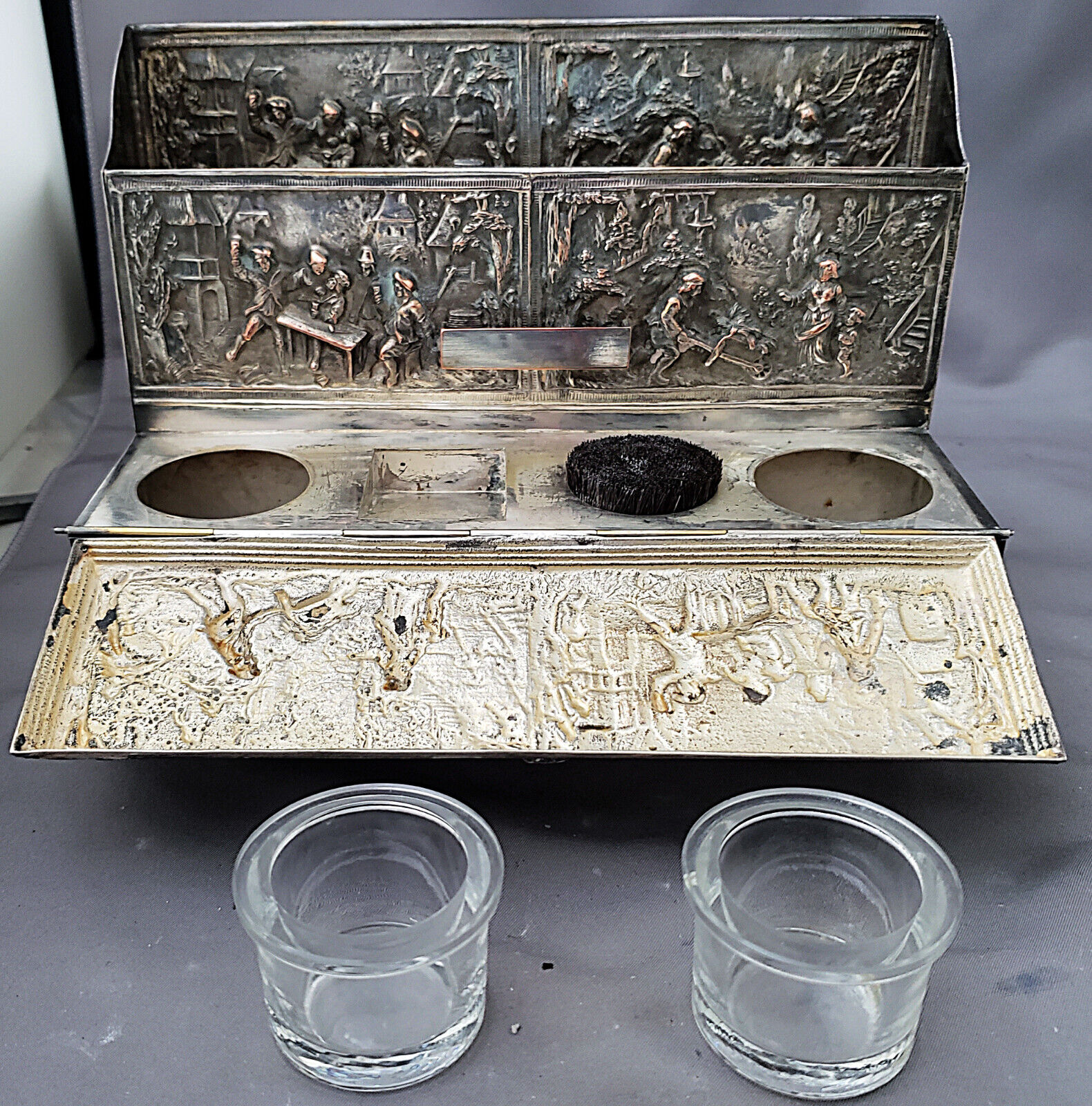 The inkstand’s exterior features multiple repousse panels, each showing people engaged in various activities – social interaction in a pub, a man pushing a wheelbarrow, agrarian scenes. The hinged lid in the front opens to reveal two glass inkwells, a pen wipe, and a storage compartment.