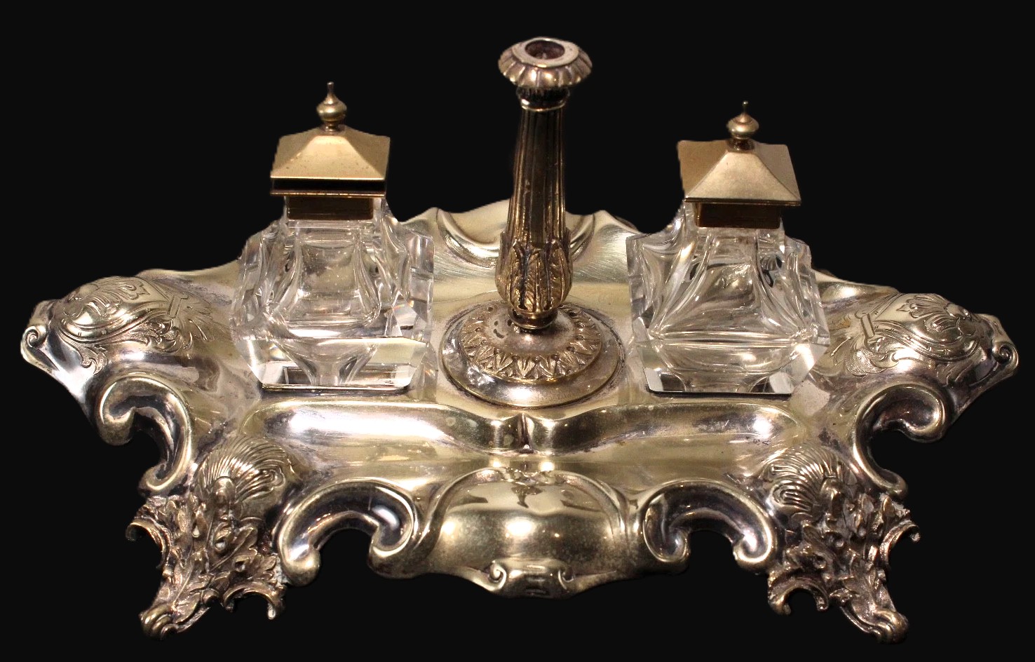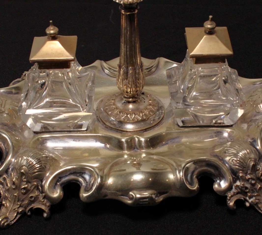 This silver-plated inkstand is an example of Neo-Rococo (Rococo Revival) decorative art, a style that celebrated the ornate and asymmetrical aesthetics of the mid-18th century with 19th-century manufacturing precision.