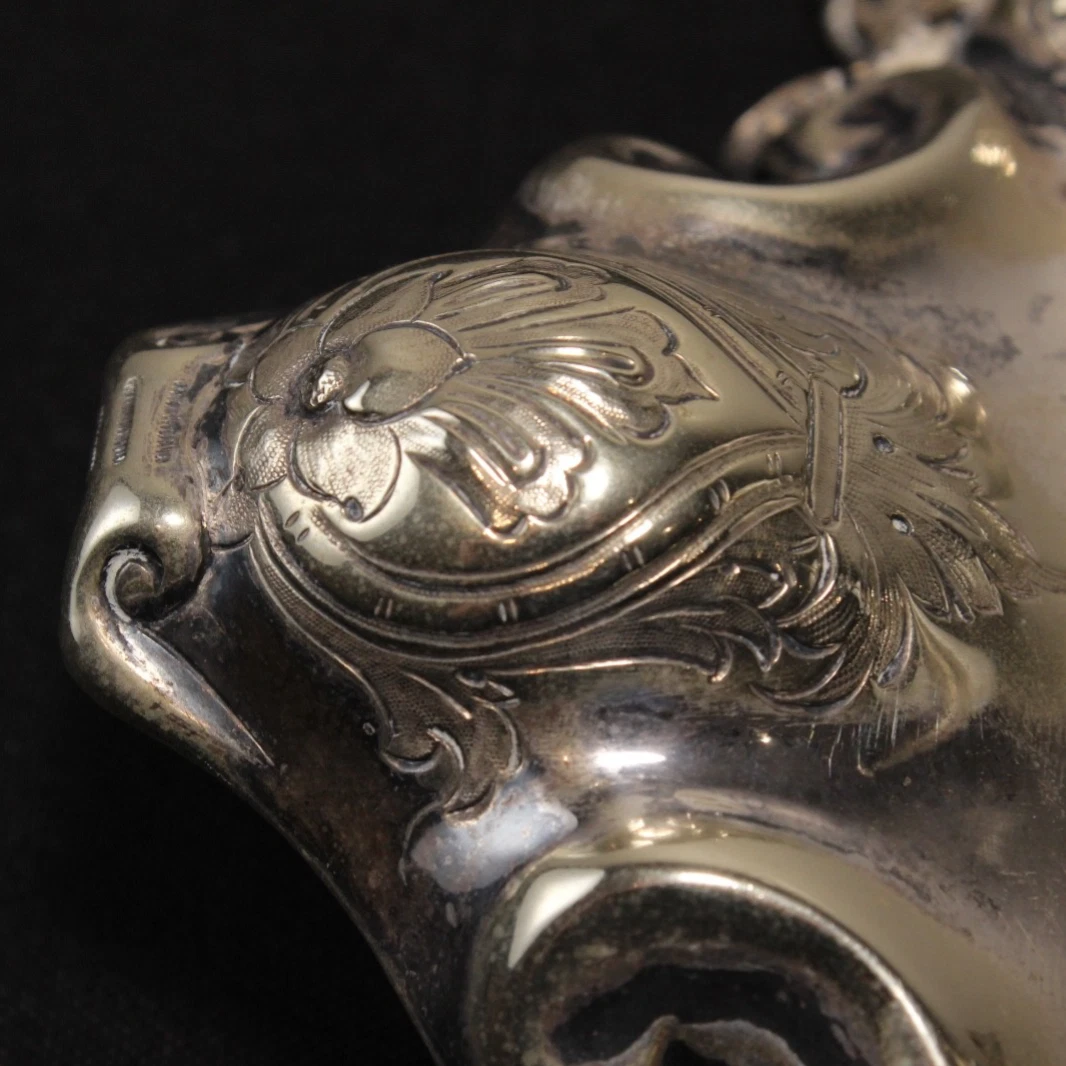 - The Tray & Ornamentation: The stand is a masterwork of repoussé and chasing, techniques where the metal is hammered from the back and front to create high-relief patterns. The surface is a flowing arrangement of rocaille (shell-like) motifs, scrolling acanthus leaves, and dense floral garlands.