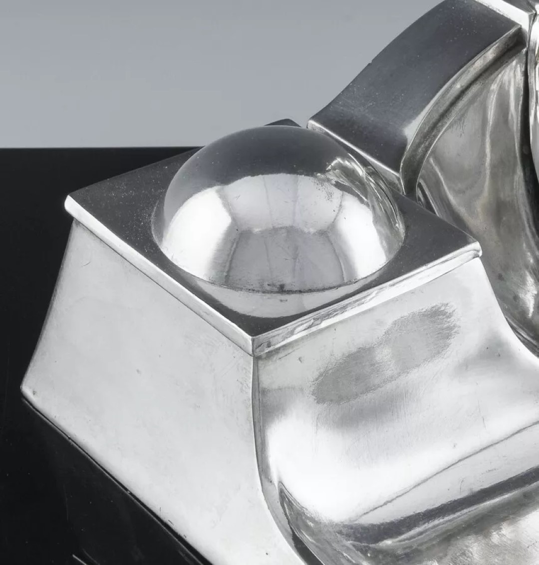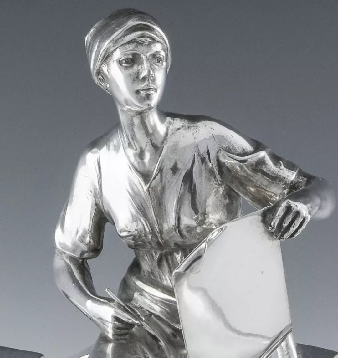 This silverplated double inkstand features a central figure of a woman in period dress, seated, holding a document (perhaps a letter). The figure is detailed, with visible folds in her dress and distinct facial features. Each inkwell has a hinged lid and is positioned on either side of the woman. The base of the inkstand is rectangular with rounded corners, the front serving as a pen tray. The Kayser company hallmark is impressed on the underside.