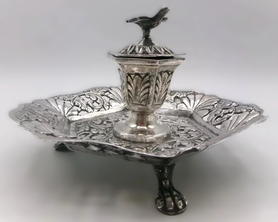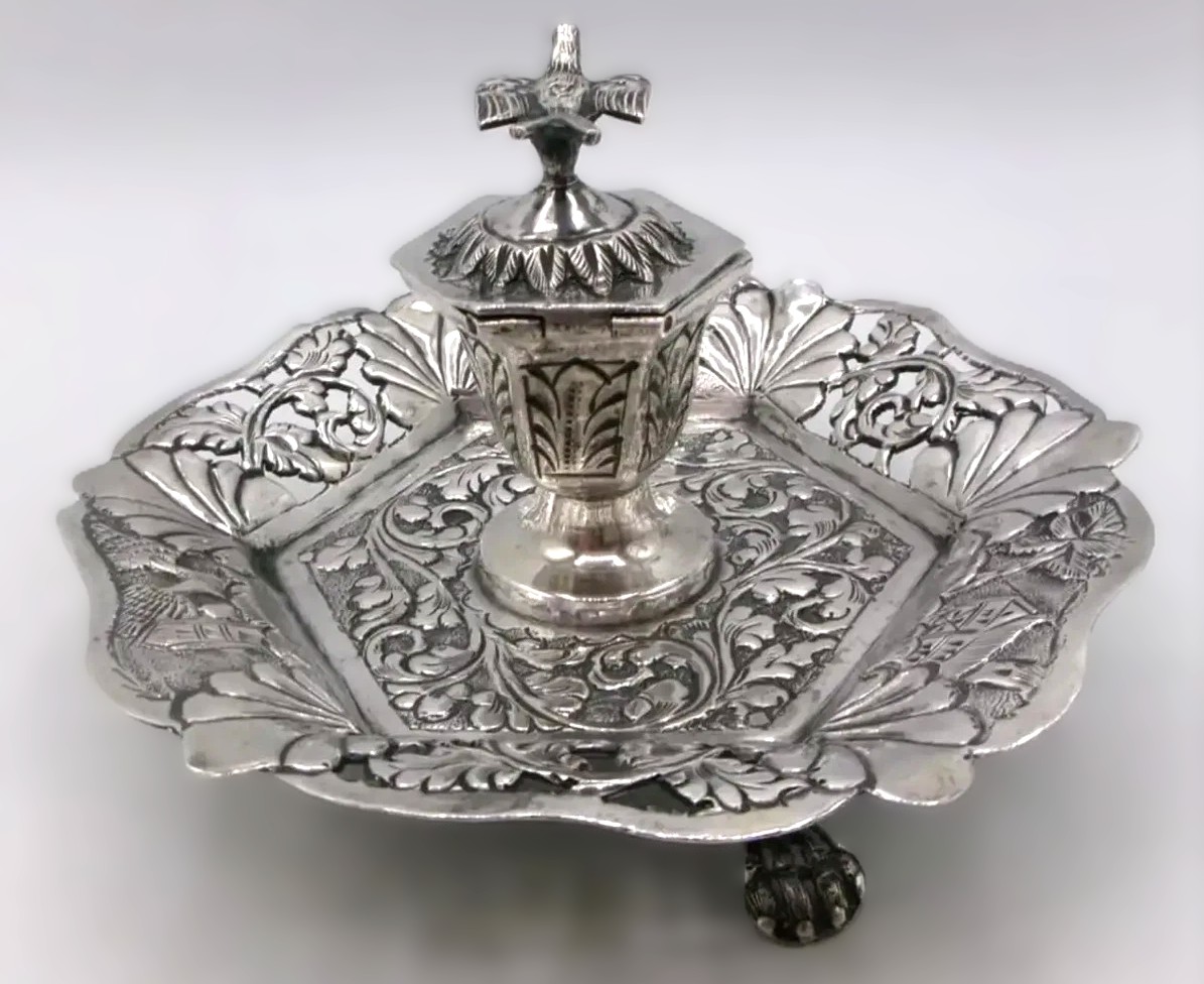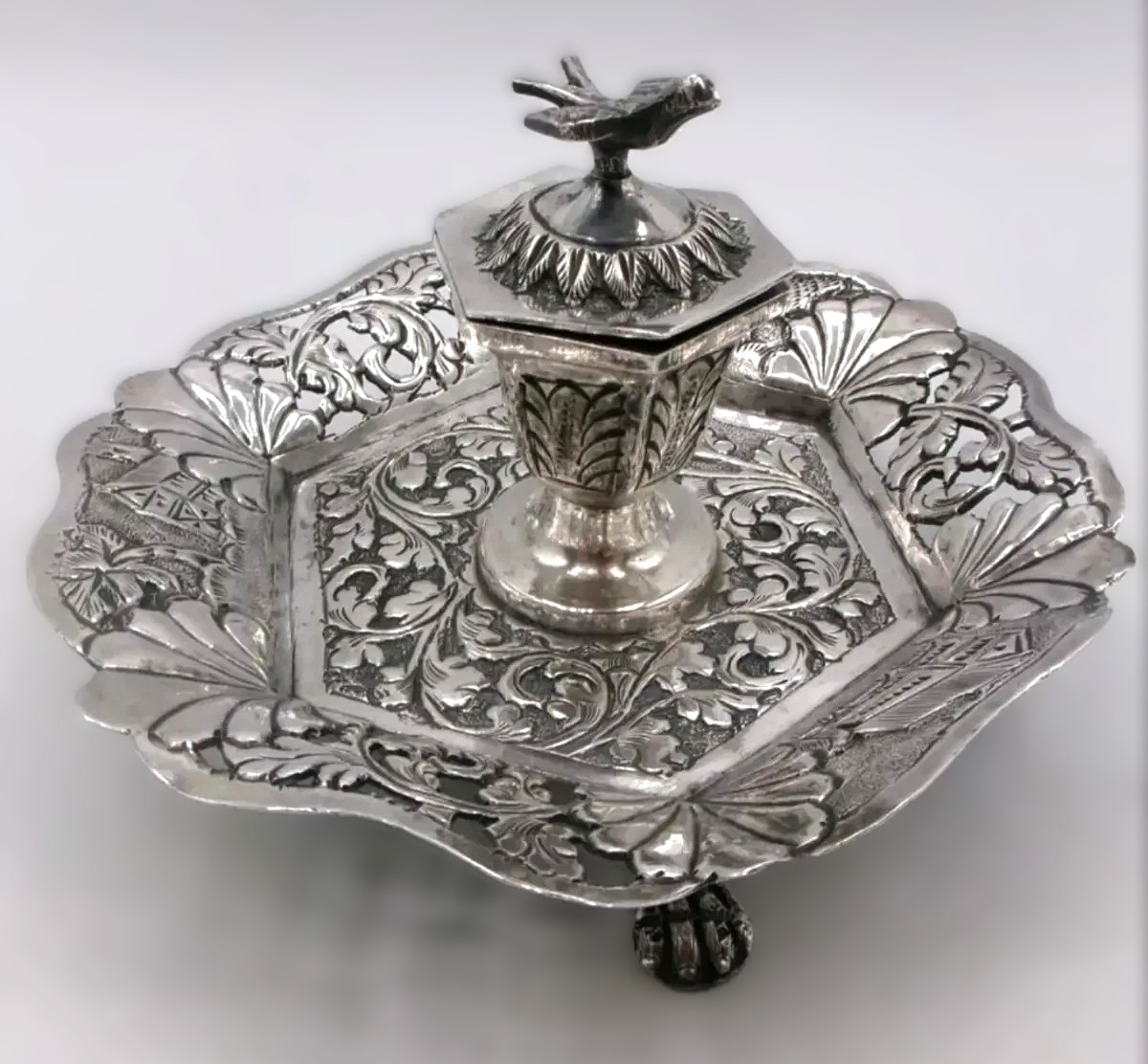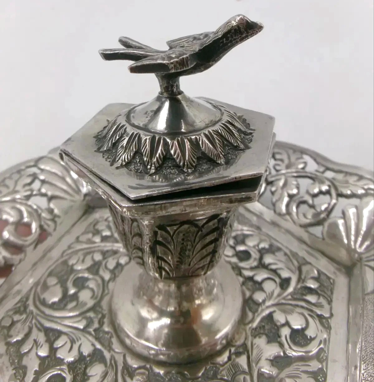 This piece is a classic inkstand. Its heavy “chasing” (the technique used to create the raised patterns) and the use of the bird finial suggest it was a luxury item.