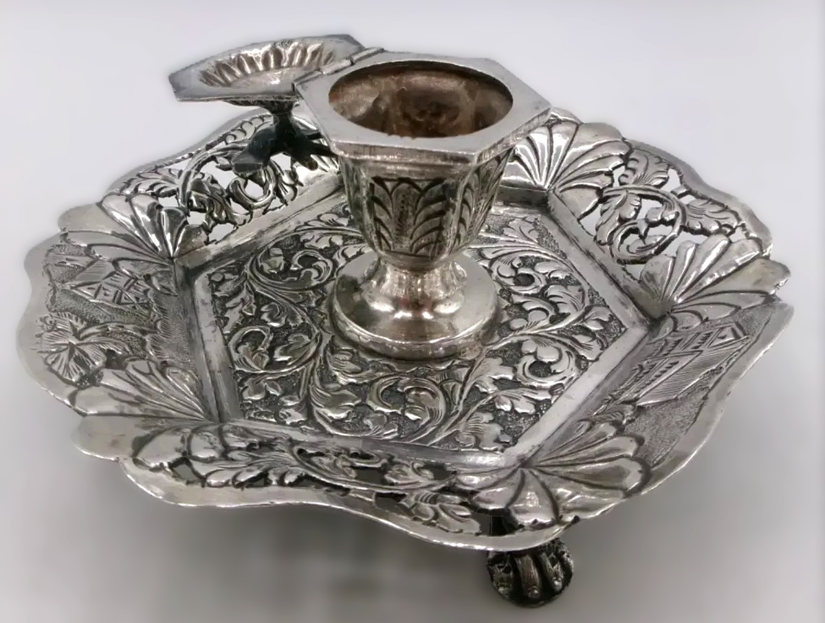 - Body Decoration: The sides of the well are embossed with vertical acanthus leaf or “feather” motifs, which catch the light and add texture.