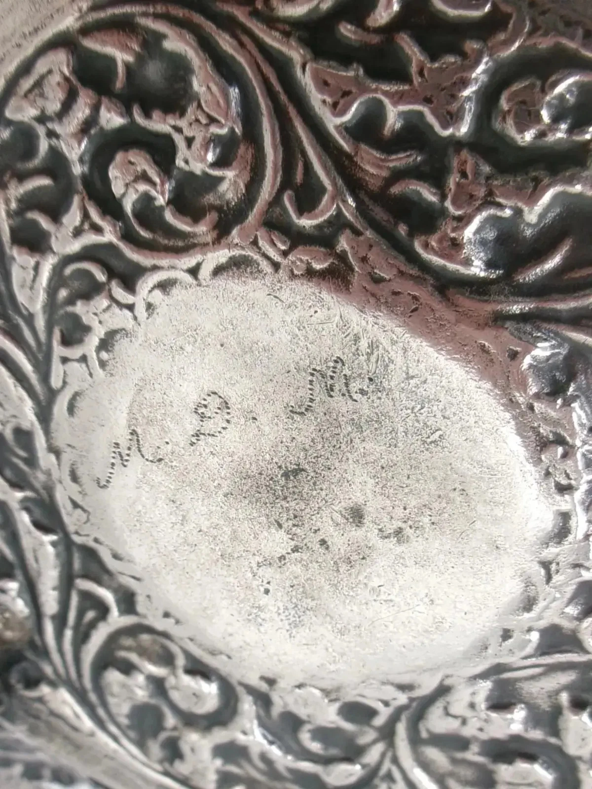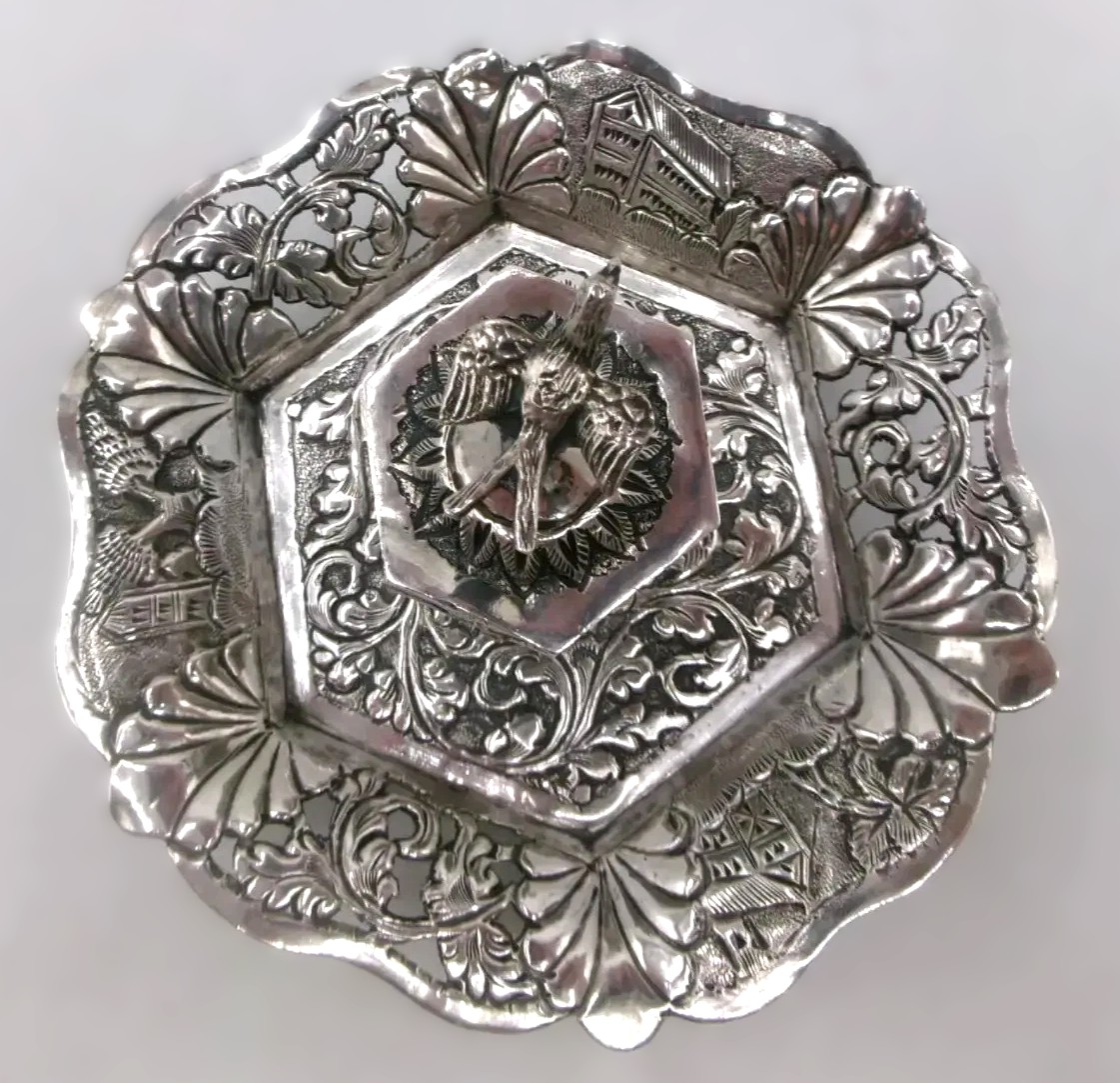 - Edge & Border: The rim features a scalloped, “wavy” edge and is heavily decorated with a combination of piercing (openwork cut-outs) and embossed foliate scrolls.