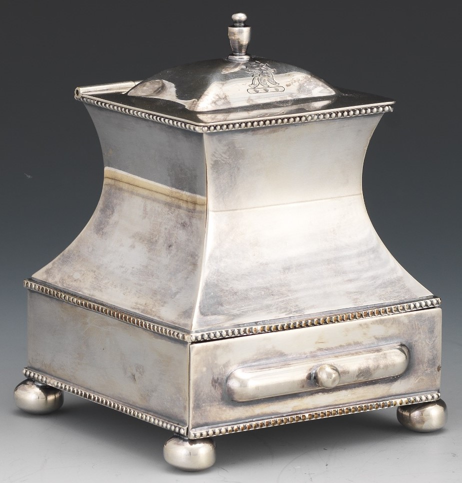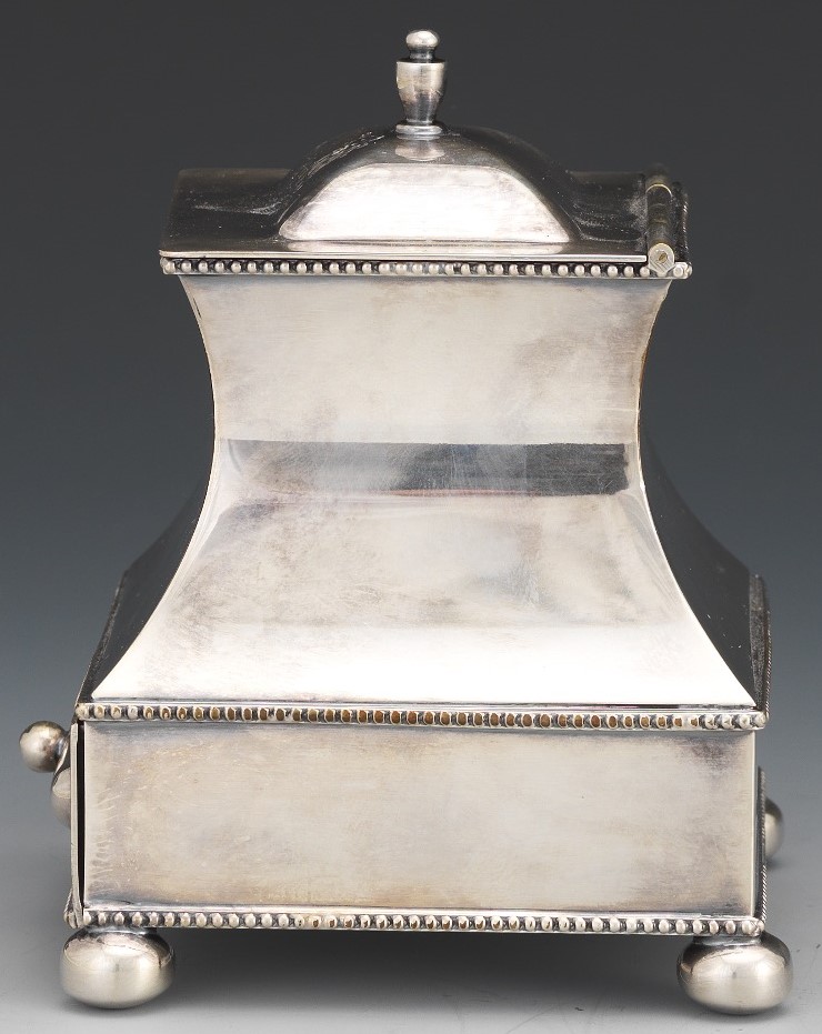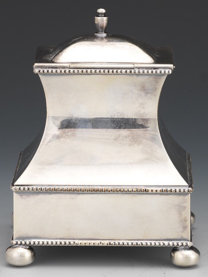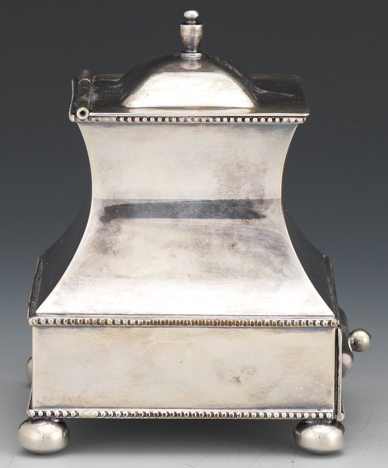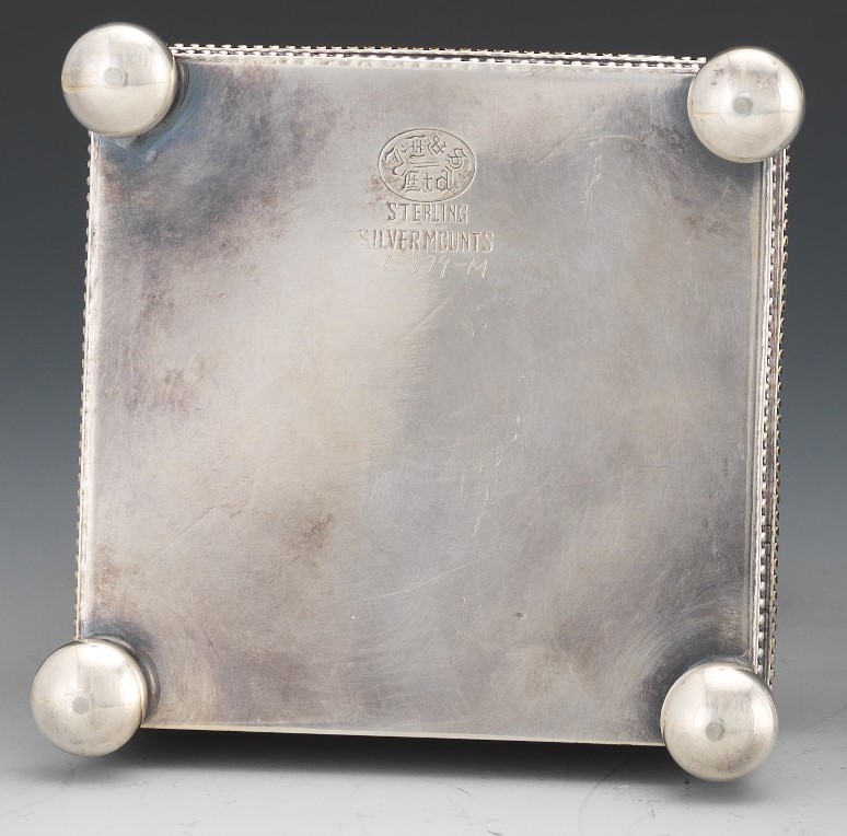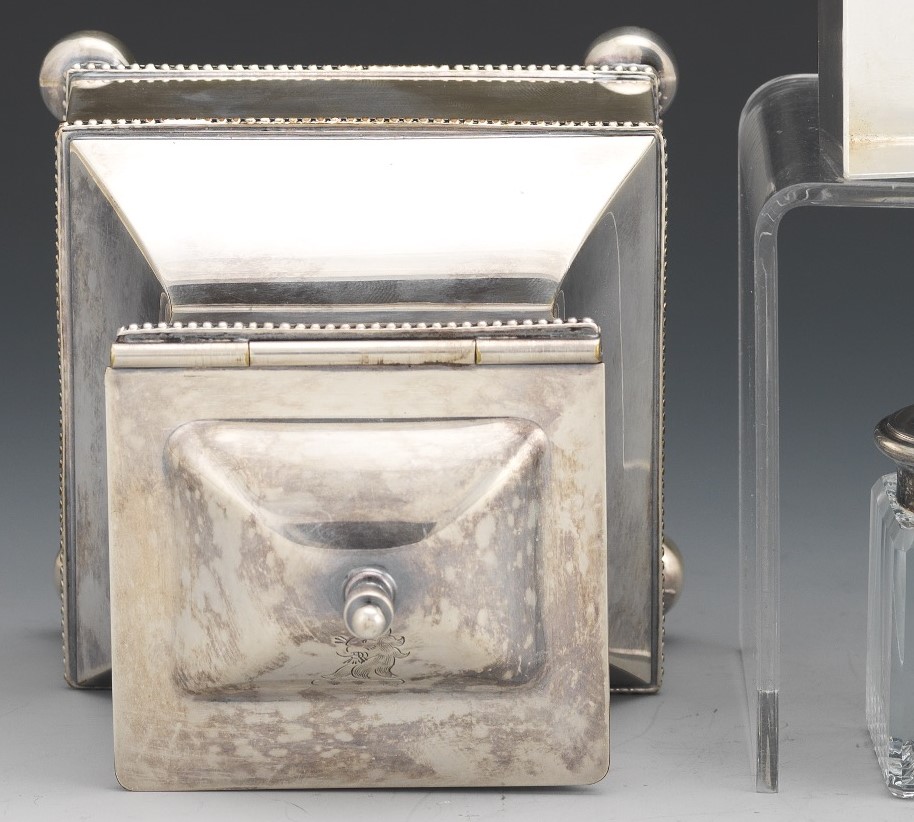This silver-plated inkstand with ball feet, beaded trim, and a glass inkwell has a bottom pull-out drawer for nibs, stamps, wax, etc. The hinged lid is engraved with a lion’s head. The underside is engraved with a mark and the words “Sterling Silvermounts”.