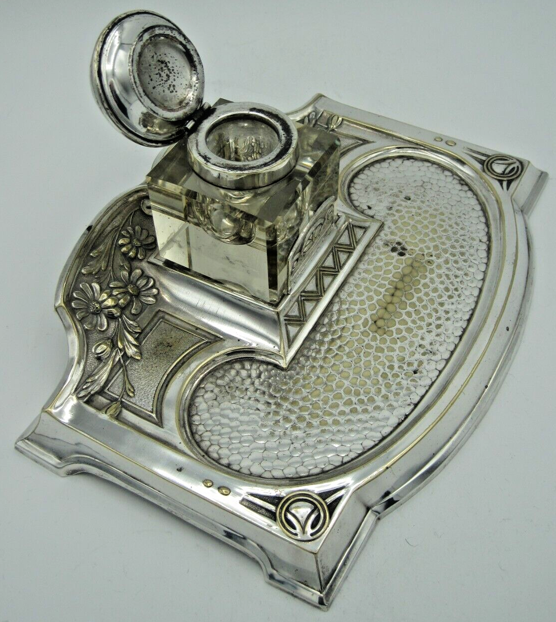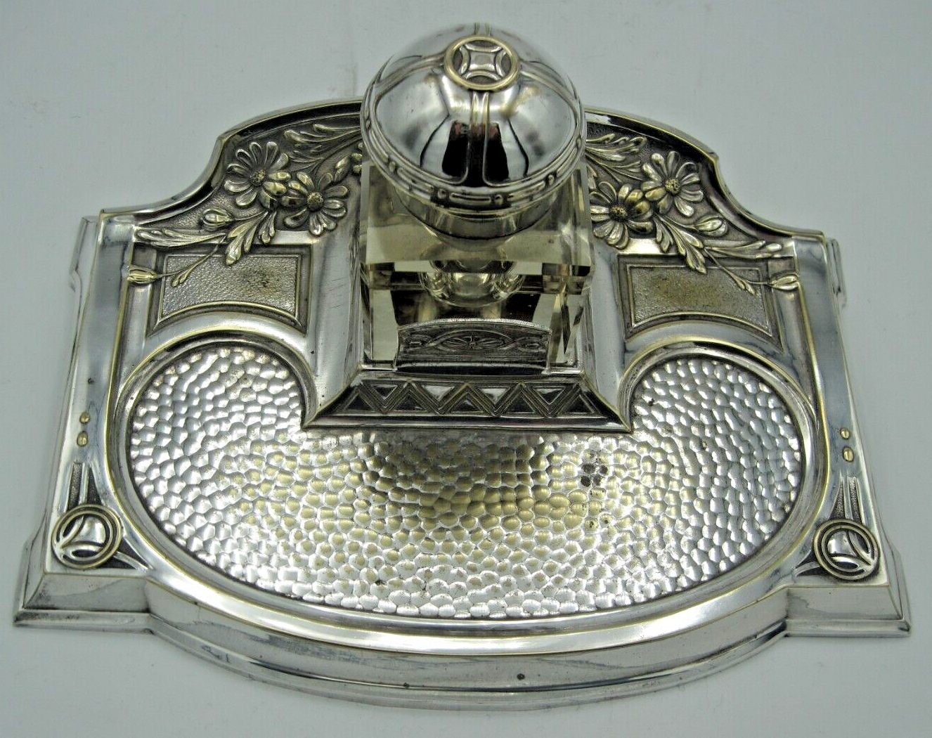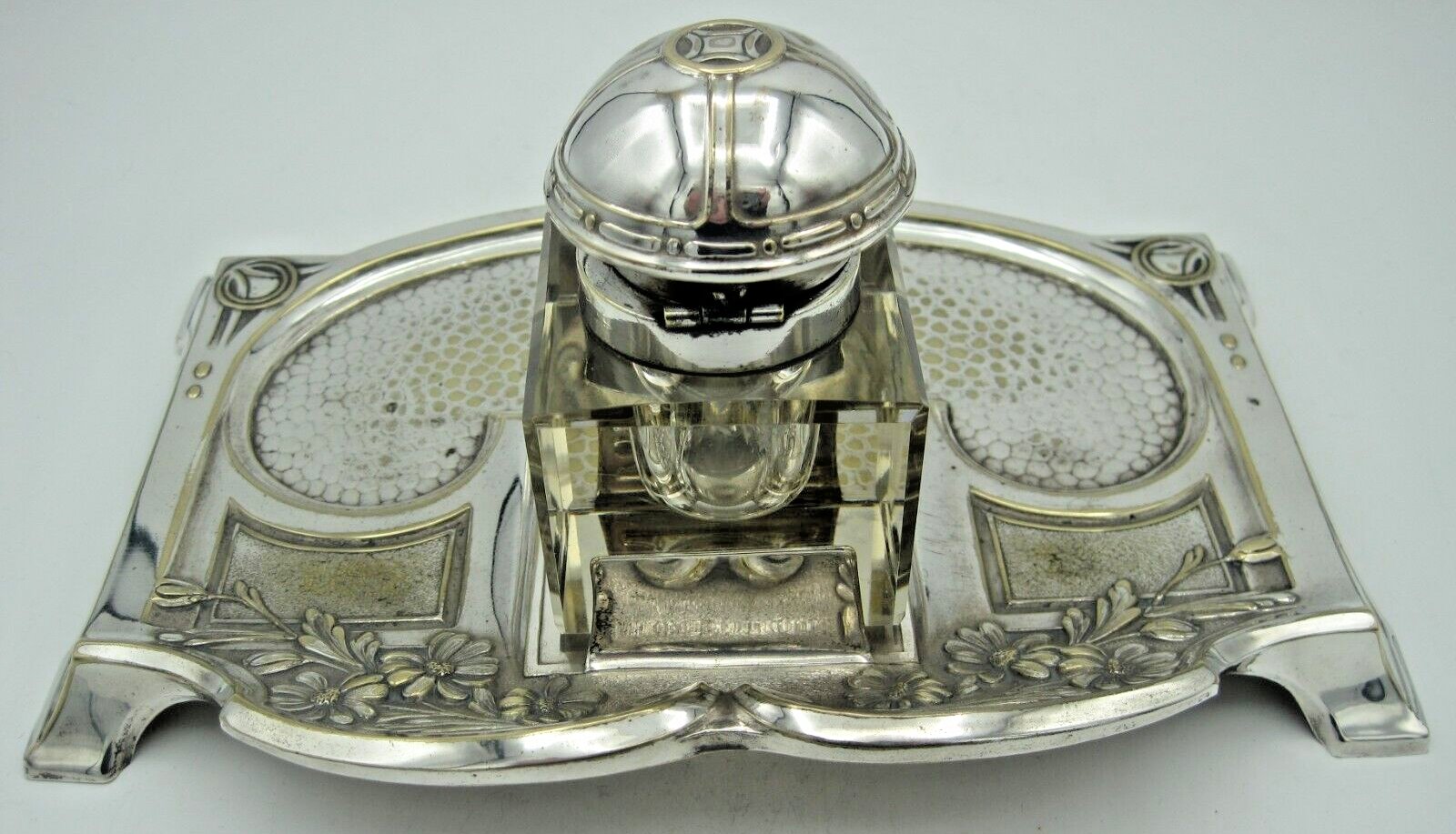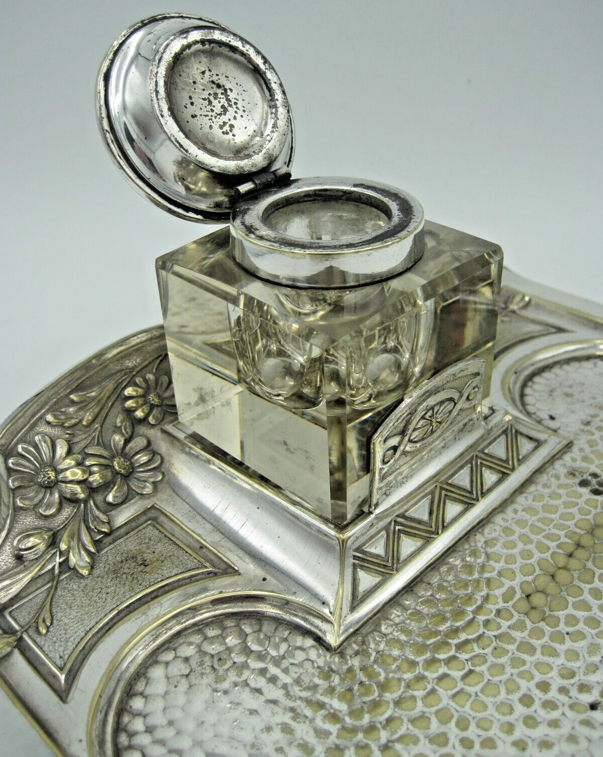 Silverplated inkstand containing a cut glass inkwell with a hinged dome cover.