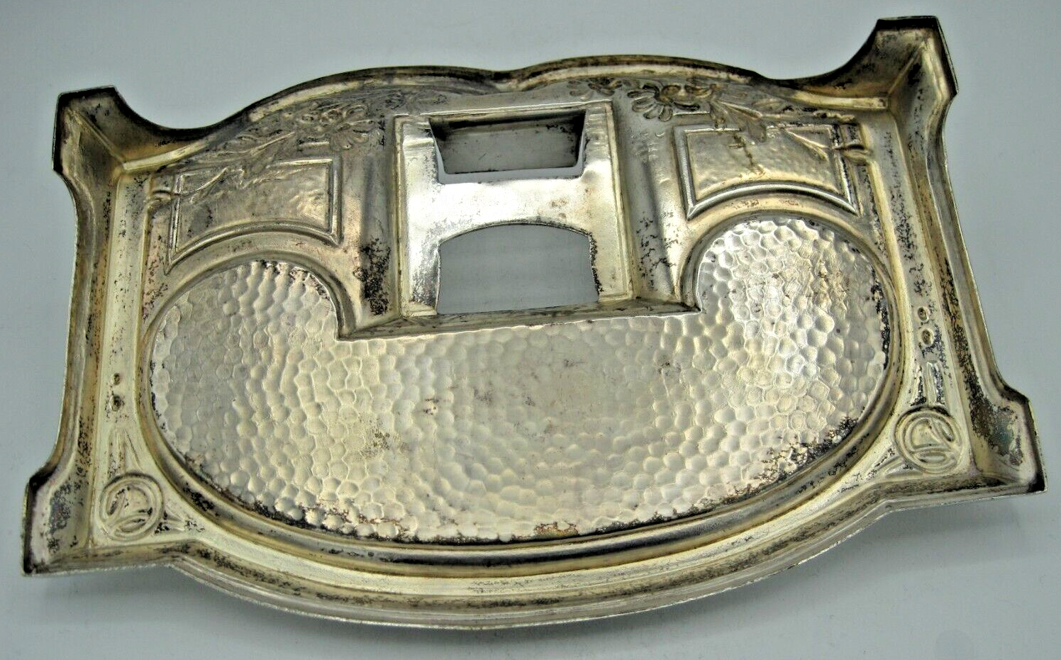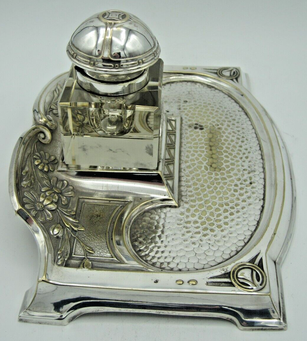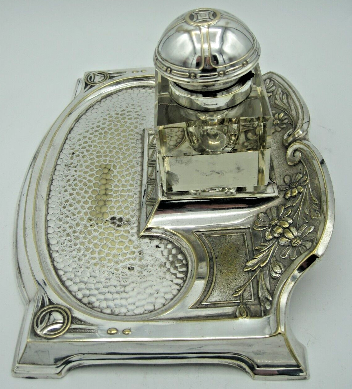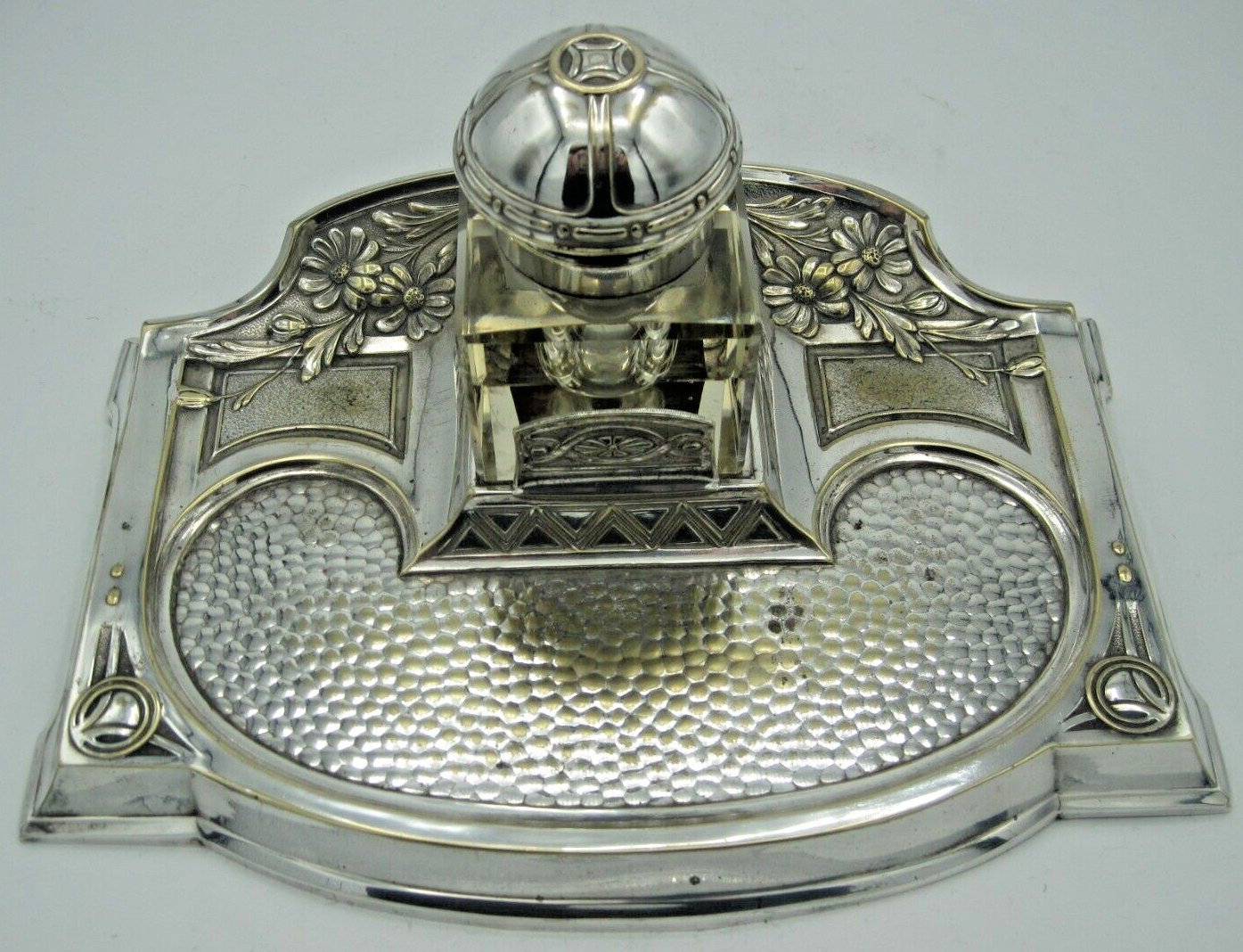 Silverplated inkstand containing a cut glass inkwell with a hinged dome cover.