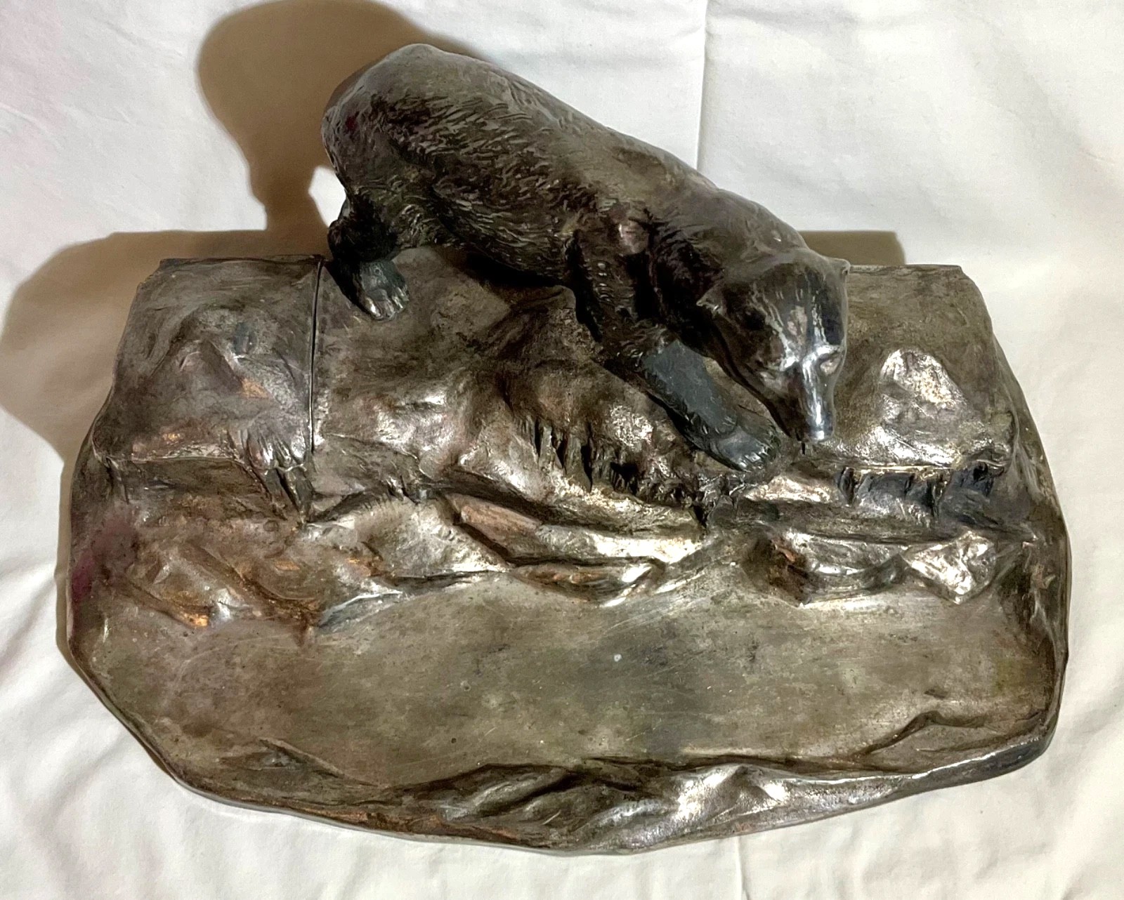 - The Sculpture: The centerpiece features a detailed polar bear climbing over a rocky, snow-like outcrop. The bear’s fur and the craggy texture of the terrain are realistically rendered in cast metal.
