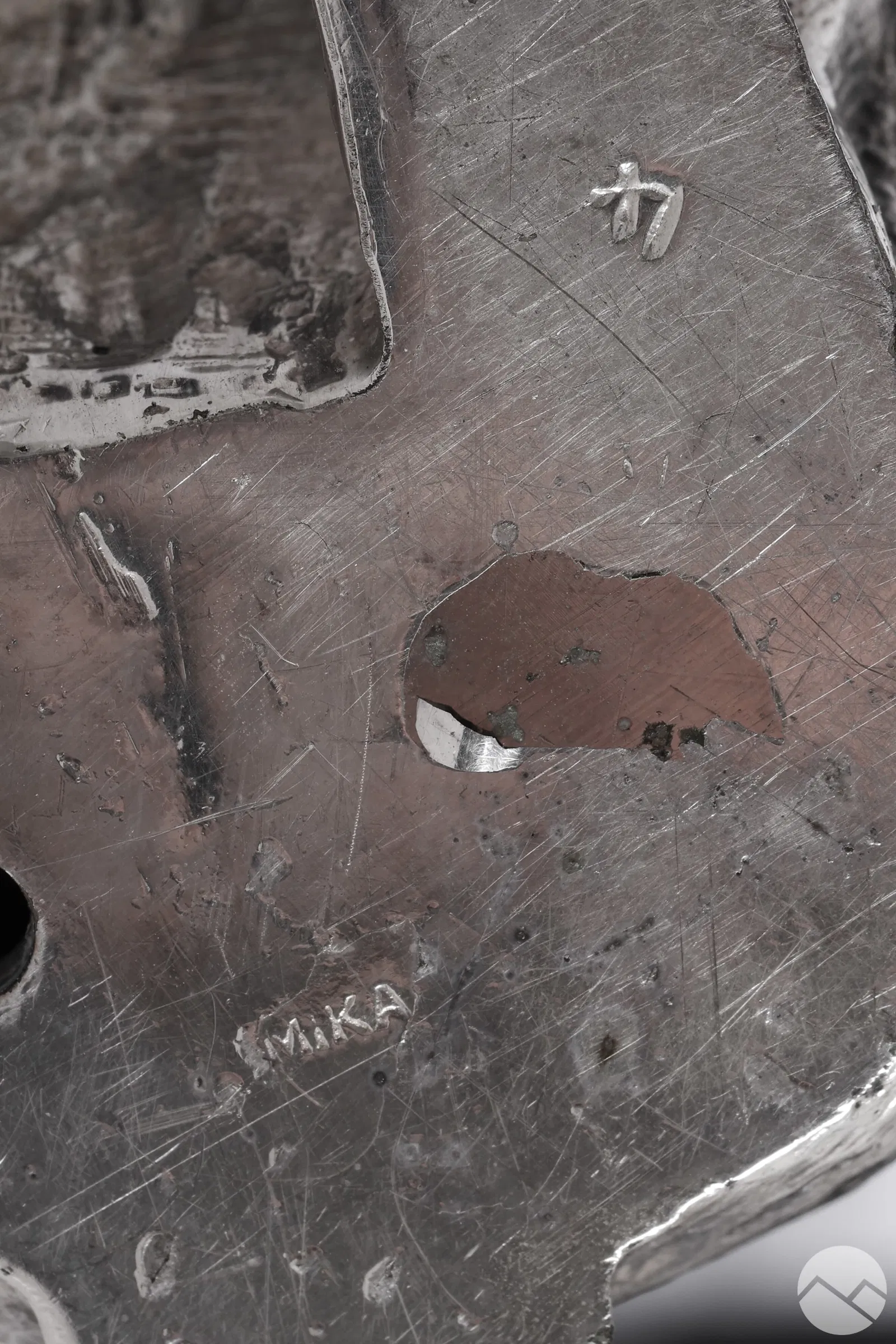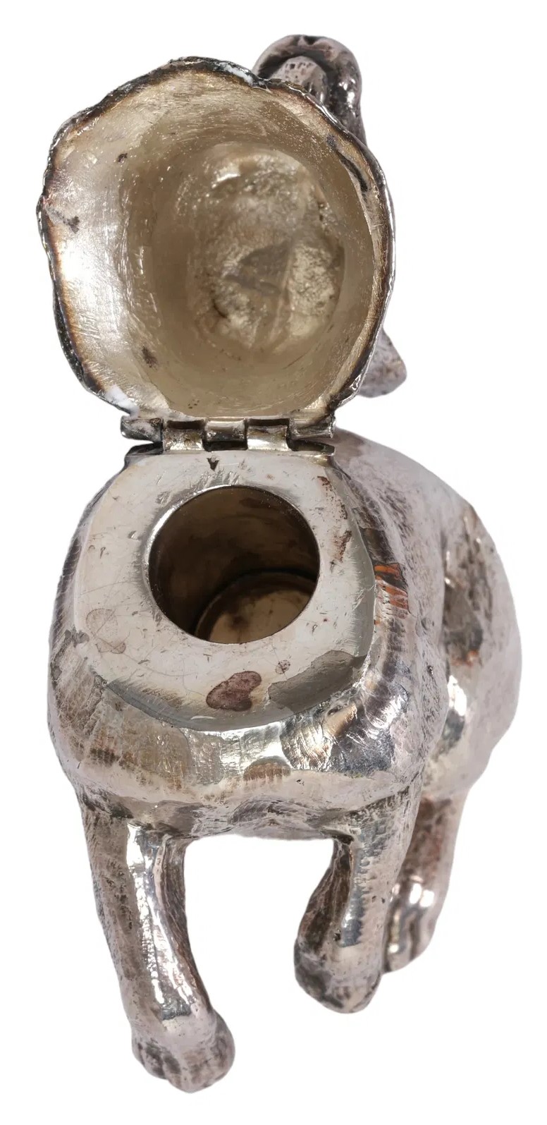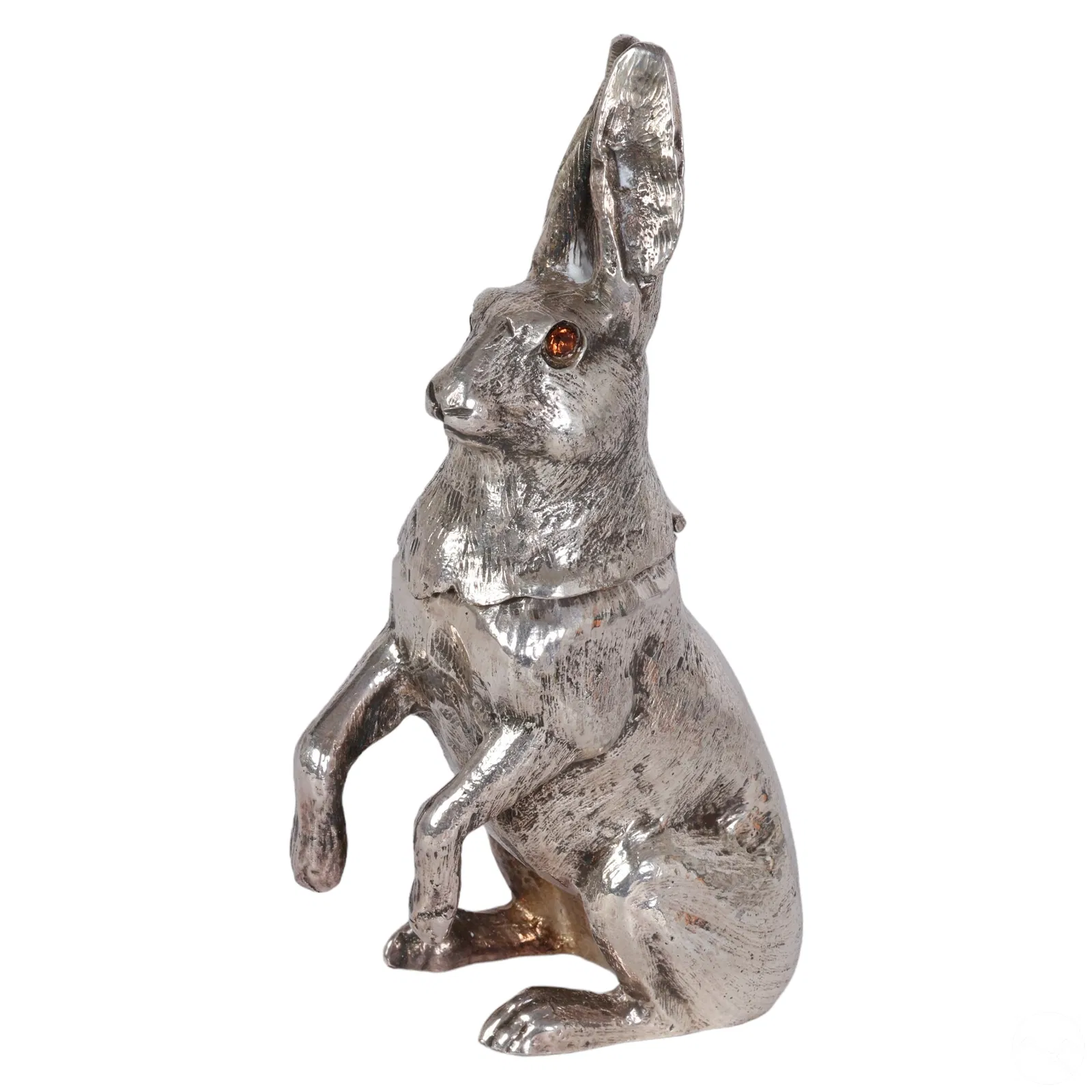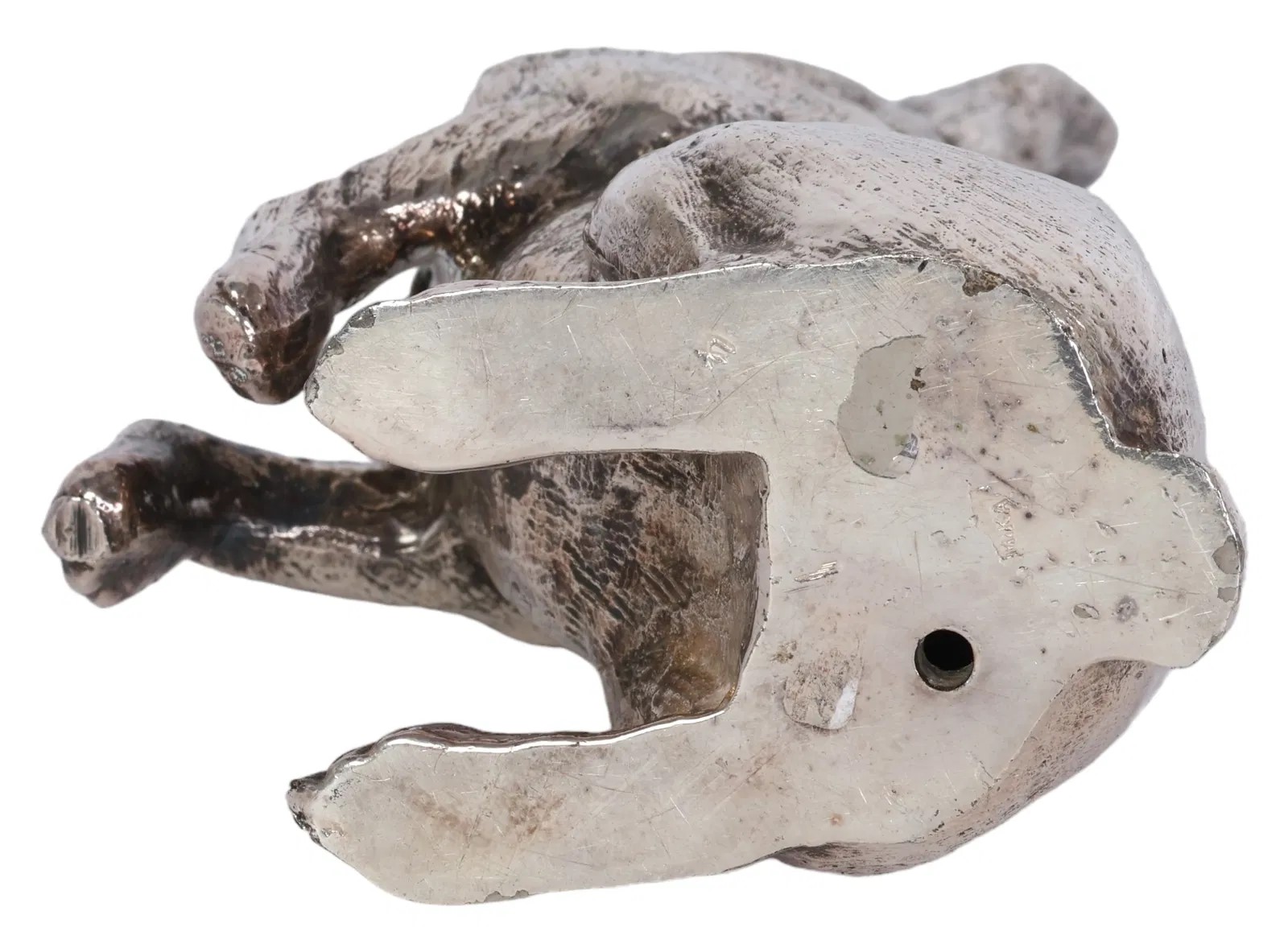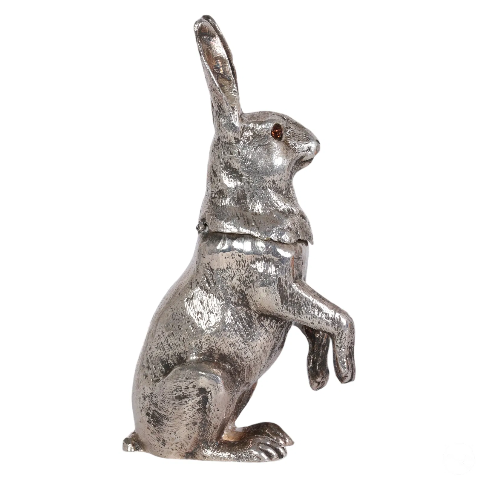 This figural silverplated inkwell features a rabbit sitting upright on its hind legs with its front paws raised. The rabbit’s fur is textured, and its eyes are made of faceted amber colored glass. The head of the rabbit is hinged, revealing the inkwell compartment inside (insert missing). The underside bears illegible stamps alongside a maker’s mark reading “MIKA”.