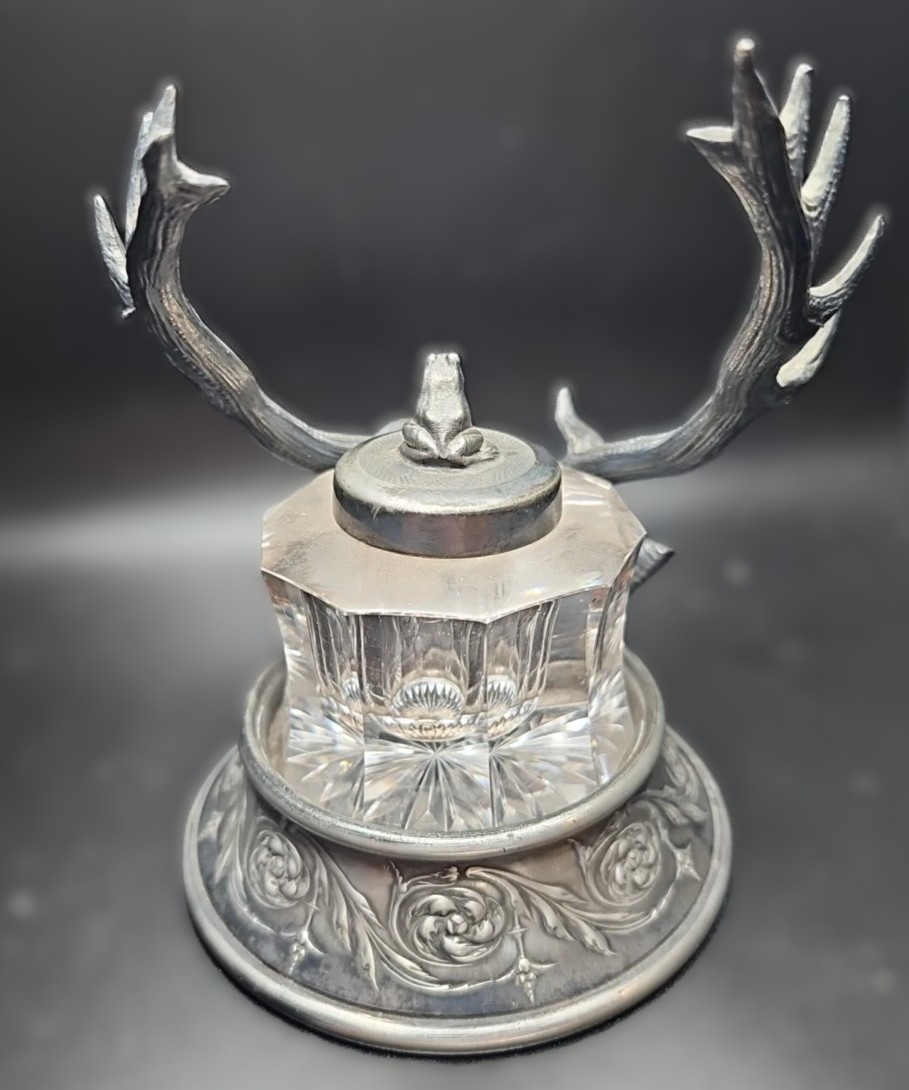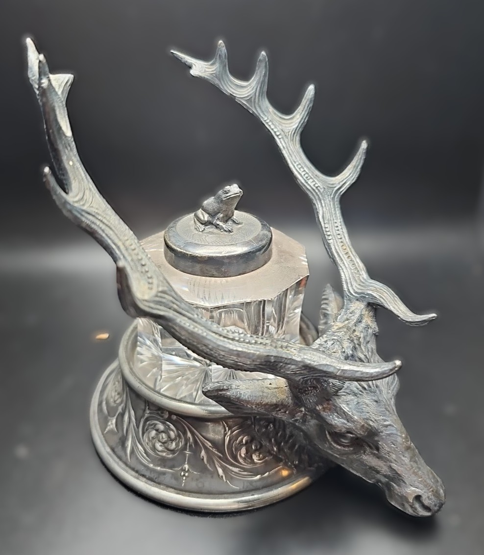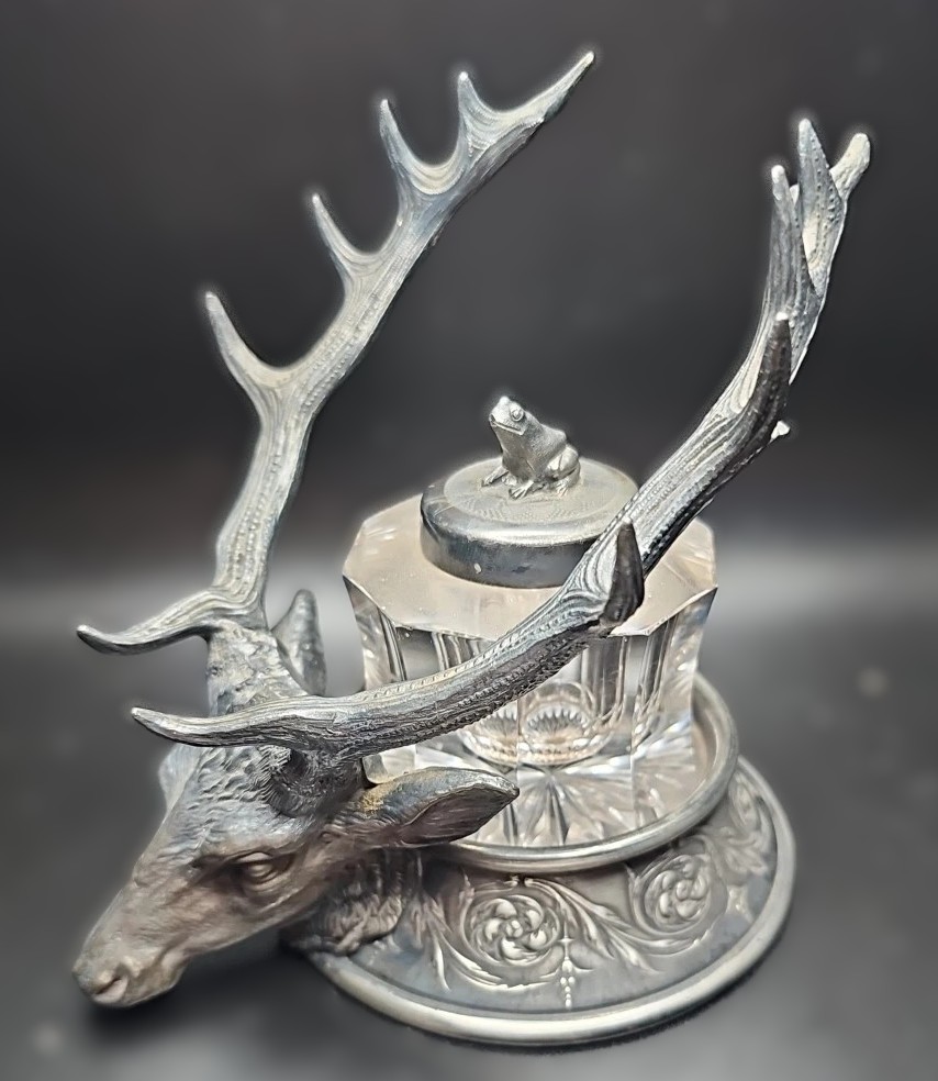 • Base and Stag’s Head: The main body of the inkstand consists of a shaped, contoured base, to which a detailed stag’s head is attached. The stag’s head is rendered realistically, with prominent eyes, a snout, and the textured fur of its neck. The entire metal structure of the inkstand, including the stag, base, and lid, is silver-plated.