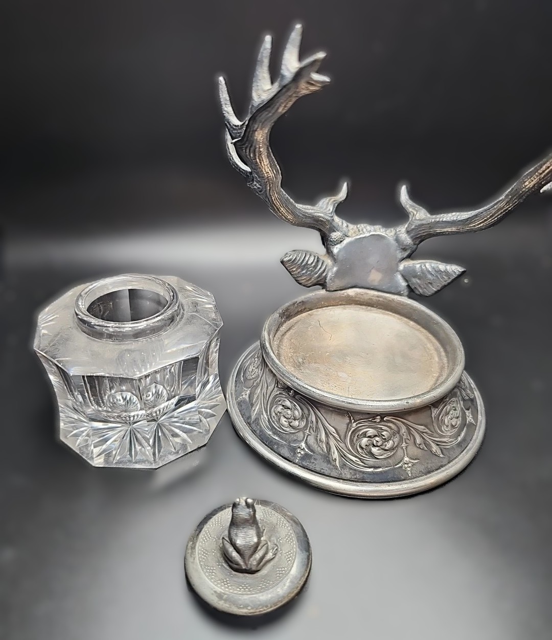The inkstand is primarily composed of silver-plated metal (as indicated by the mark), with a glass inkwell. The design features a stag and a froge.