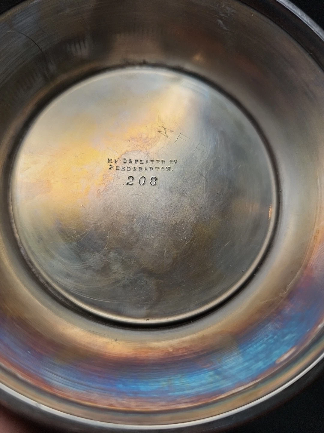 • Reed & Barton: This mark definitively identifies the manufacturer as Reed & Barton, a highly reputable American silversmith and metalware company. Founded in 1824 in Taunton, Massachusetts, Reed & Barton became one of the leading American producers of silver-plated (and sterling silver) hollowware, flatware, and decorative items. The “MF’D & PLATED” inscription specifically indicates that the piece is a base metal that has been silver-plated, a common and popular process for their extensive line of goods. The company was renowned for its quality craftsmanship and diverse designs.