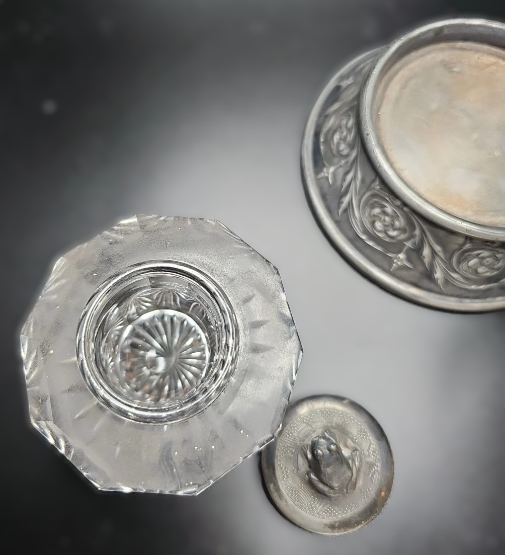 • Inkwell Lid with Frog Finial: The inkwell is covered by a metal lid (matching the silver-plated base), which is not attached by a hinge and simply lifts off. Serving as the handle for this lid is a sculpted frog figure, depicted in a squatting pose.