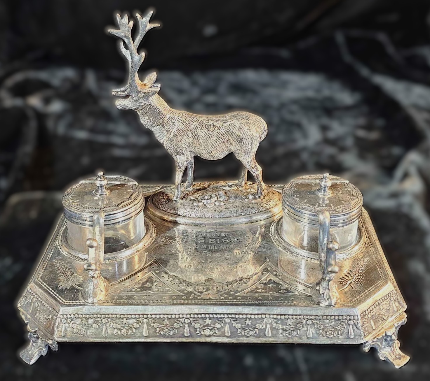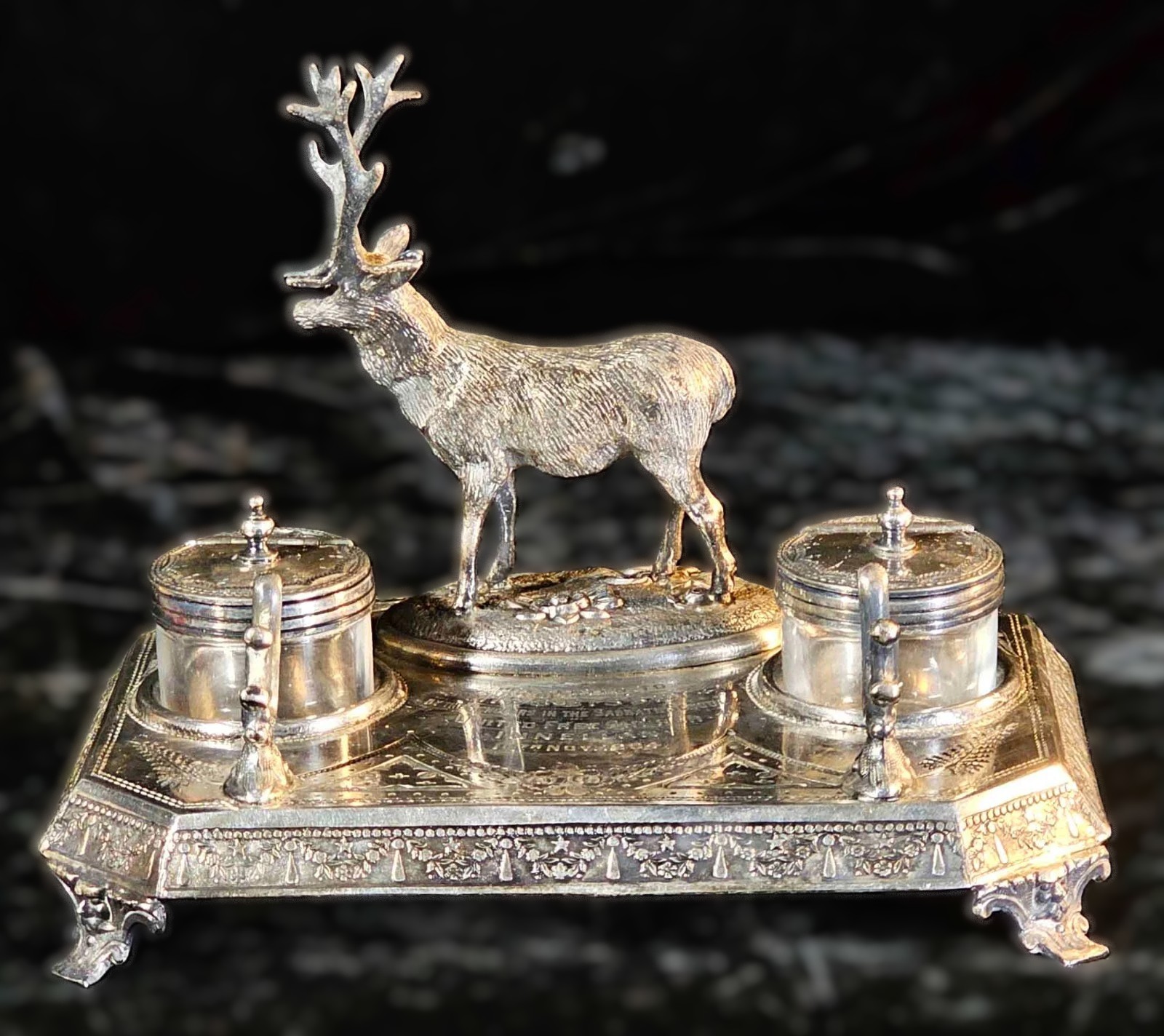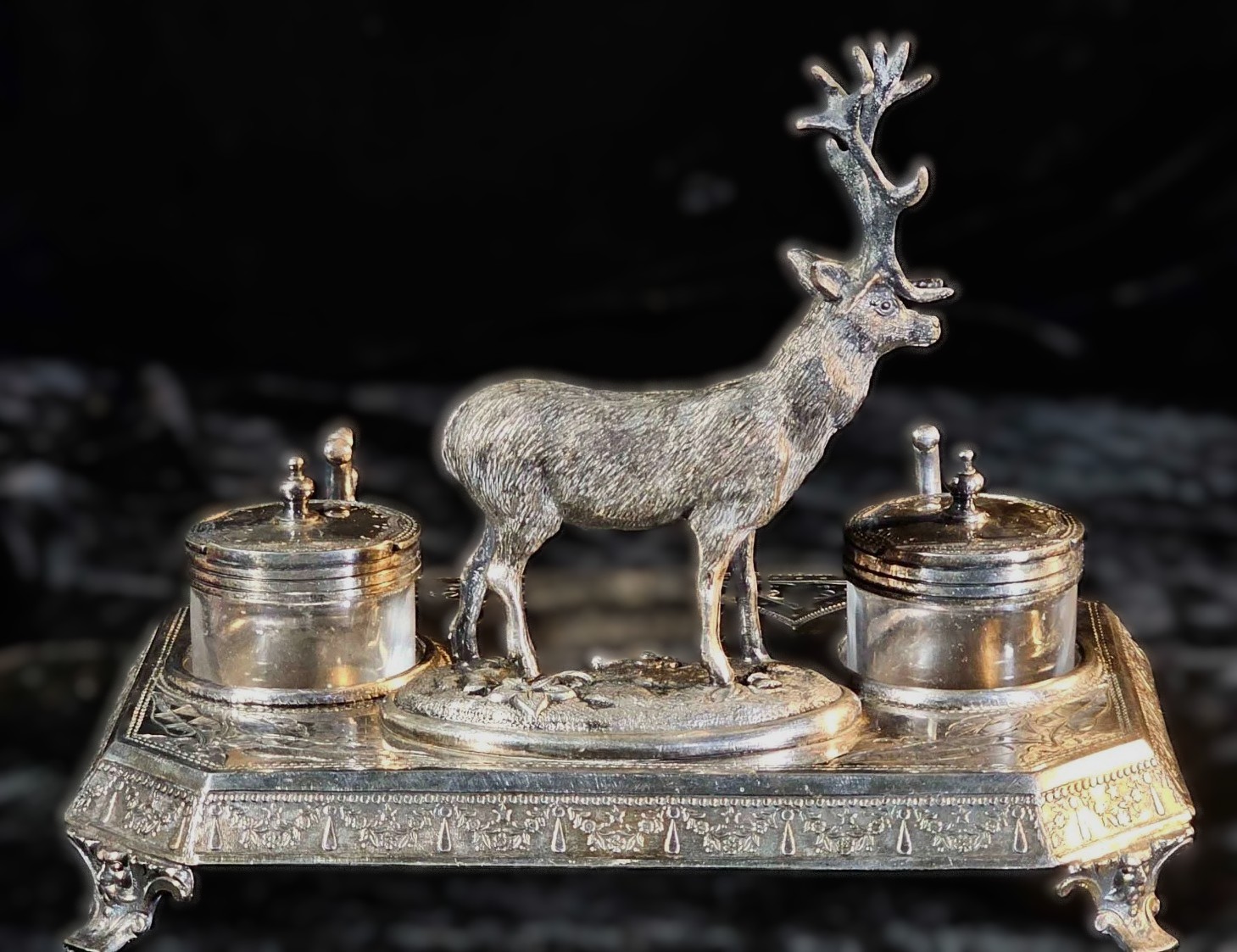 To see a similar version of this inkstand, see this Inkipedia listing: Silverplated Standish with Stag – The Society of Inkwell Collectors (SOIC)
