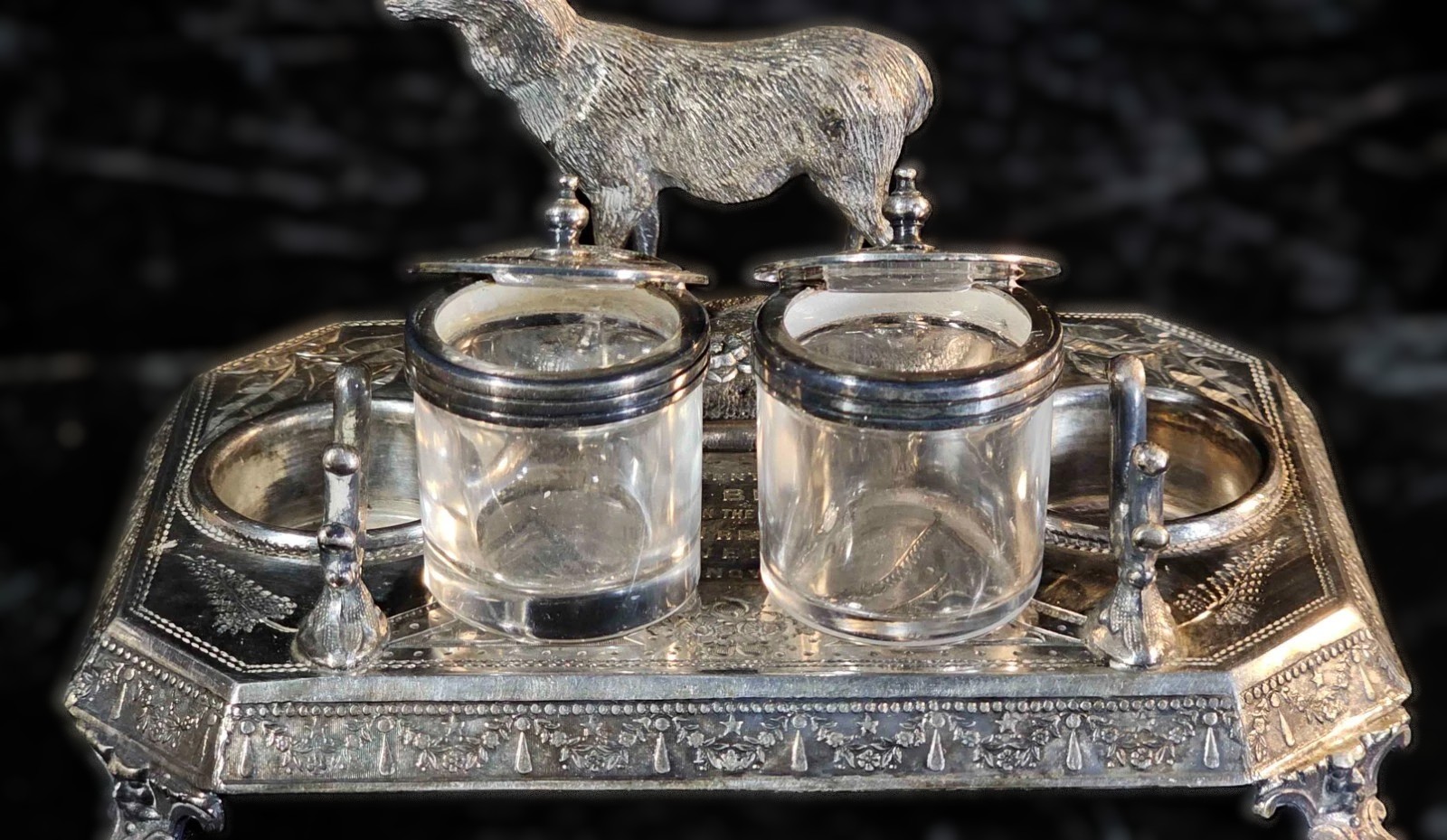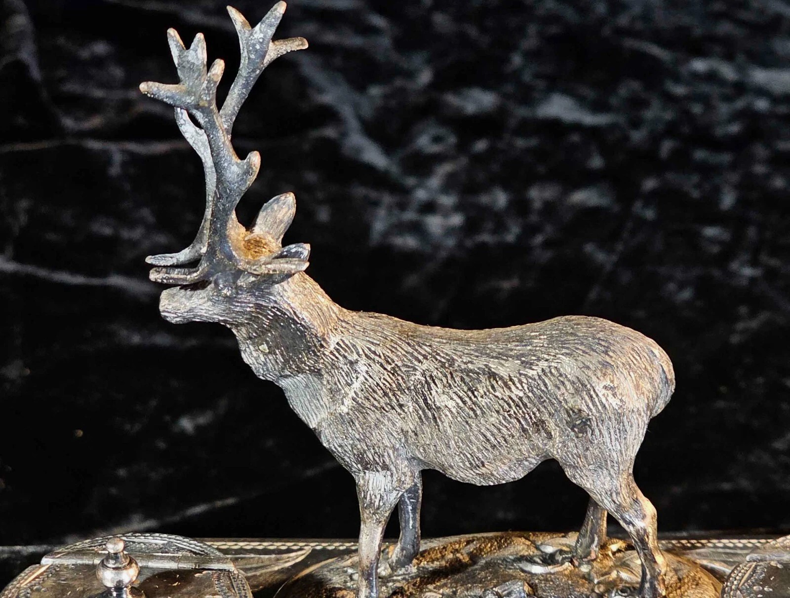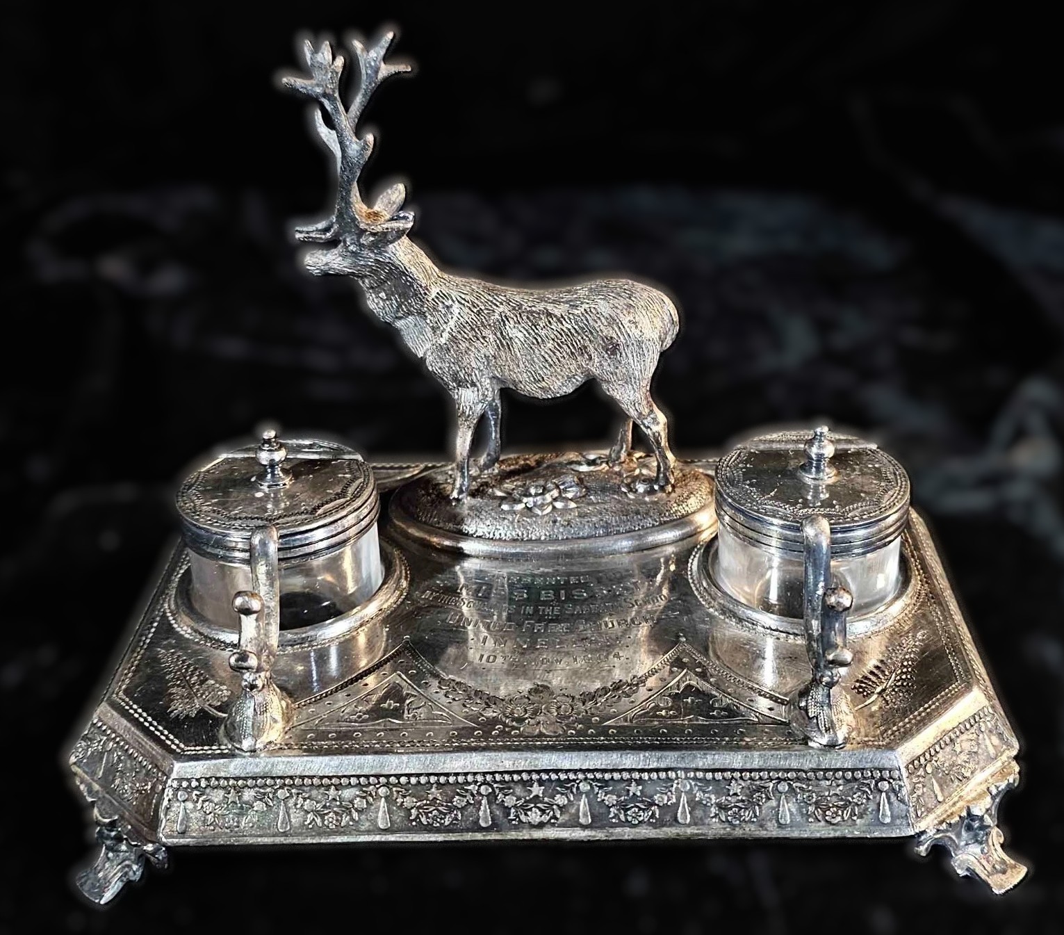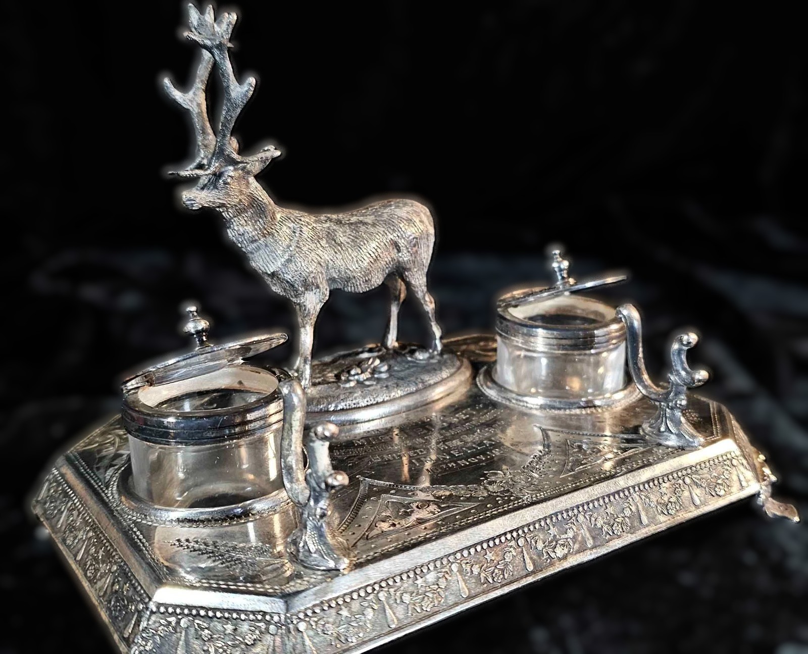To see a similar version of this inkstand, see this Inkipedia listing: Silverplated Standish with Stag – The Society of Inkwell Collectors (SOIC)