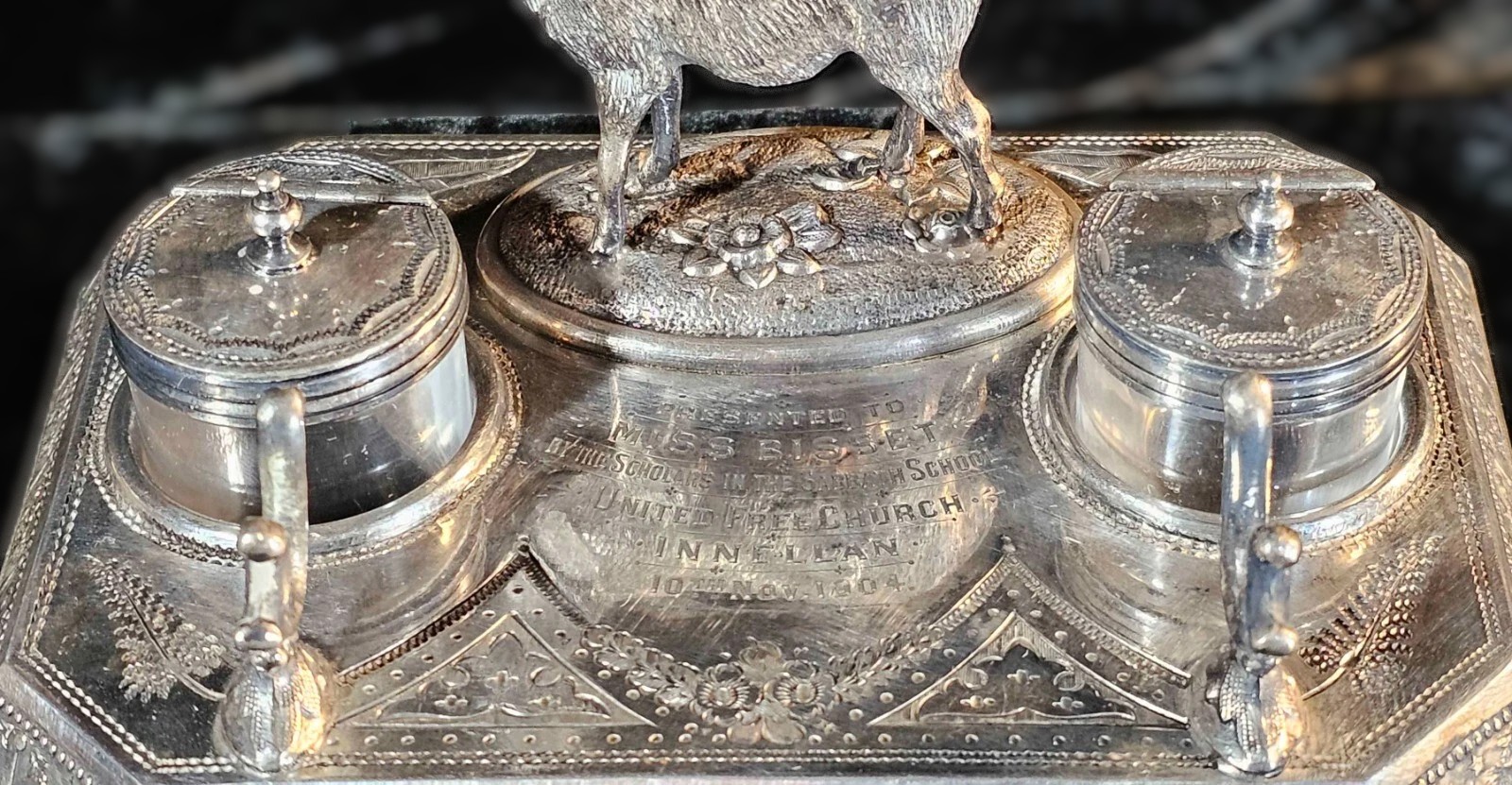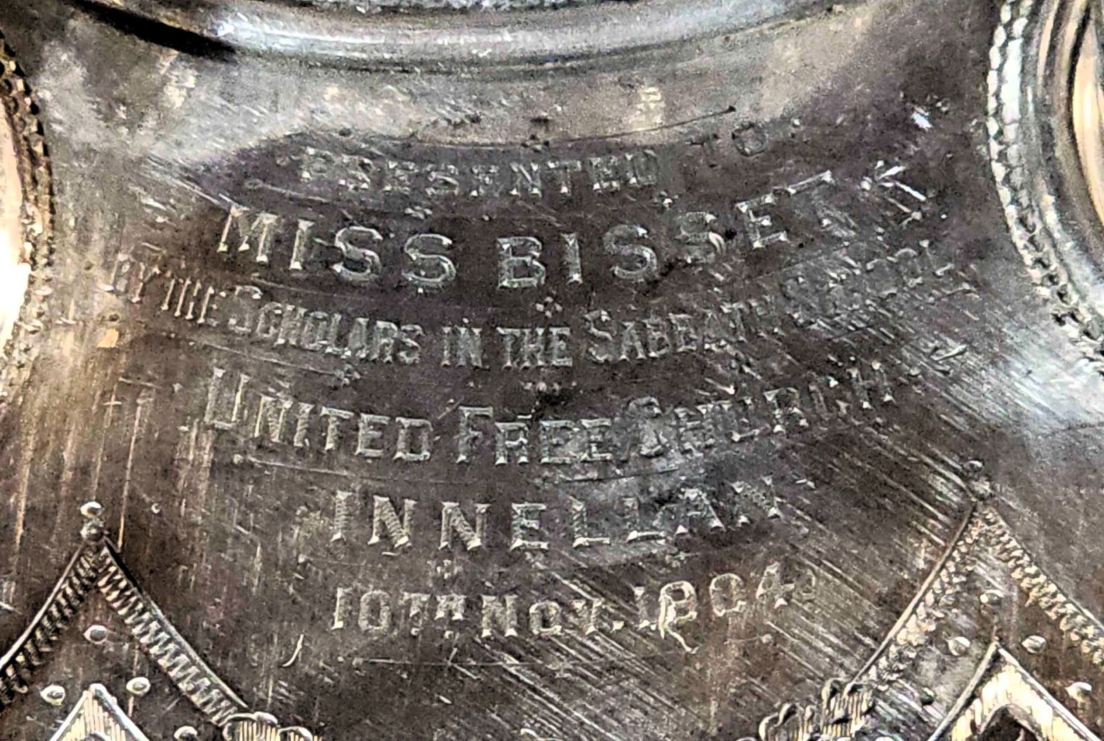 - Engraving: The inscription on the base, “Presented to Miss Besset / By the scholars in the Sabbath School / United Free Church / Innellan / 10th Nov 1904”, provides historical context. Innellan is a village in Argyll and Bute, Scotland. The engraving identifies the piece as a presentation award given to a Miss Besset by her students at a Sunday school, dating it to November 10, 1904. The United Free Church was a major Presbyterian denomination in Scotland at the time.