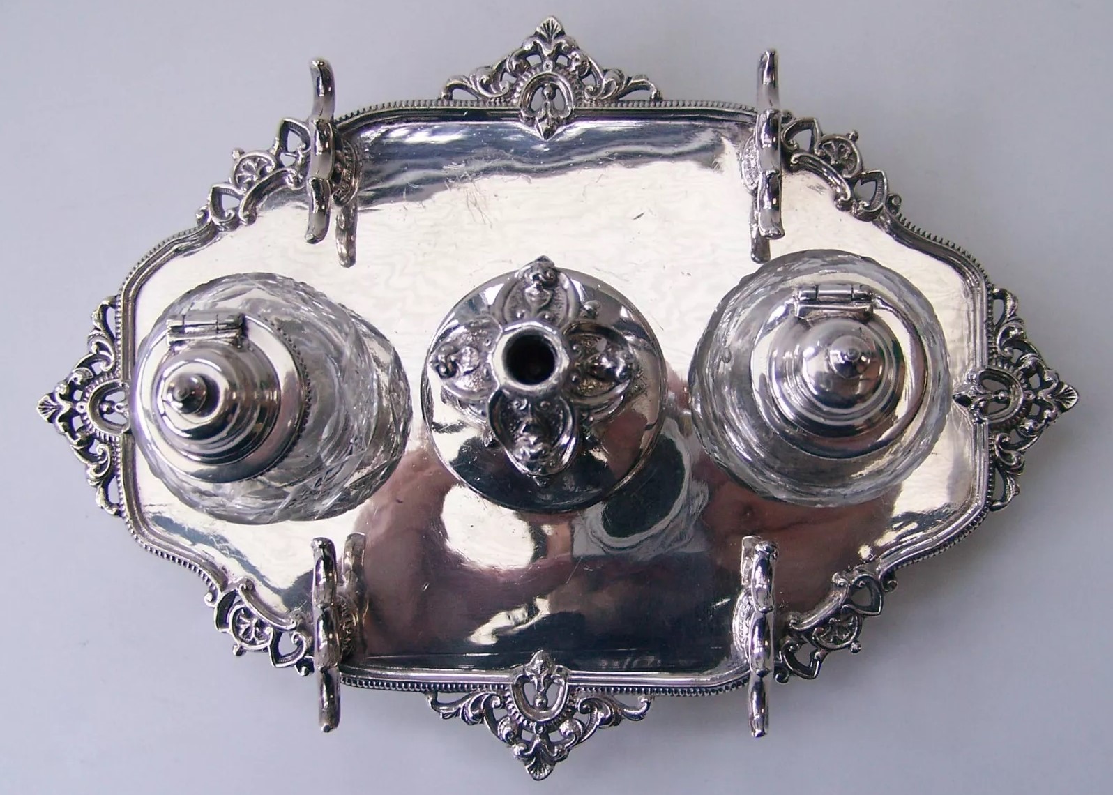 Note: this inkstand dates to between 1856 and 1900. The “& Sons” was added to the name in 1856, with the firm becoming “Ltd” in1900.