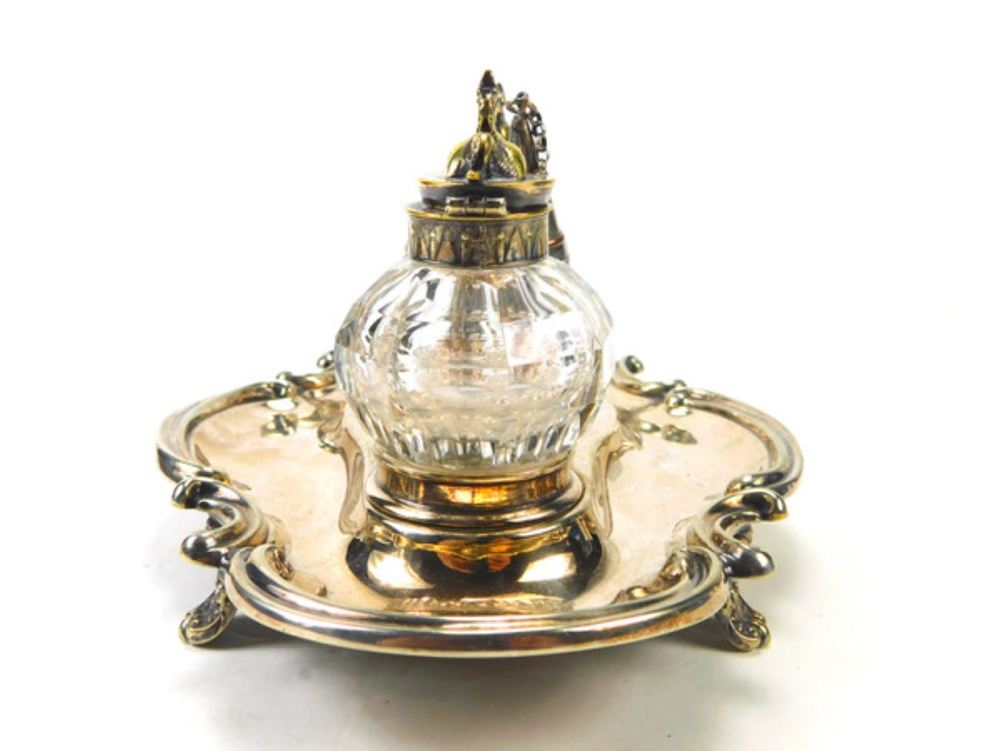 This inkstand represents the height of the British Empire’s fascination with international design. As a silver-plated object by a premier Sheffield maker, it was designed as a “statement piece” that offered the luxurious look and heavy feel of solid silver while remaining practical for daily use on a busy correspondence desk.