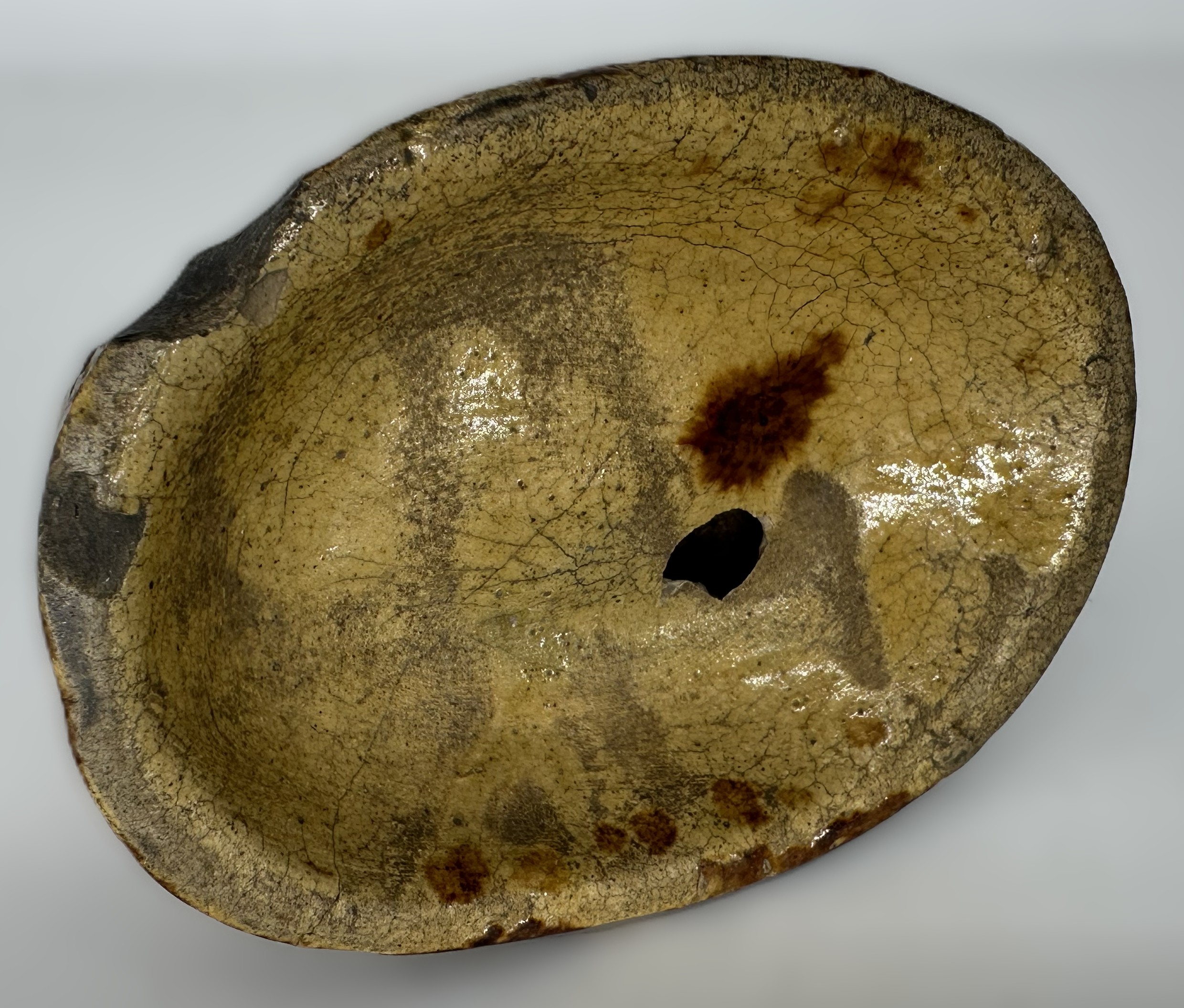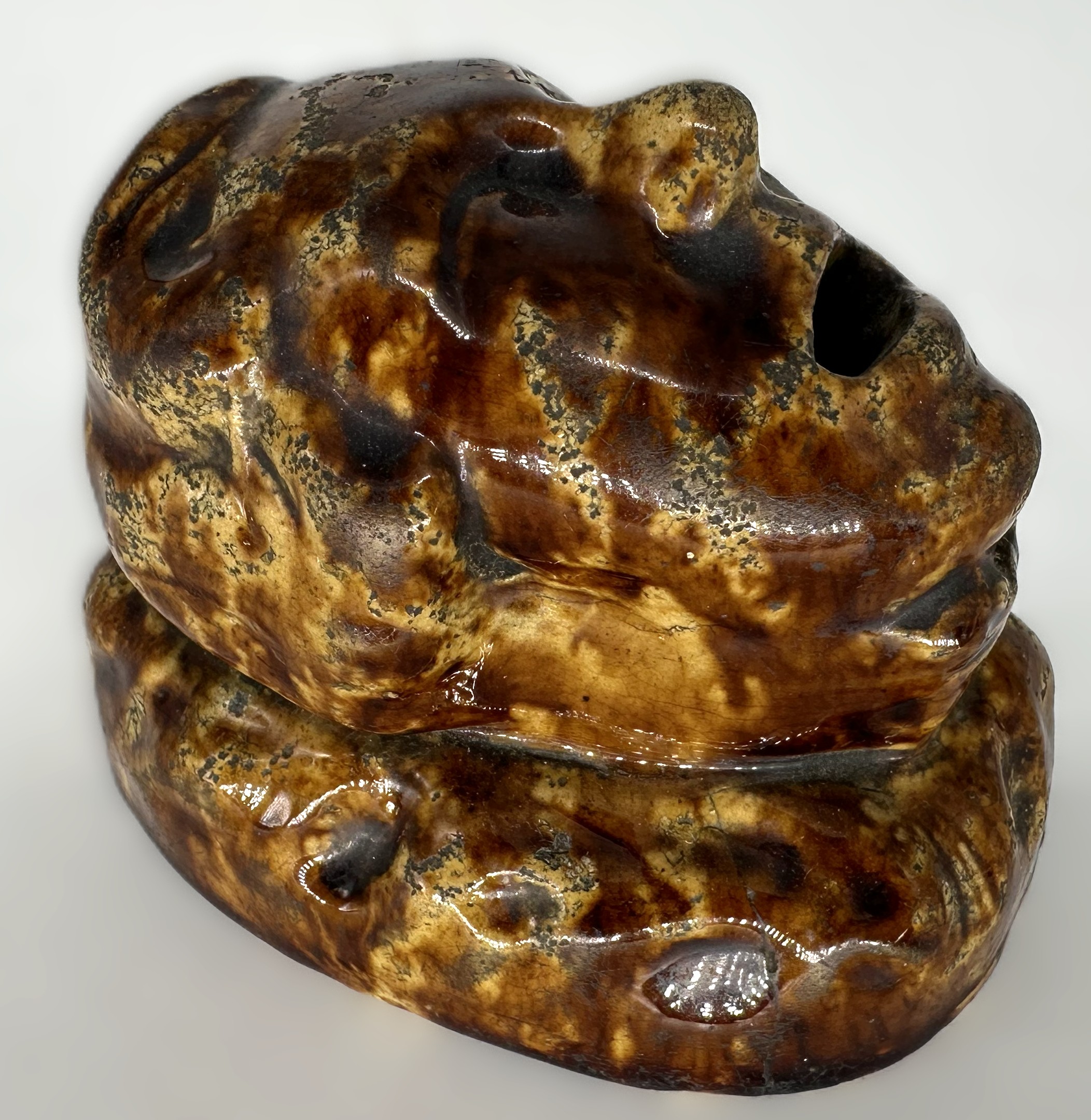 - Material and Glaze: The inkwell is made of earthenware or a buff-colored stoneware (similar to yellowware). It is covered in a Rockingham glaze, characterized by its mottled, streaky brown, and dark ochre coloration. The worn glaze reveals the lighter clay body beneath, consistent with age and use.