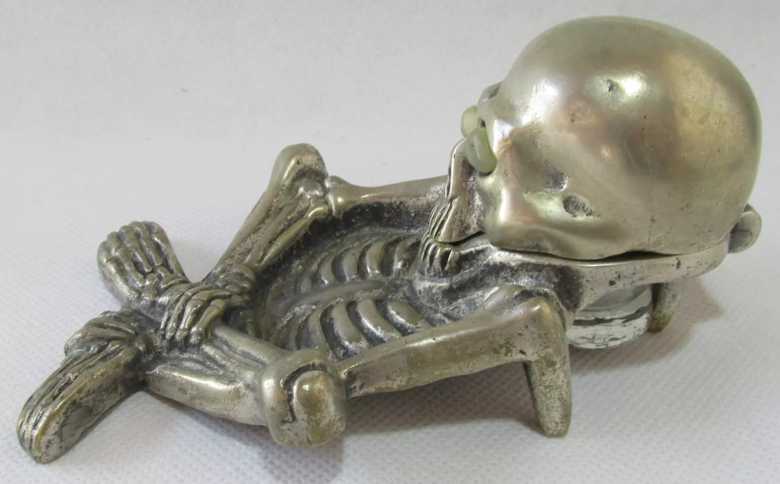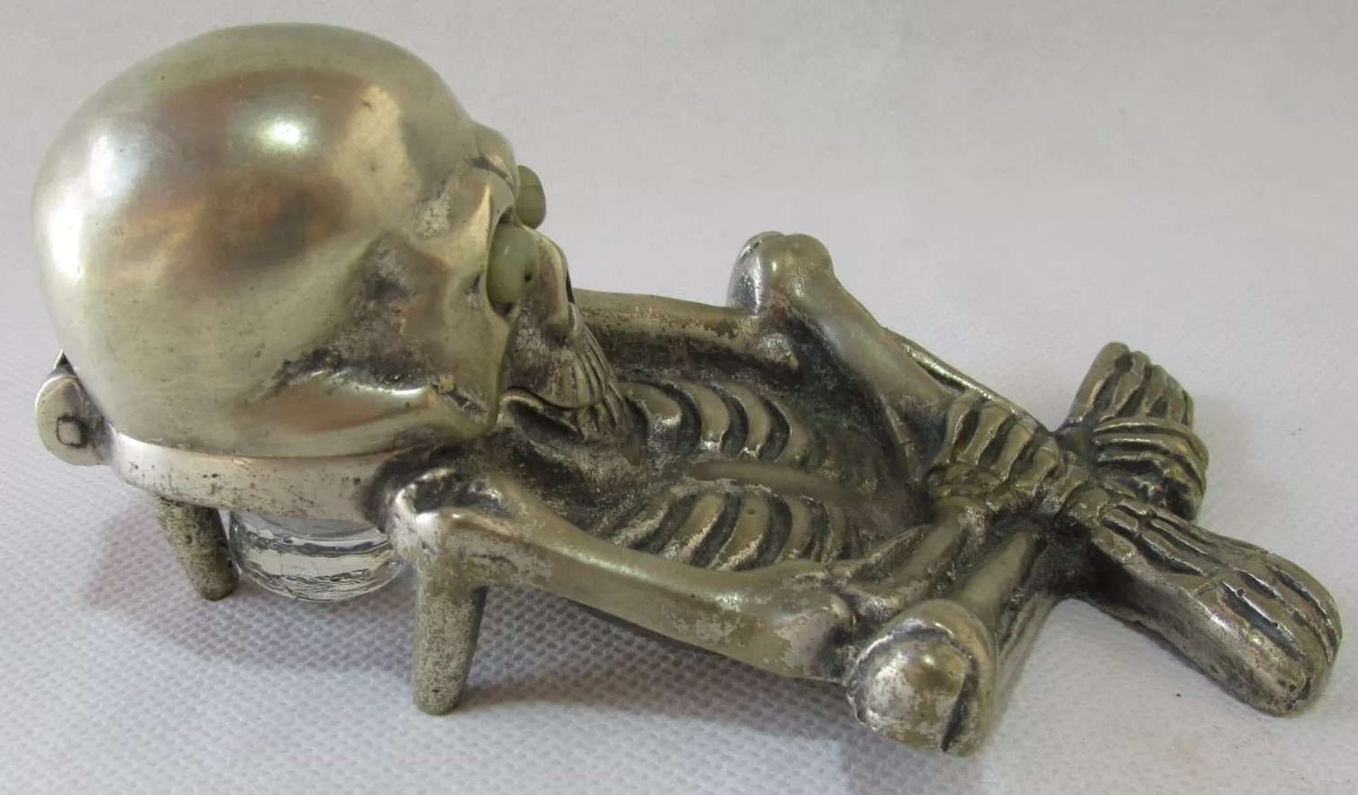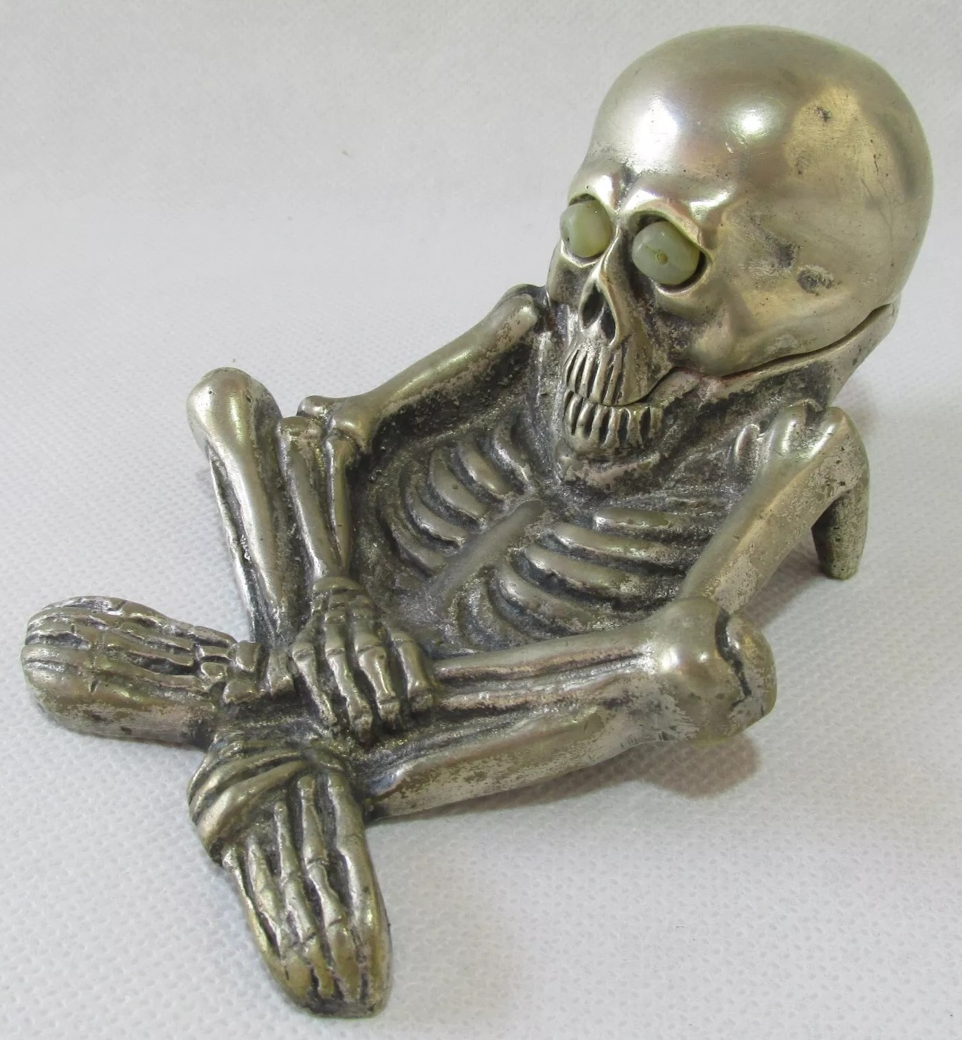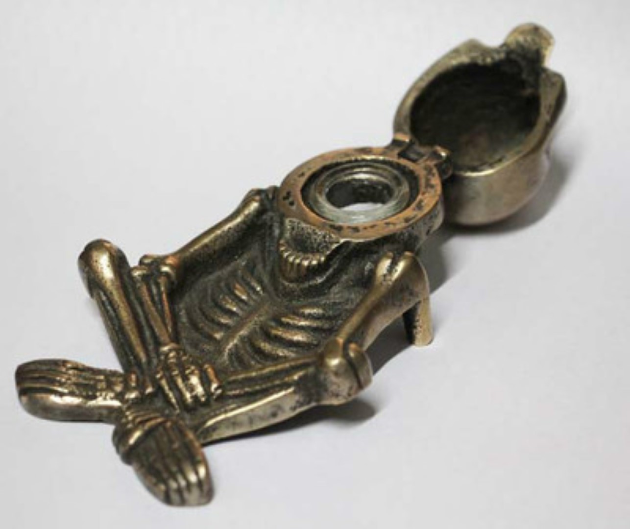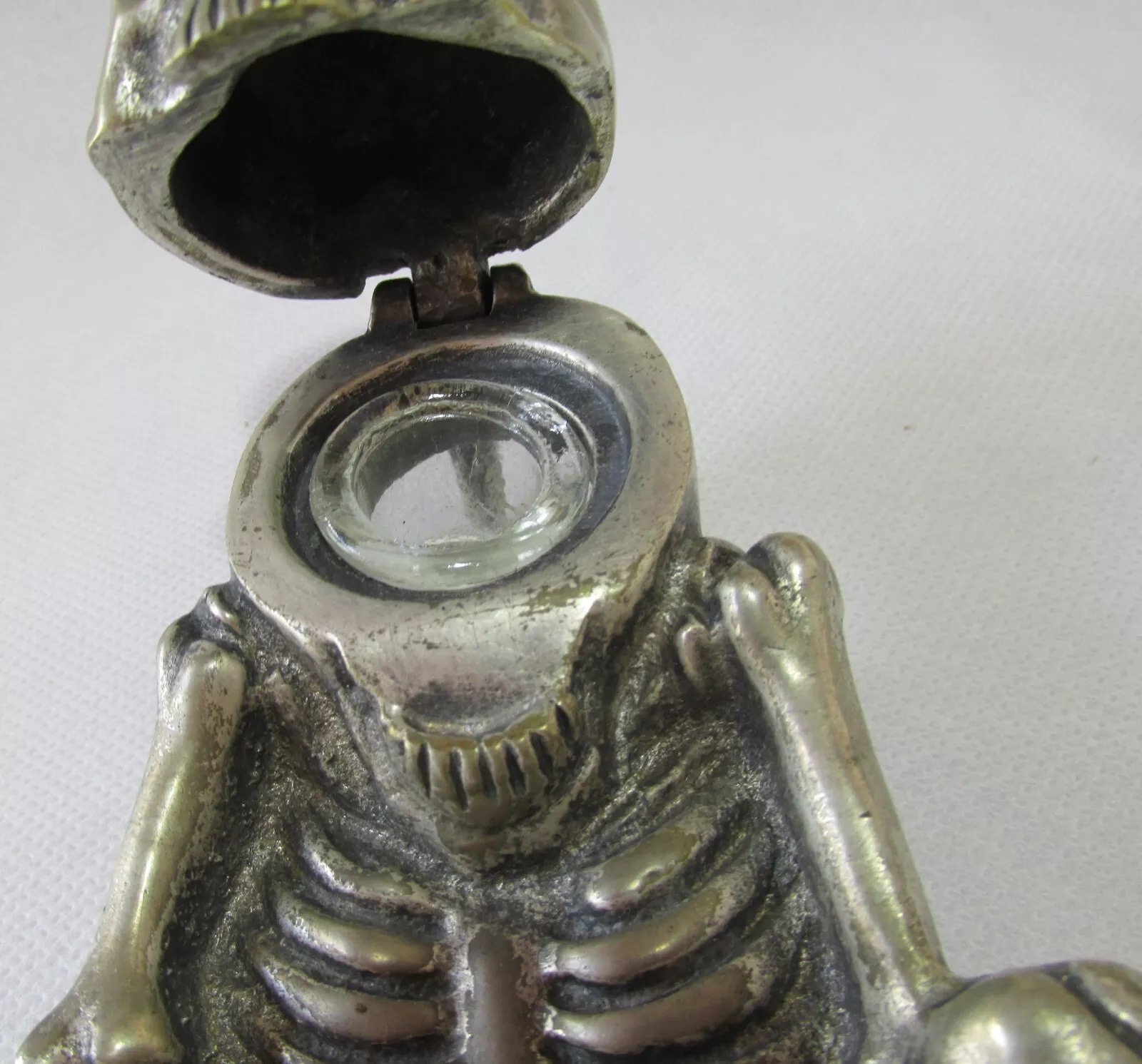 This figural inkwell features a skeleton seated with its knees bent upwards, creating a convenient space to rest a pen. The skull of the skeleton opens to reveal the inkwell inside.