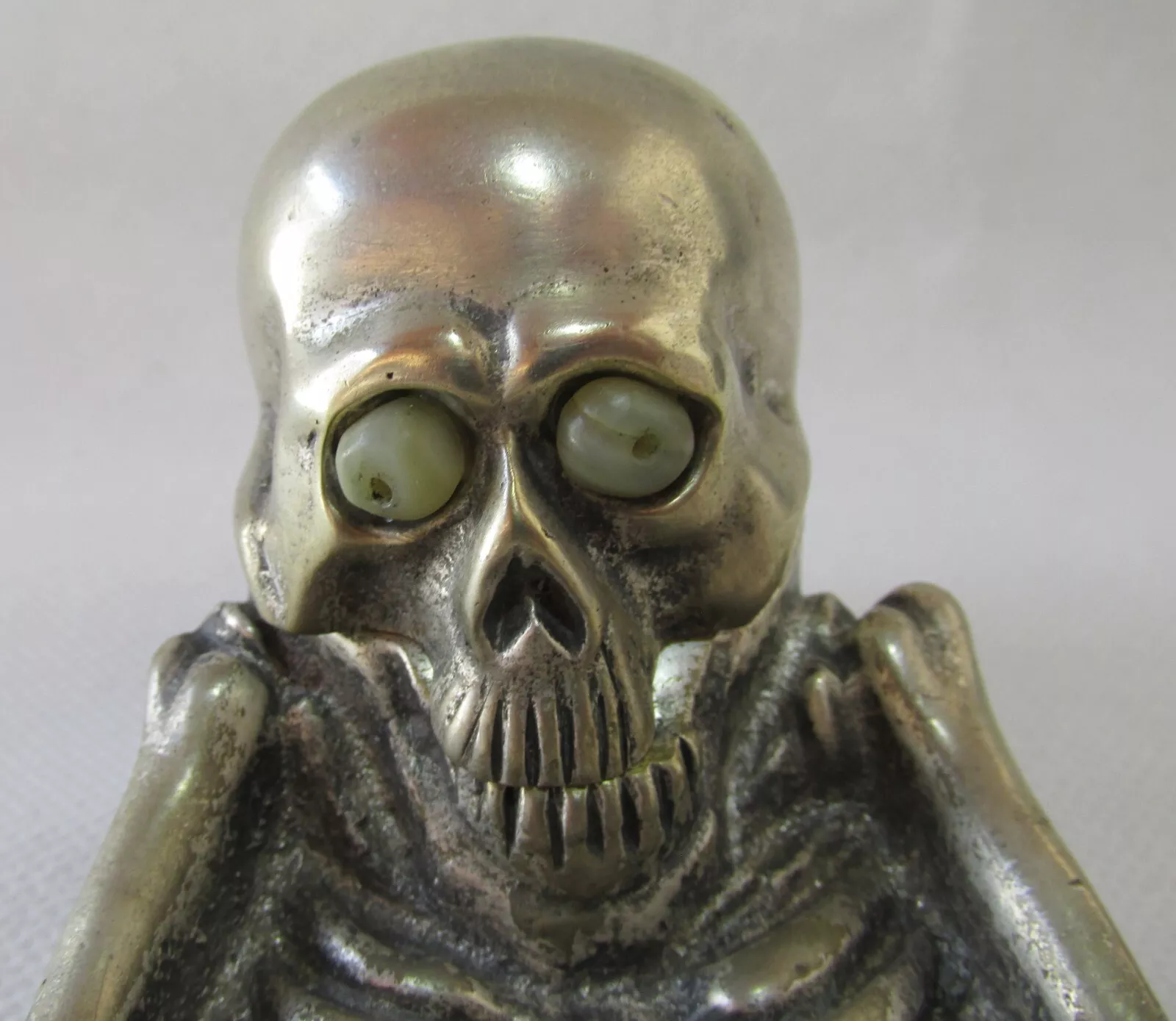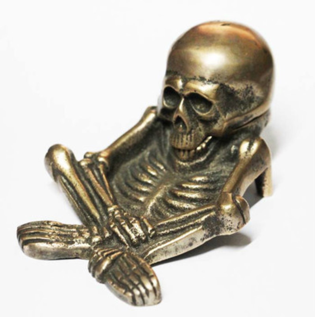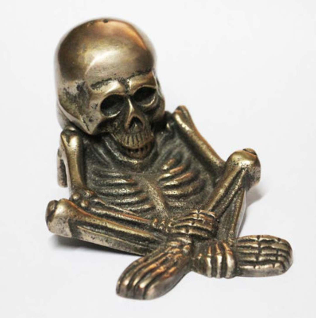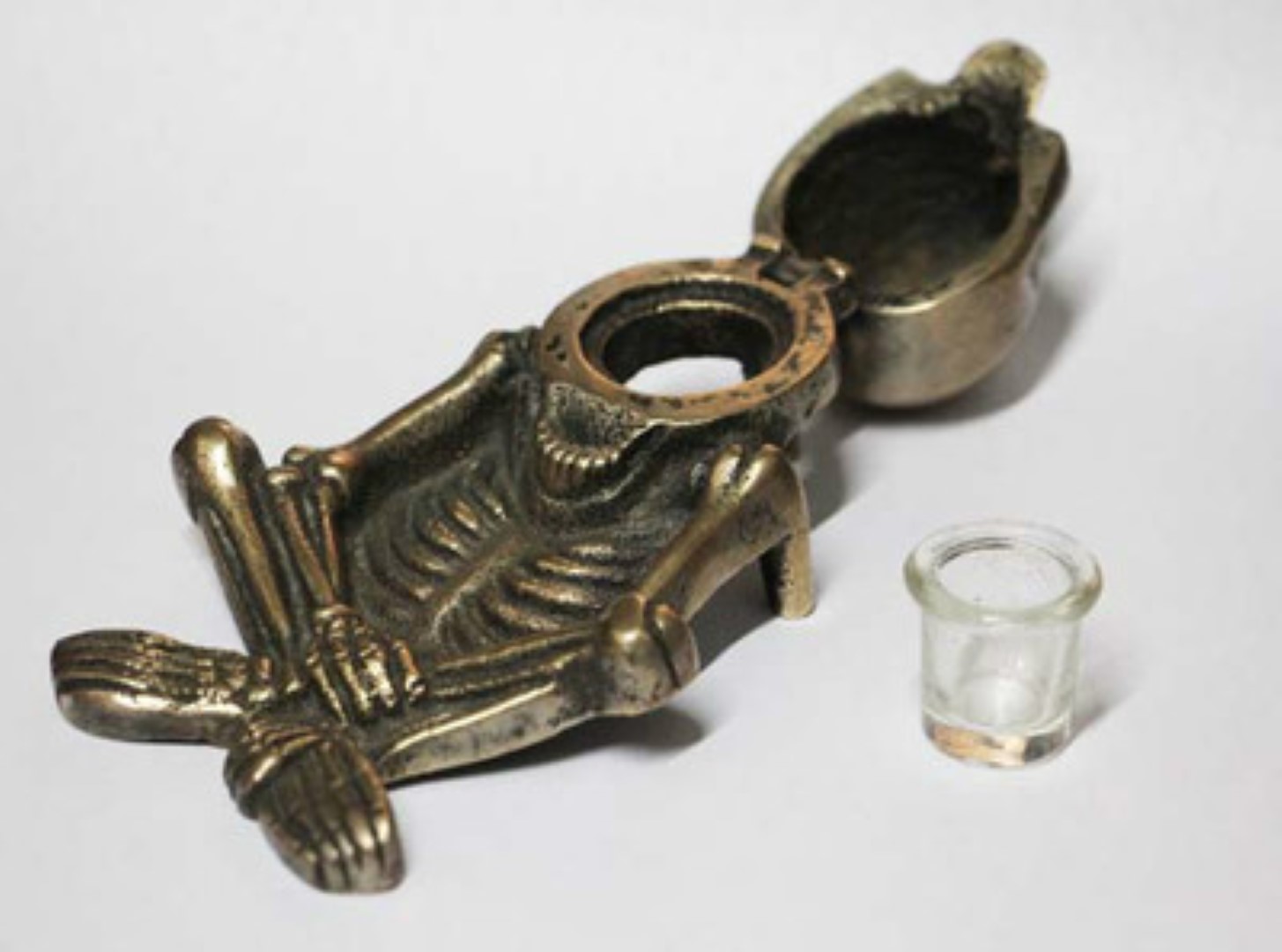 This figural inkwell features a skeleton seated with its knees bent upwards, creating a convenient space to rest a pen. The skull of the skeleton opens to reveal the inkwell inside.