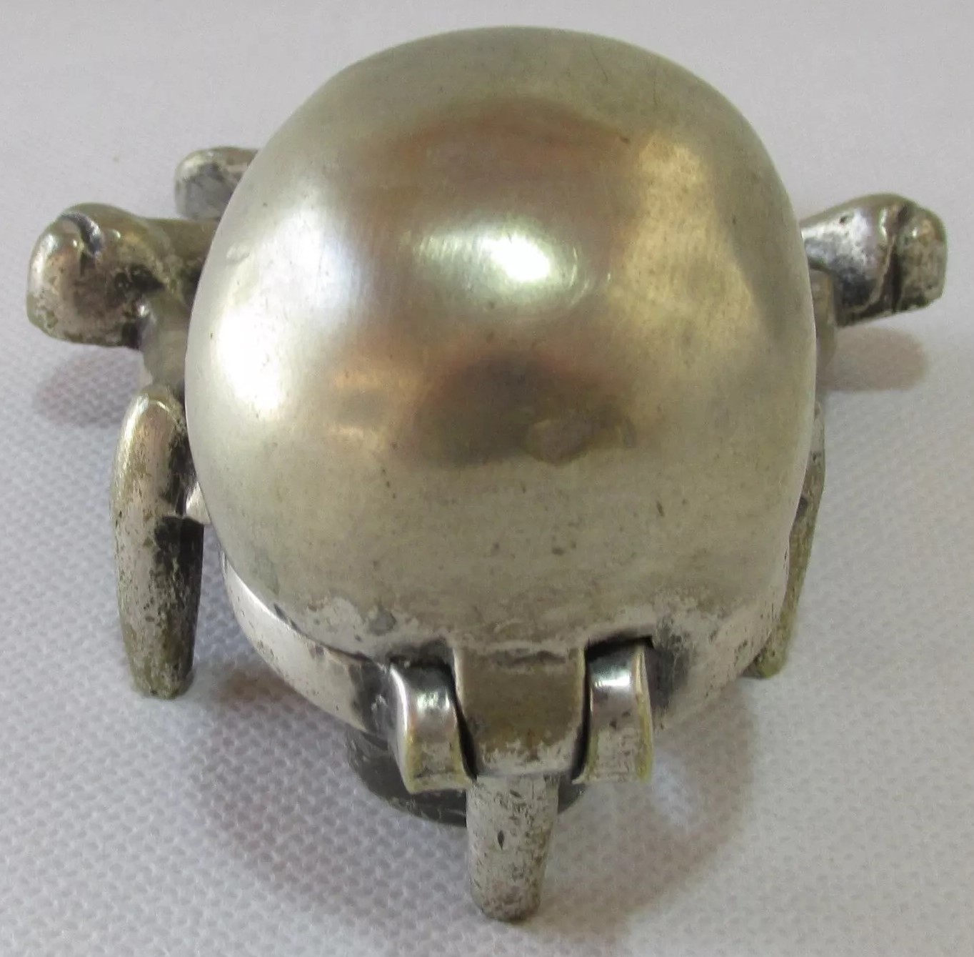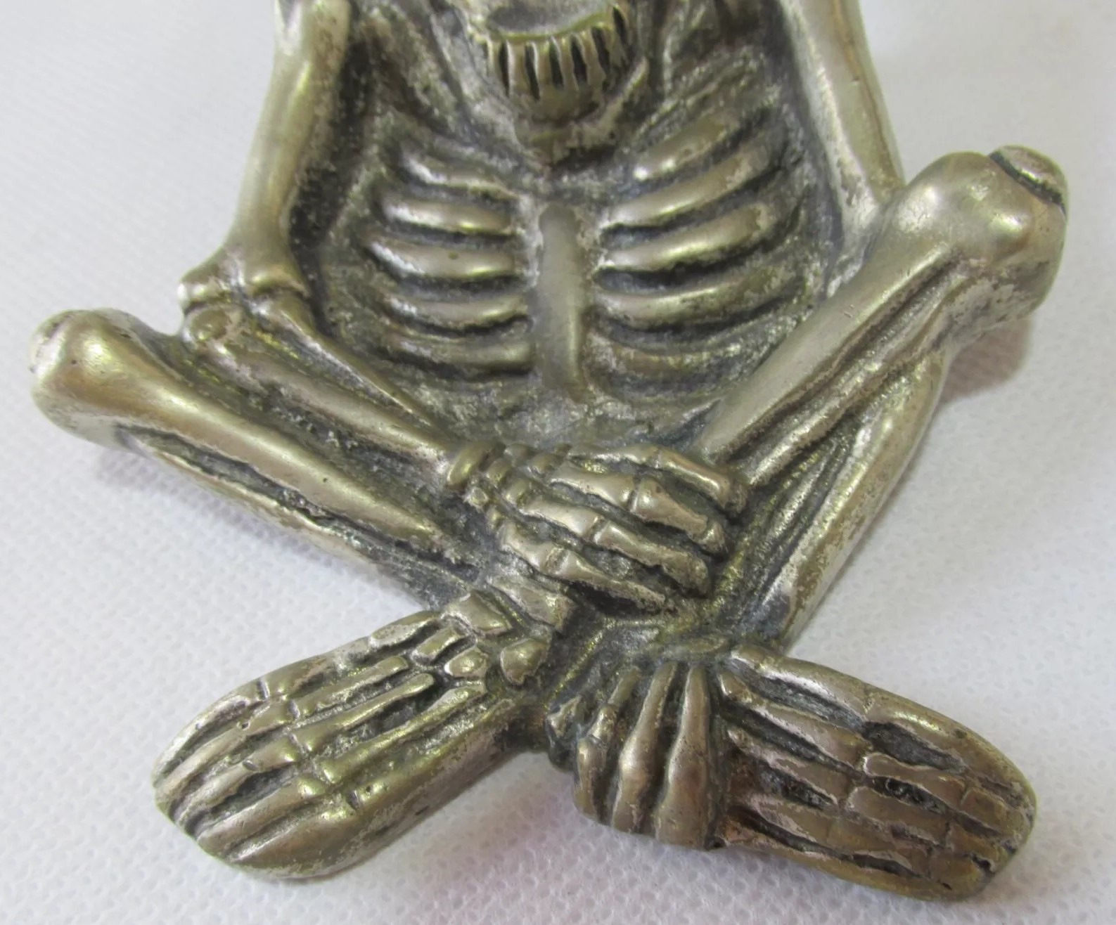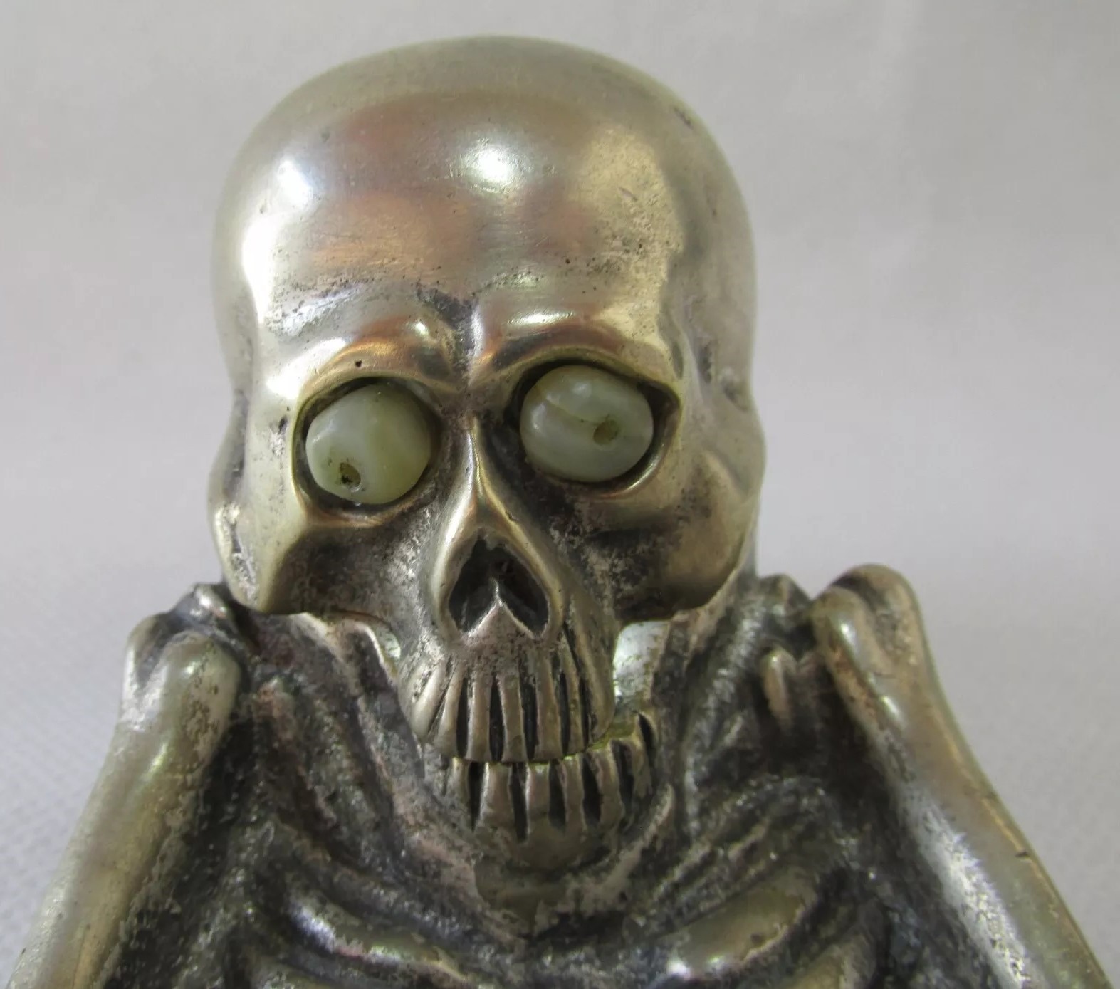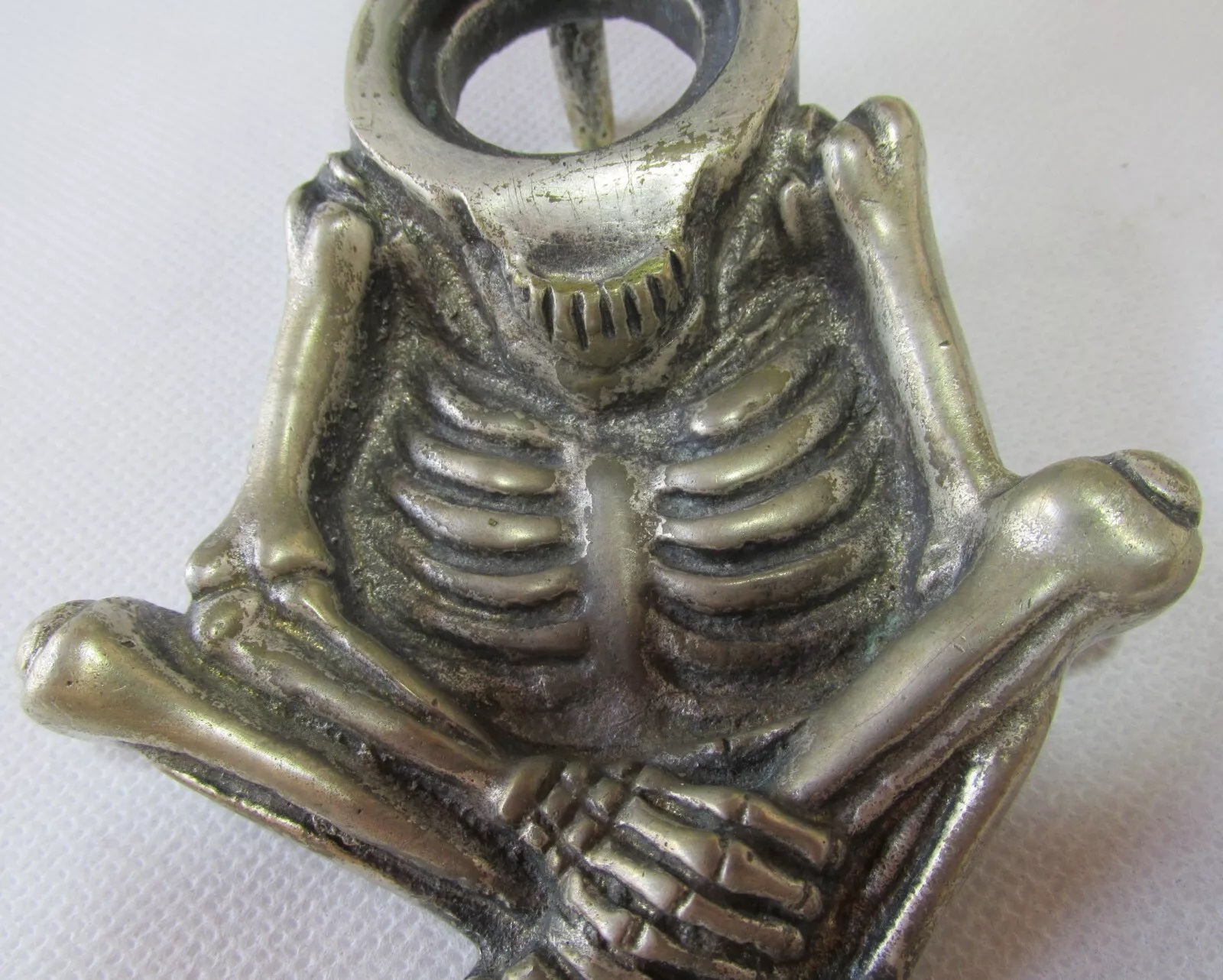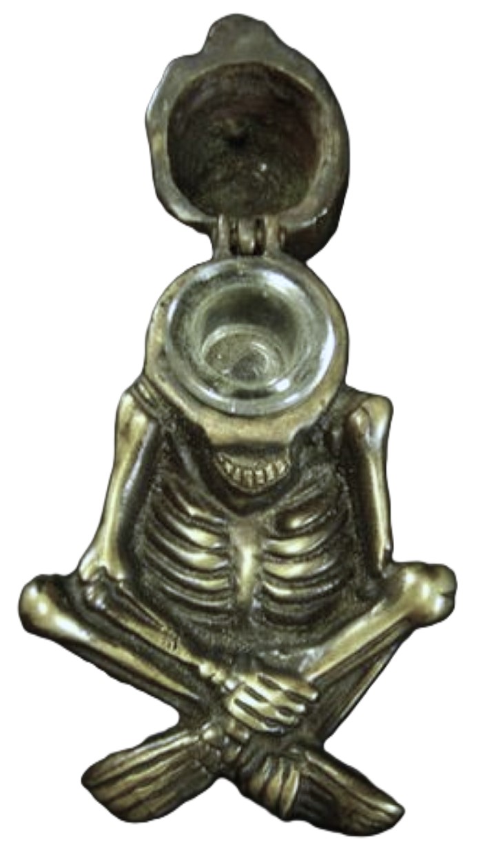 This figural inkwell features a skeleton seated with its knees bent upwards, creating a convenient space to rest a pen. The skull of the skeleton opens to reveal the inkwell inside.