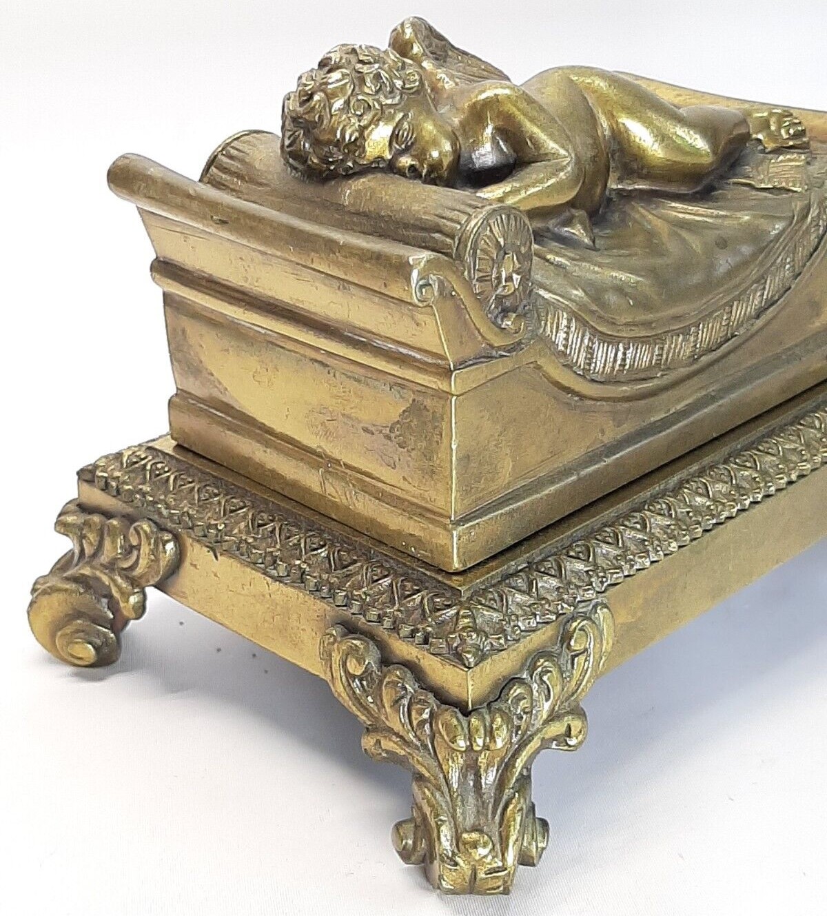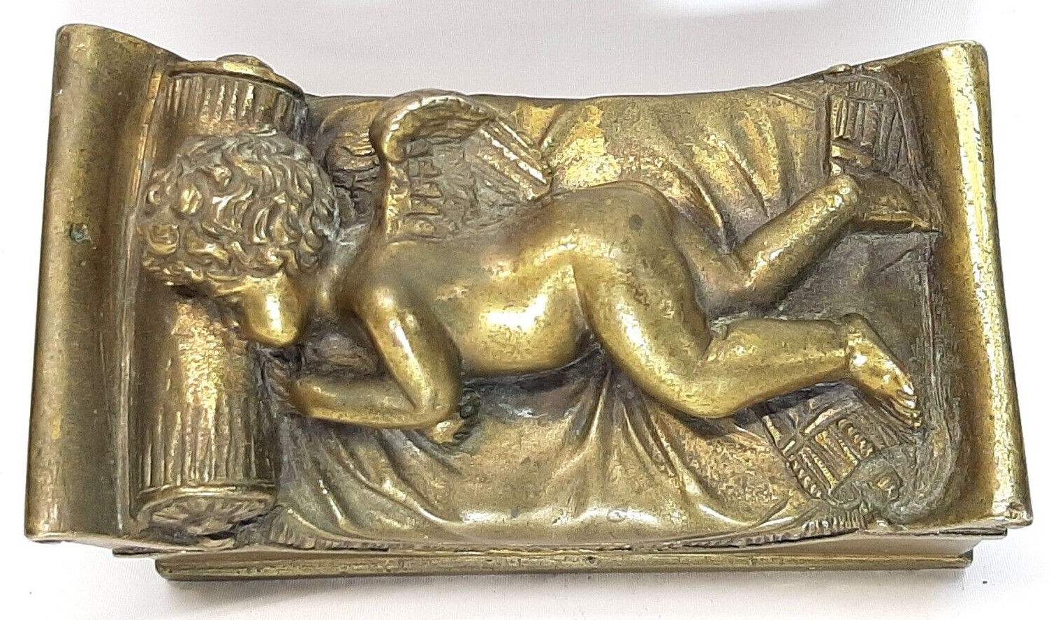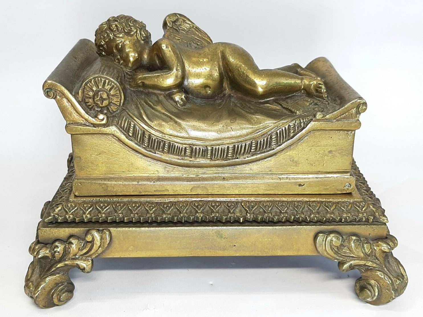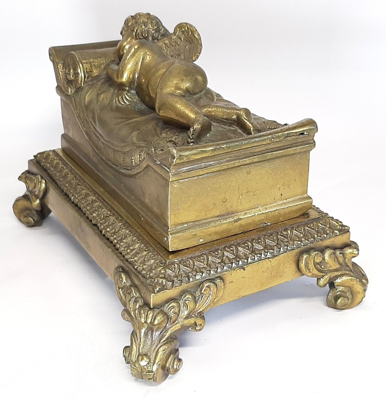 Detailed brass rendering of a sleeping cherub (angel, cupid, putto) – notice the curls in the hair and the folds in the blanket. The top piece with the resting cherub lifts off to access the inkwells (inserts missing).