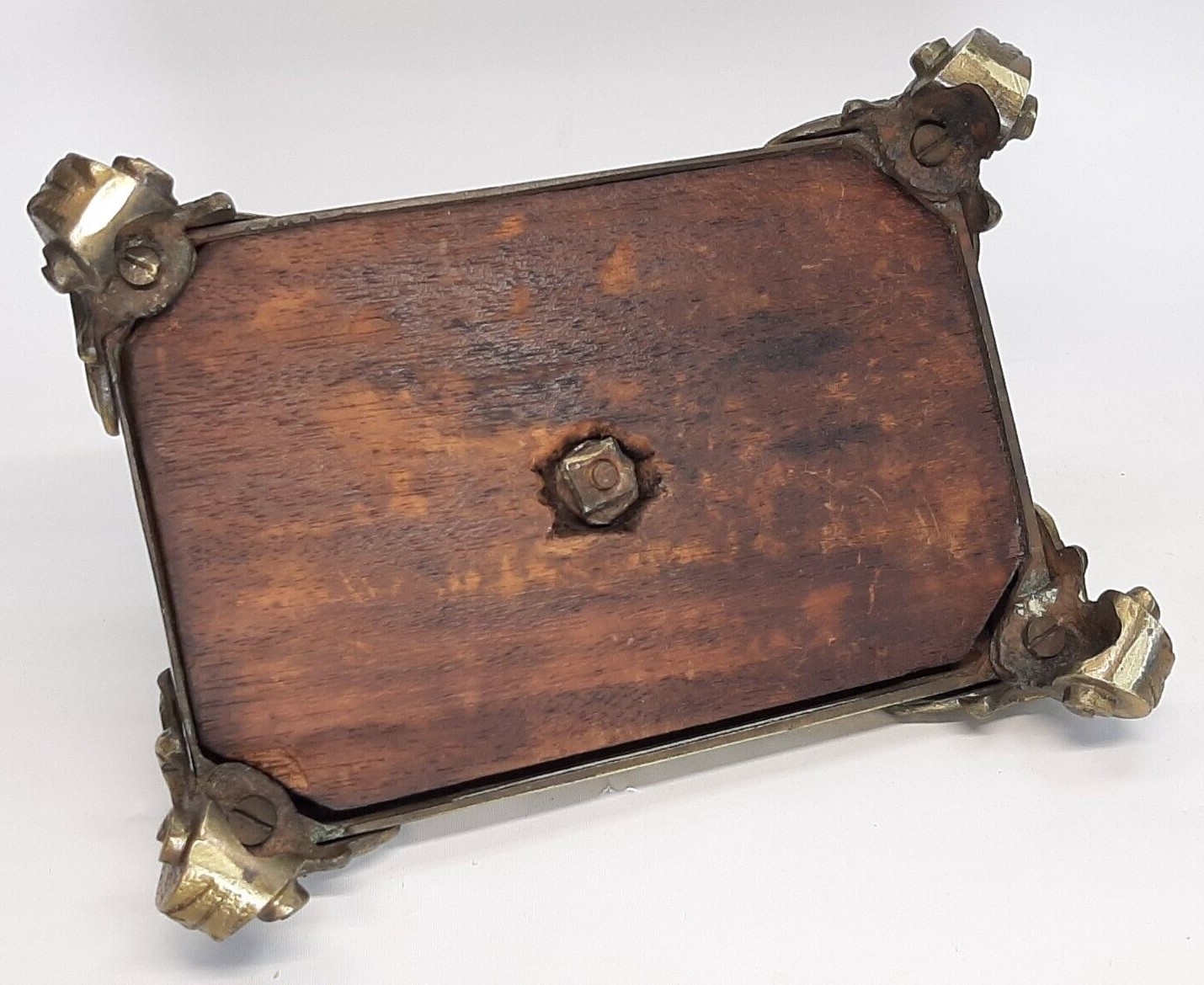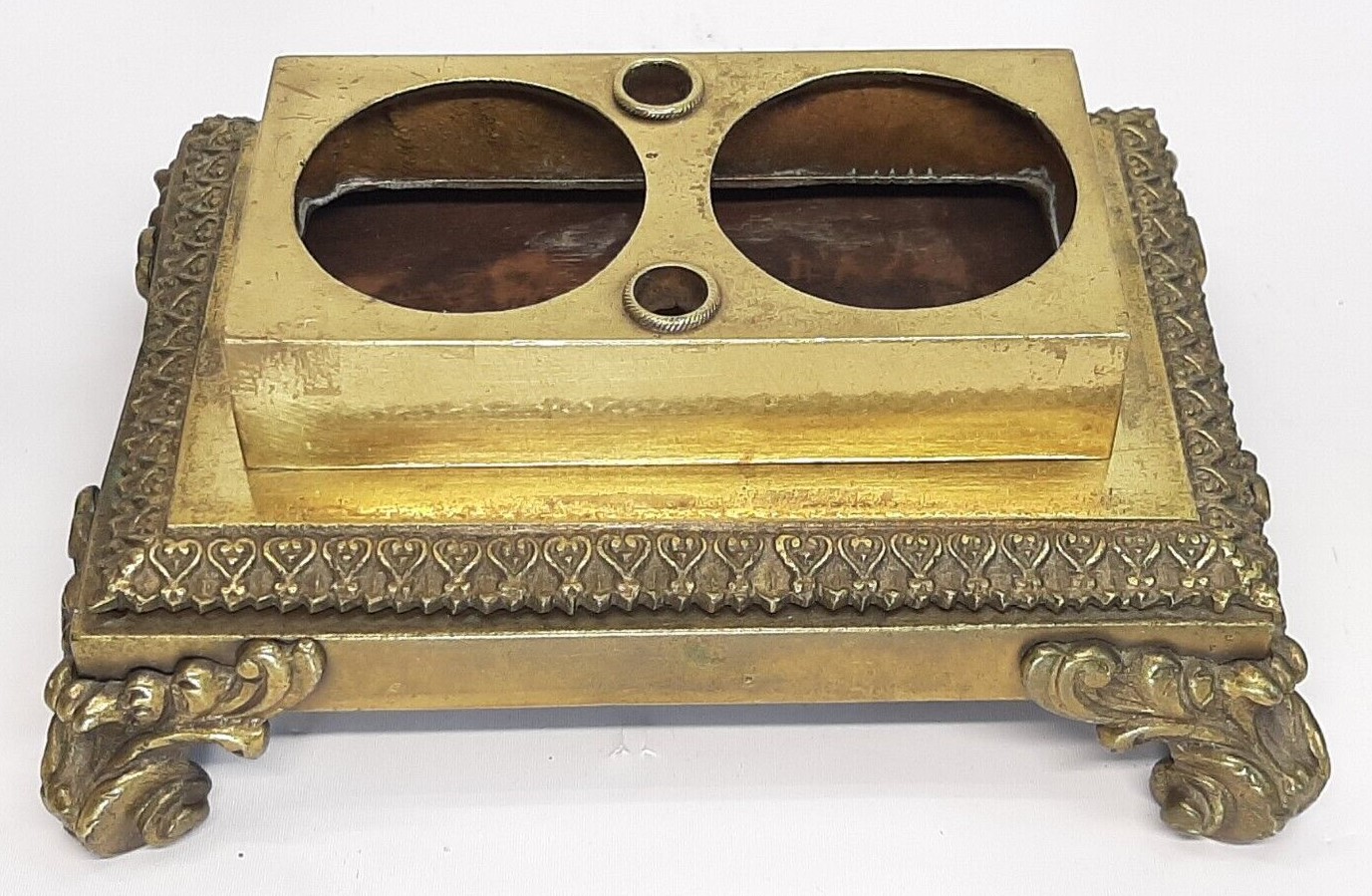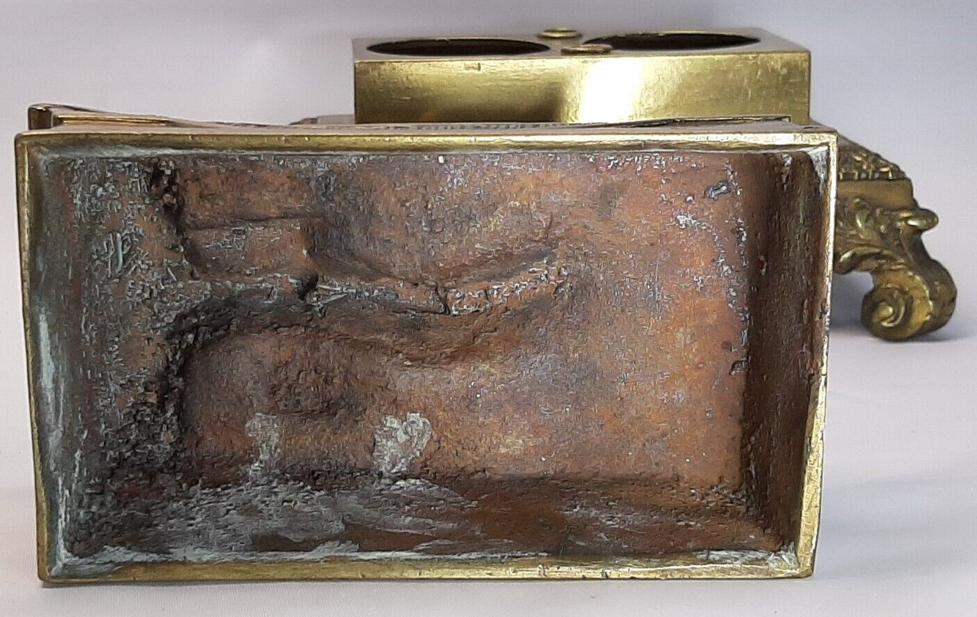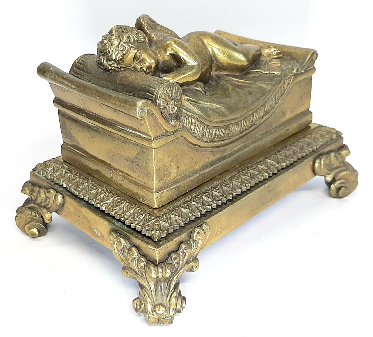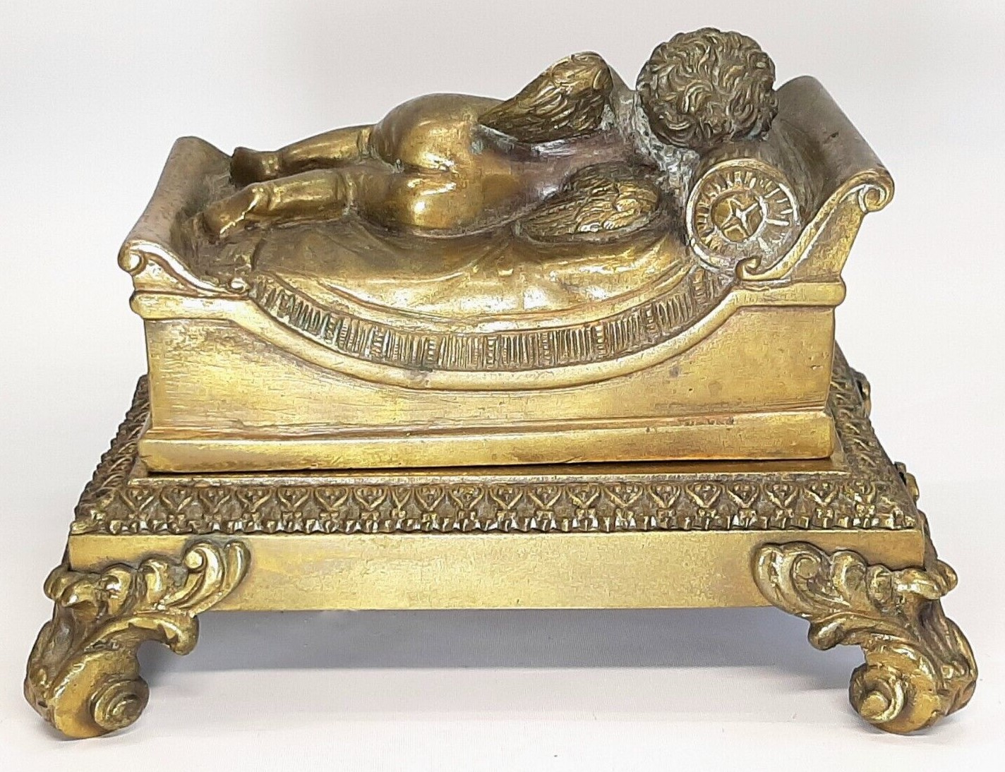Detailed brass rendering of a sleeping cherub (angel, cupid, putto) – notice the curls in the hair and the folds in the blanket. The top piece with the resting cherub lifts off to access the inkwells (inserts missing).