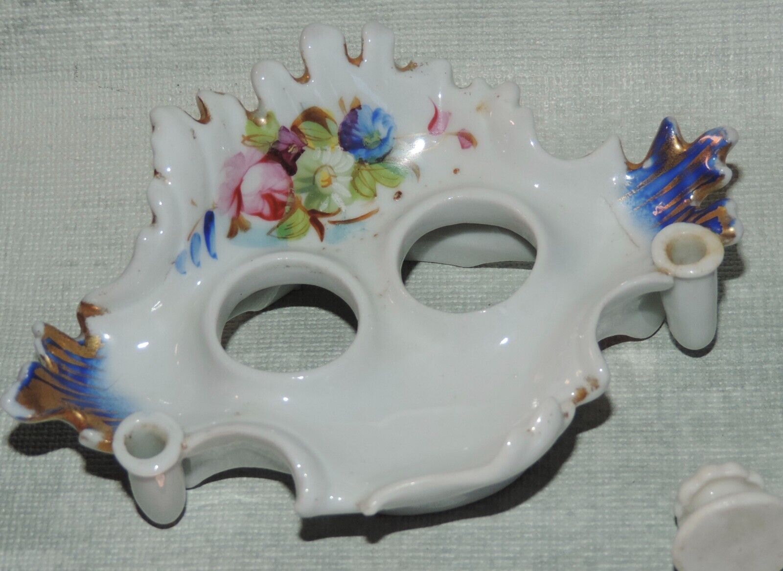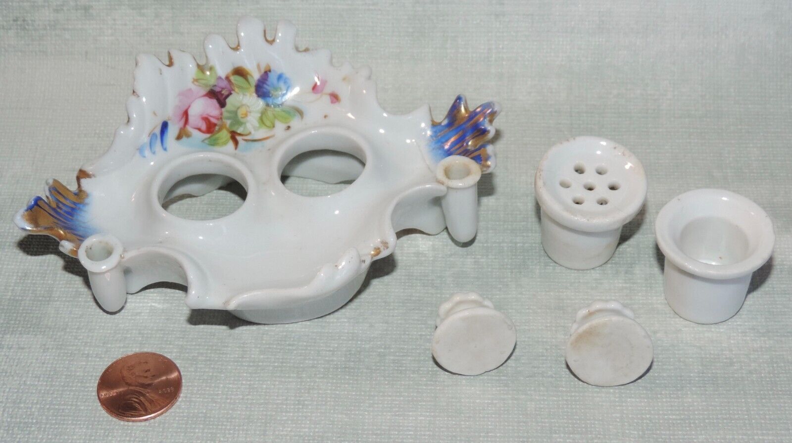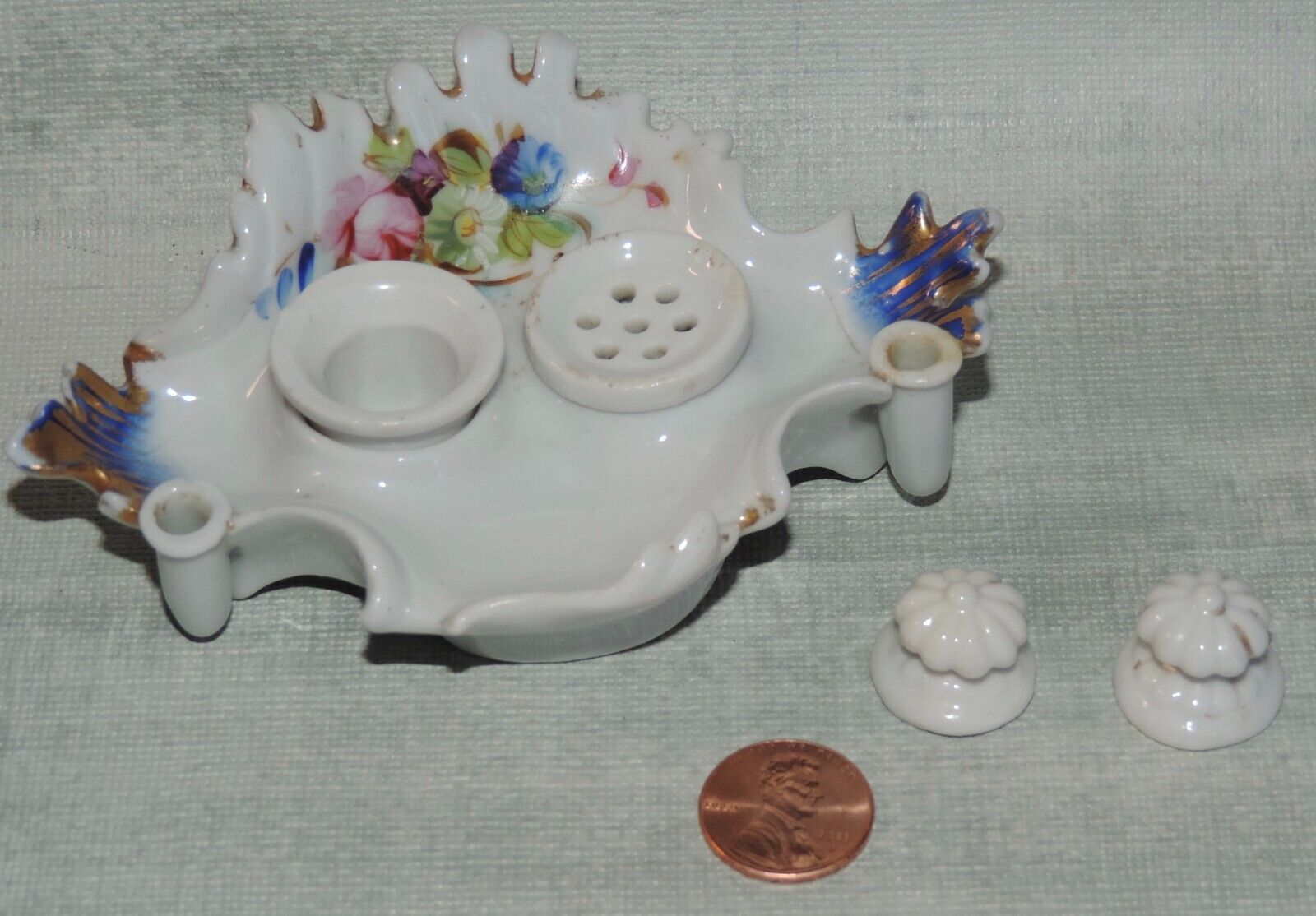 Small porcelain double inkstand with an inkwell and pounce pot with removable lids. Decorated with flowers and gold gilt, there are two pen holders in the front.