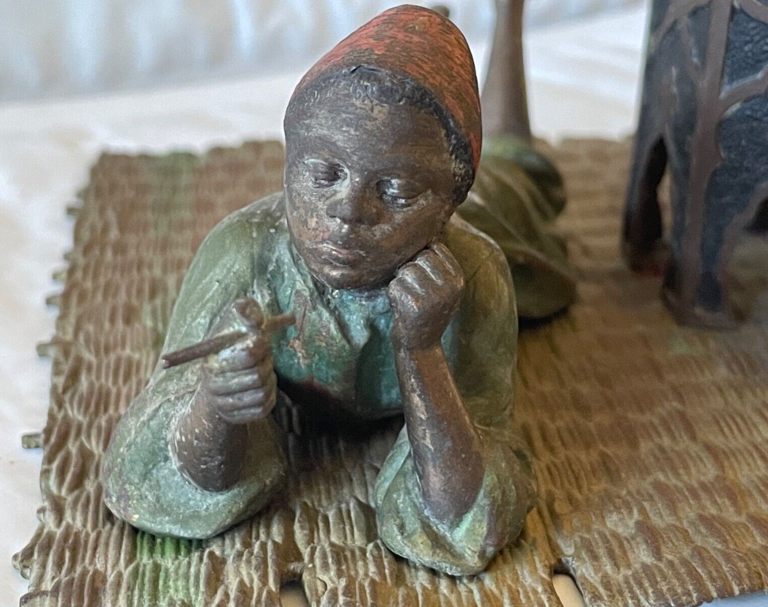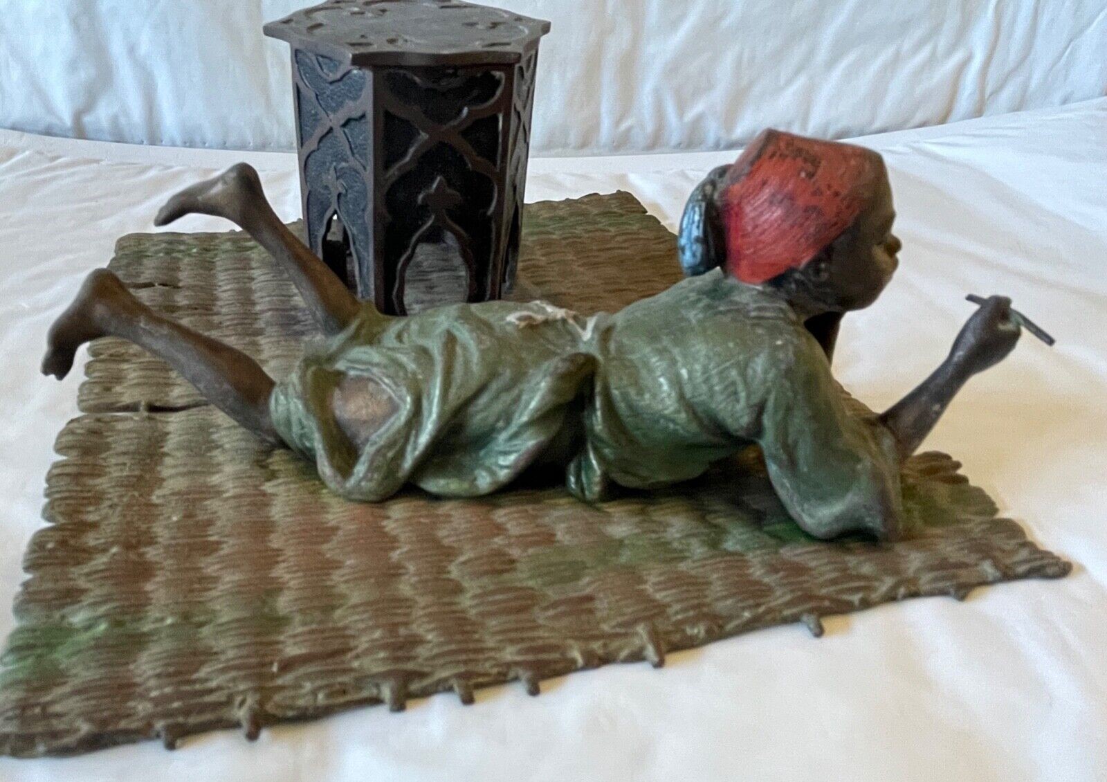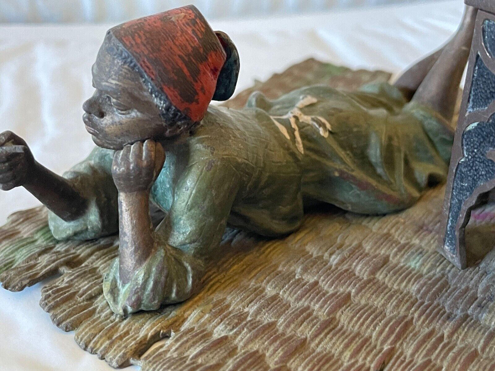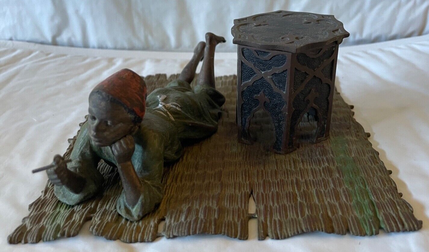 An Arab boy, lying prone on a wattled carpet, wears a fez and traditional Arab garments. He smokes a cigarette, his legs slightly raised in a relaxed manner. Next to him is a small table which holds the inkwell (missing insert). Cold painted white metal. Marked “Austria”.