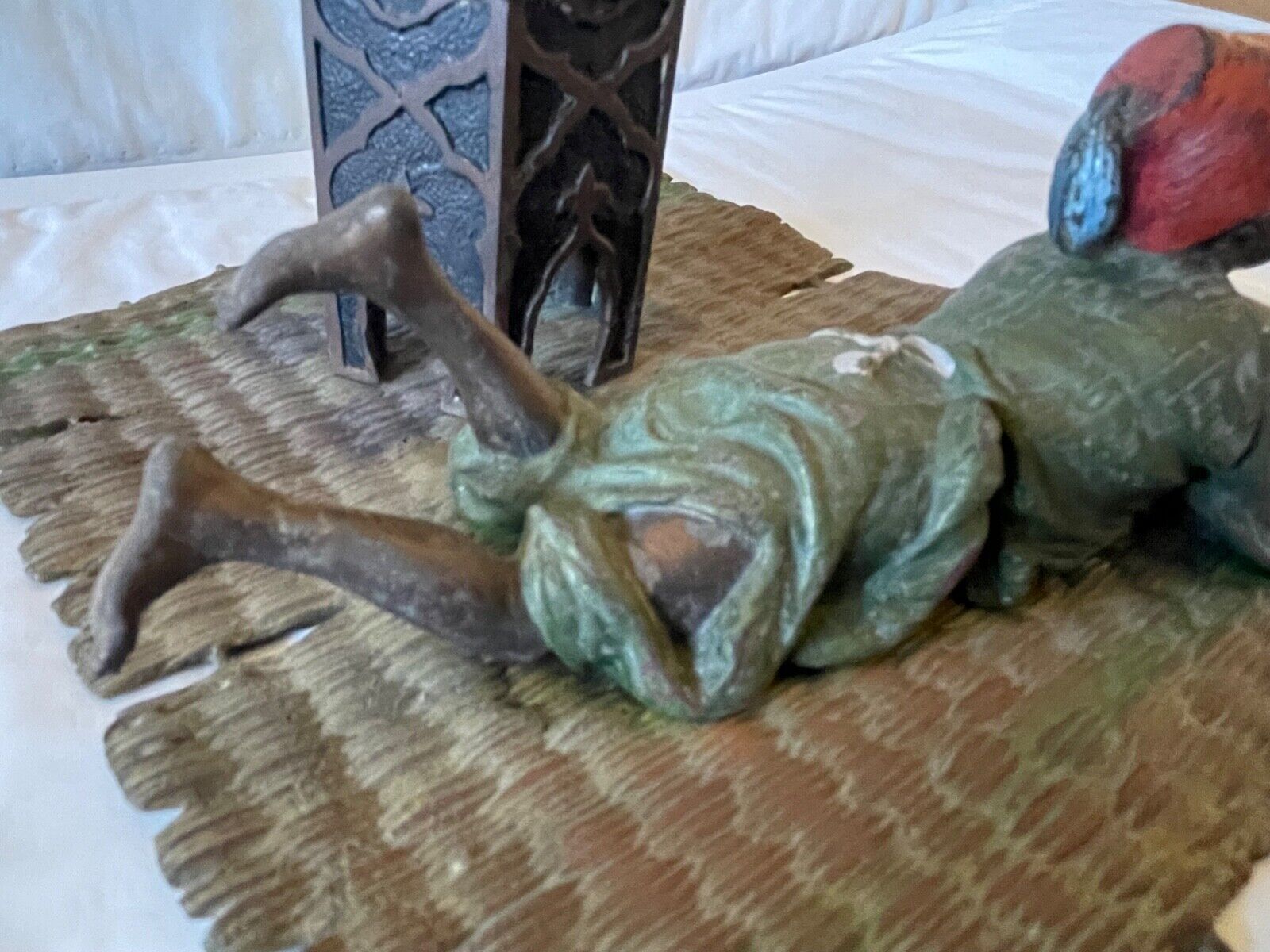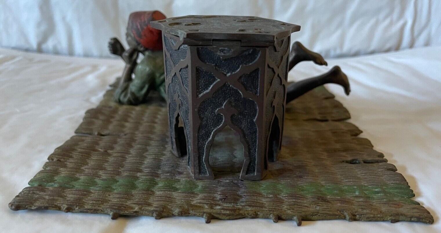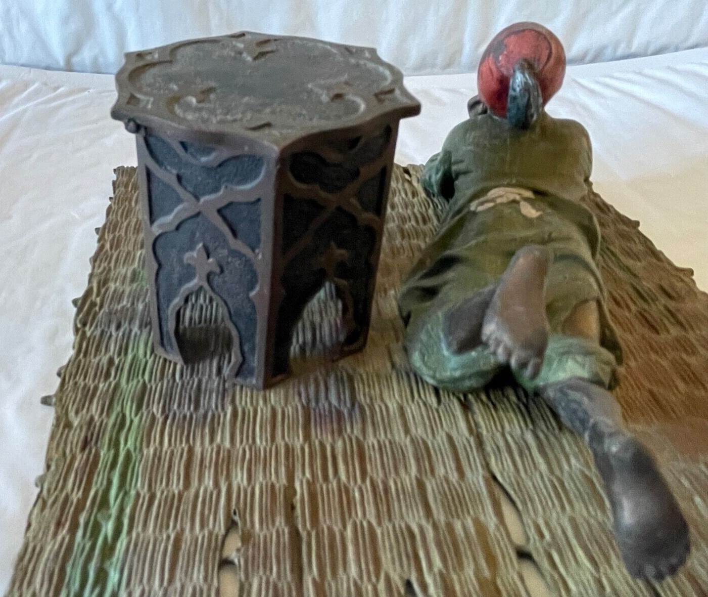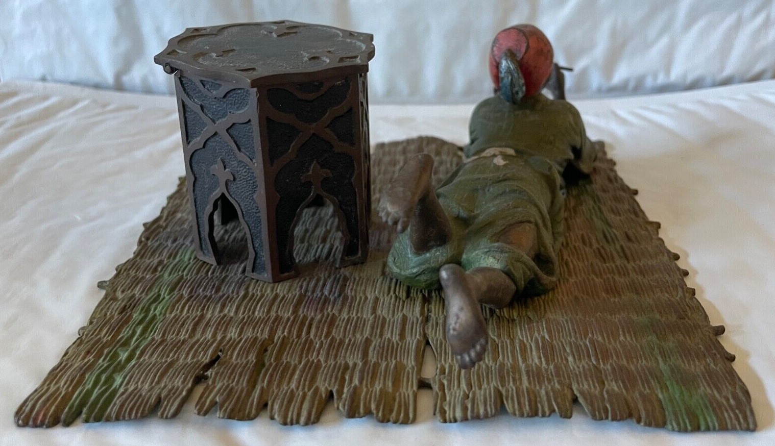 An Arab boy, lying prone on a wattled carpet, wears a fez and traditional Arab garments. He smokes a cigarette, his legs slightly raised in a relaxed manner. Next to him is a small table which holds the inkwell (missing insert). Cold painted white metal. Marked “Austria”.